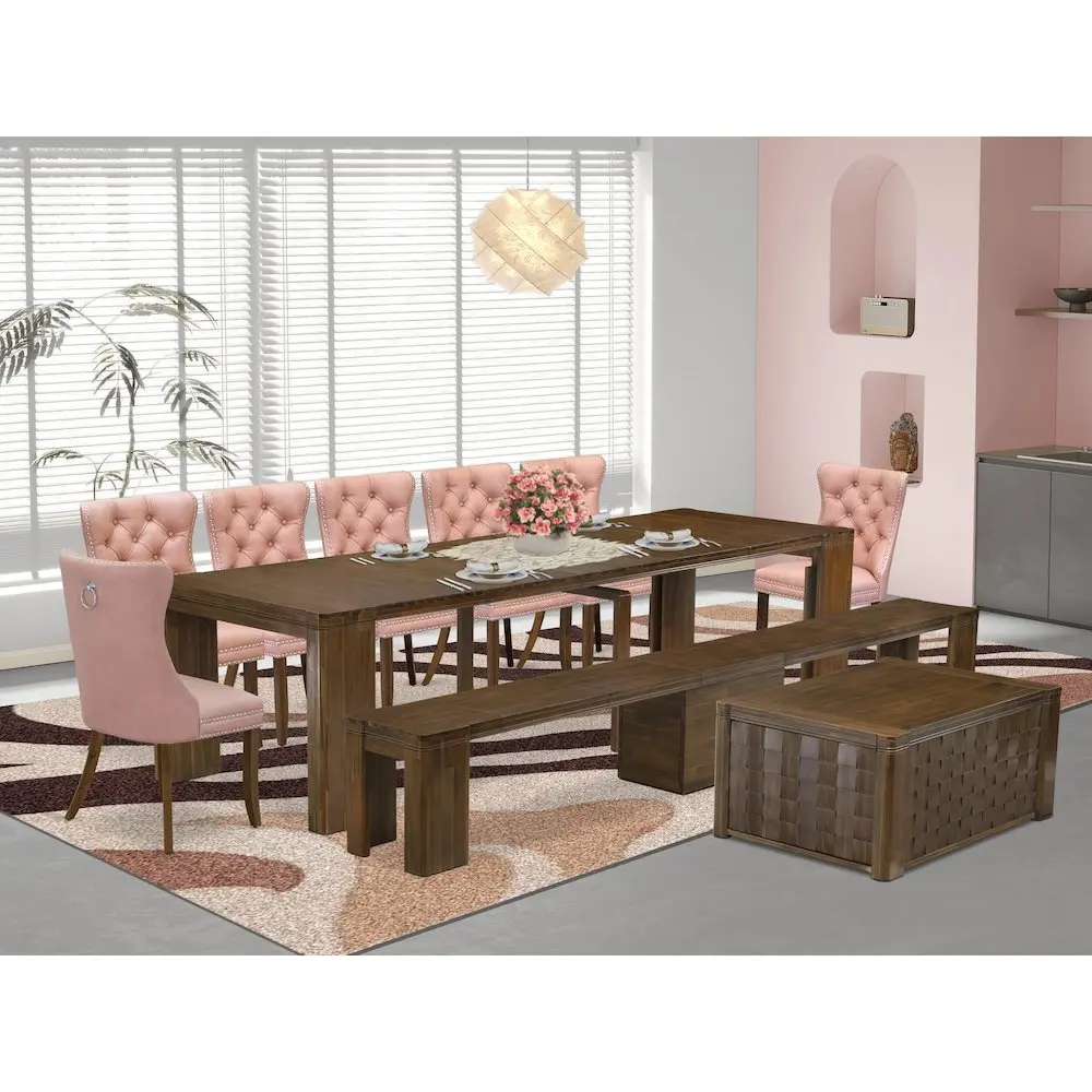Our 10-piece expandable dining set is meticulously designed to effortlessly adapt to various settings. It comprises 7 dining chairs, 1 coffee table, 1 extendable dining bench, and an expandable dining table. This adaptability ensures you can customize your seating and table layout to precisely suit your needs. The extendable table showcases an elegant Antique Walnut tabletop and legs, mirroring the Antique Walnut finish found on the coffee tables. The dining chairs provide comfortable seating, adorned with Burgundy Faux Leather upholstery, complemented by matching Antique Walnut legs. The bench seats maintain the classic Antique Walnut finish. This meticulously fashioned extendable dining set is skillfully hewn from robust Acacia hardwood, guaranteeing years of reliable performance. These exceptional features combine to create a dining set celebrated for its enduring excellence and distinctive visual charm. Resilient Acacia hardwood not only assures durability but also preserves its unique and attractive aesthetics over time. The parson dining chairs, featuring Faux Leather seats, infuse sophistication into your dining area while simplifying the cleaning process.