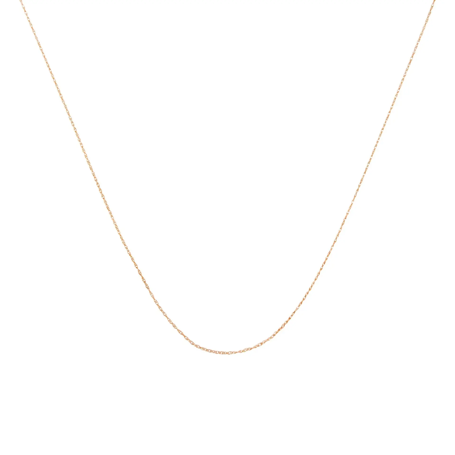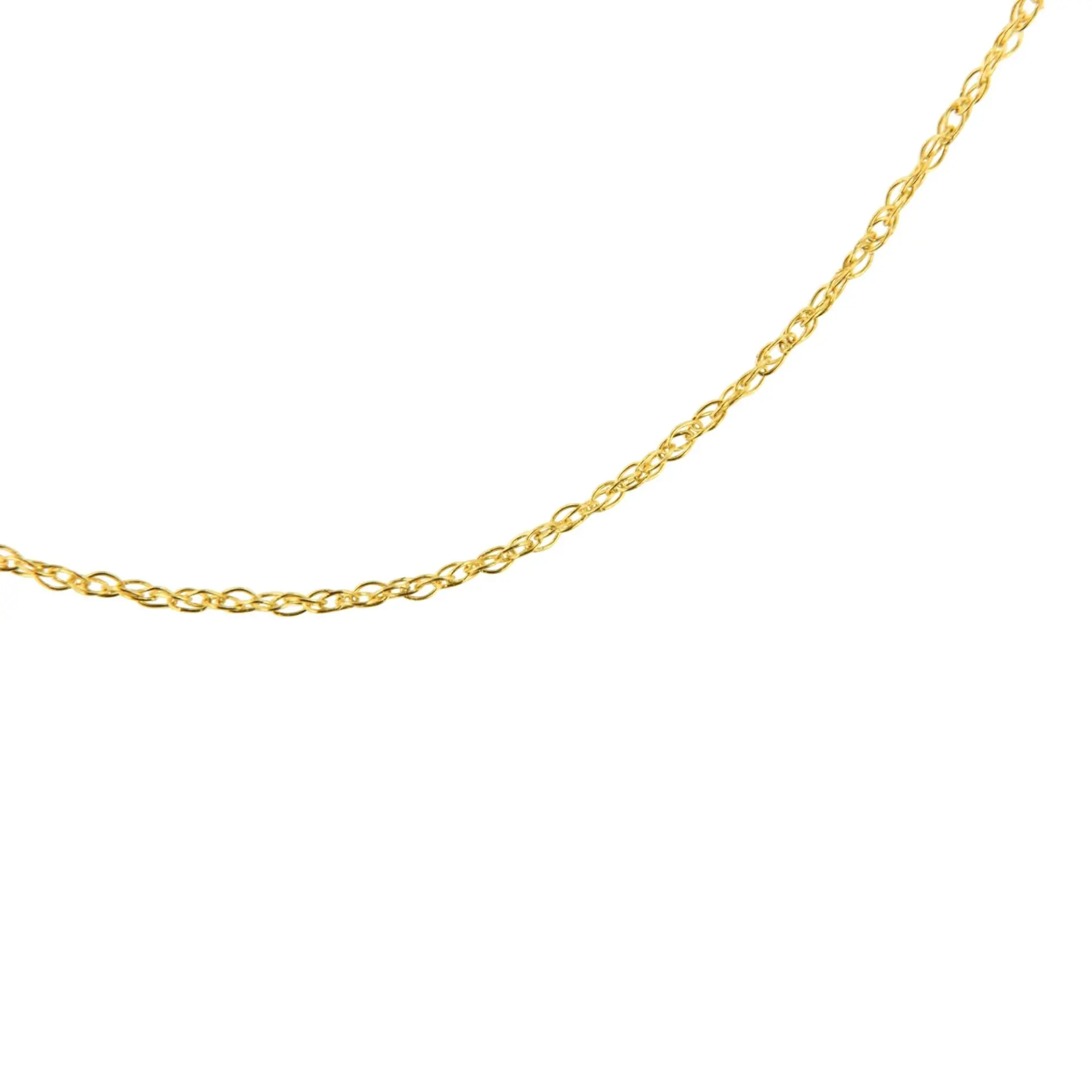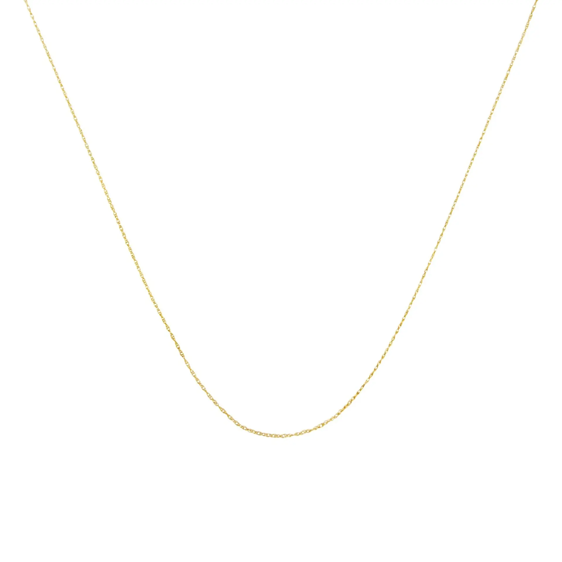 Presenting a feminine classic: a simple and dainty 10K yellow gold rope chain, available in your choice of 16, 18 or 20 inches. This thin, 1/2-millimeter wide chain fastens securely with a standard spring ring clasp. It can replace most chains and is perfect paired with small to medium size pendants. Please keep in mind this chain is slender and delicate, best used for smaller/lighter pendants. Not recommended for heavy pendants.