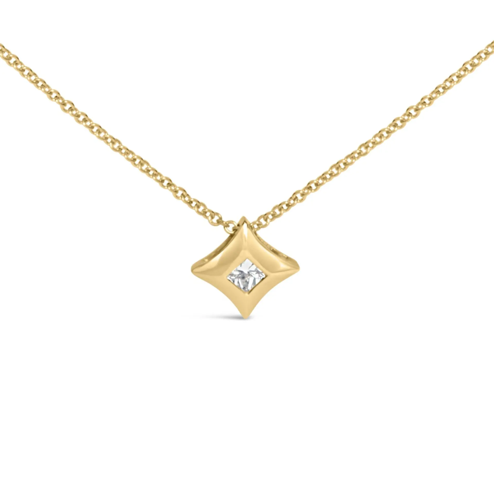 Embody the essence of sophistication with this enchanting kite-shaped pendant necklace, expertly forged in lustrous 10K yellow gold. This masterpiece is highlighted by a trio of princess-cut diamonds, meticulously arranged in a modern bezel setting that magnifies their natural brilliance and stature. Suspended from an 18-inch rolo chain, secure with a reliable lobster claw clasp, this creation is interspersed with six elegantly bezel-set round diamonds, each station invoking a sparkle that catches the eye and captivates the heart. With diamonds boasting an H-I color and SI2-I1 clarity, each stone speaks to a commitment to quality and natural origin, ensuring that this necklace isn’t just an accessory but a treasure that enhances every moment and outfit with a touch of magic and an air of regality.