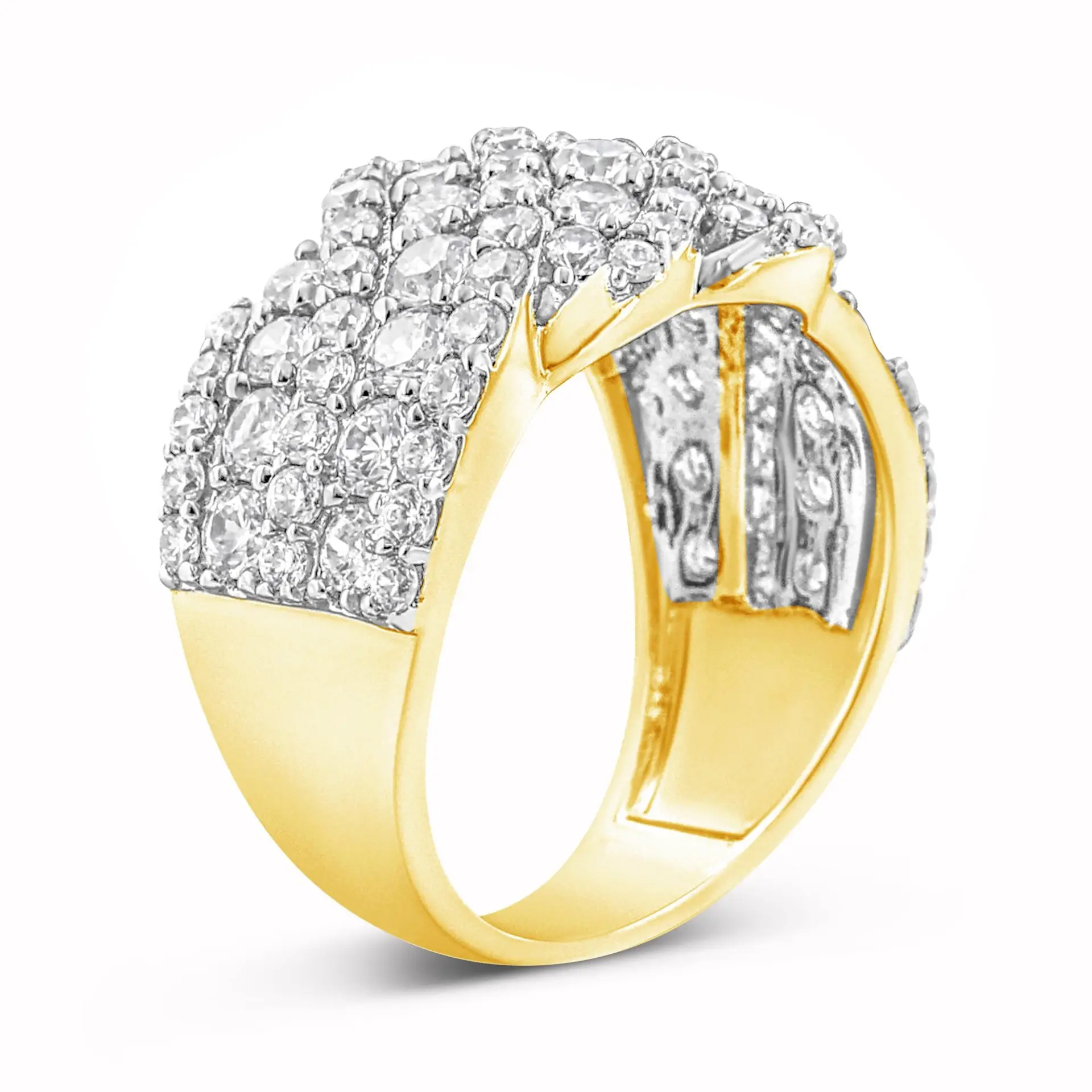 Introducing a mesmerizing masterpiece that will captivate all who lay eyes upon it. Crafted in lustrous 10K yellow gold, this exquisite band ring boasts an extraordinary 3.00 cttw of dazzling diamonds. With 95 round diamonds delicately placed in a multi-row design, this ring is a true testament to elegance and sophistication. The natural diamonds, with a mesmerizing I-J color, sparkle brilliantly, while the prong setting ensures their secure placement. Designed for women who appreciate the finer things in life, this ring is available in a size 8. Immerse yourself in the allure of this remarkable piece and let its radiant beauty adorn your finger.