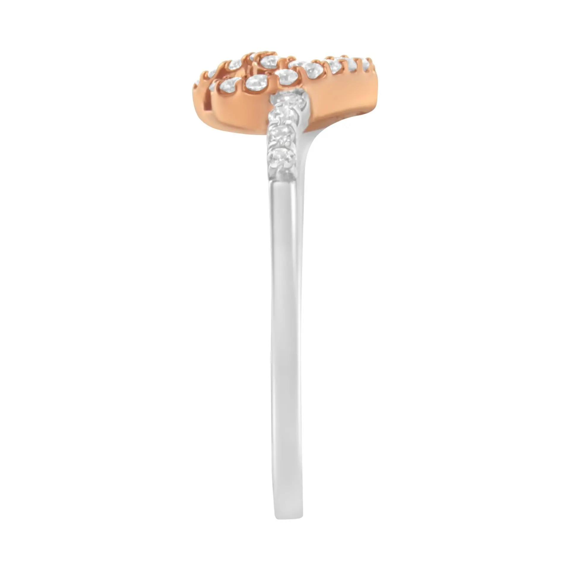 Make a statement with this dazzling two toned heart ring. Elegant and timeless, this cocktail ring features flared, flat style band made of .925 sterling silver that cradles an open heart shape made of sterling silver coated with 10K rose gold. The face of the band and the heart shape are inset with round, brilliant cut diamonds in prong settings. The fashion ring features a whopping 31 white diamonds. It has a high shine, polished finish. This authentic design is crafted of real 92.5% sterling silver that has been electro-coated with genuine 10K rose gold, ensuring it will keep a tarnish-free shine for years to come. This ring makes a great engagement ring, anniversary ring, promise ring, or statement ring, as well as a great gift for those with April birthdays! Diamonds are thought to give the wearer clarity and illuminate solutions to lifes problems, as well as encouraging abundance, strength, courage, harmony, faithfulness, and commitment. Give her a gift that will last forever.