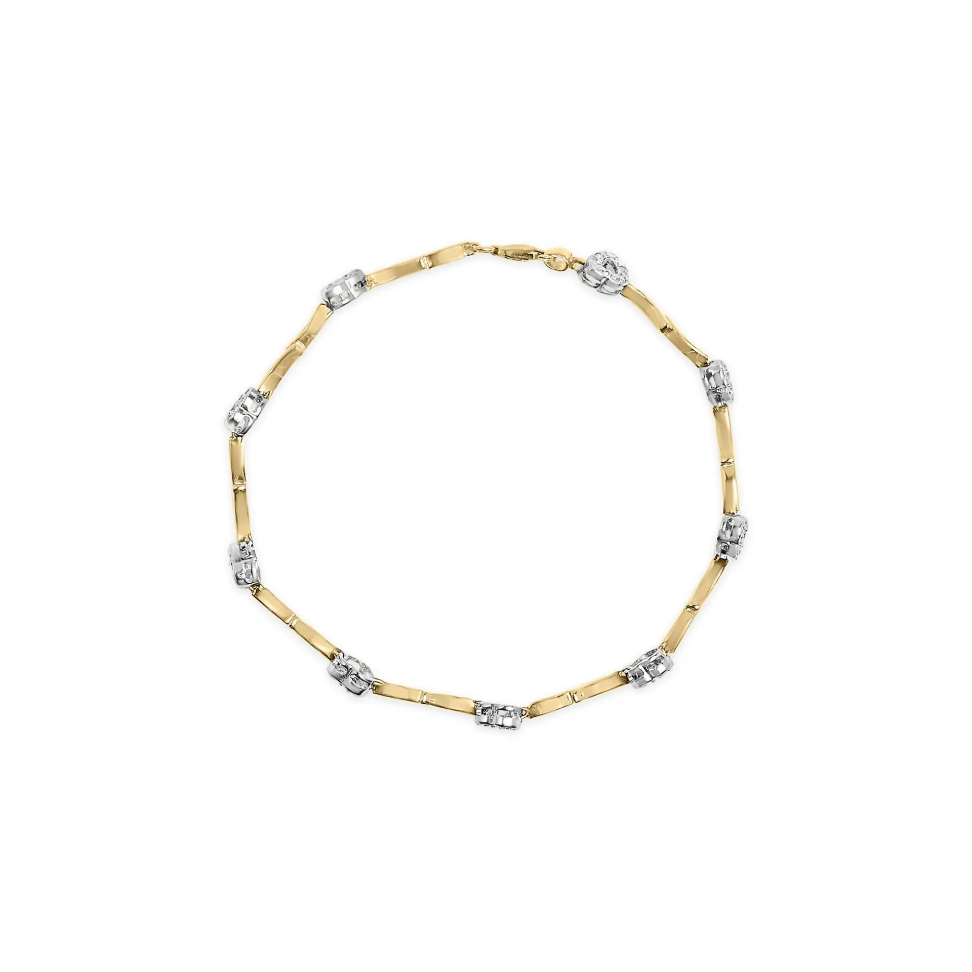 Embrace the allure of eternal love with this captivating two-tone gold diamond heart S-link bracelet. Exquisitely crafted in 10K two-tone gold, this enchanting piece is adorned with 45 natural round diamonds, boasting a total weight of 1/3 carat. These diamonds, with their I-J color, exude a delicate and timeless charm, while their I2-I3 clarity ensures a mesmerizing brilliance that catches the eye. Each diamond is meticulously set in a secure prong setting, allowing the light to dance off their facets with every movement. The bracelet’s 7.25-inch length gracefully encircles your wrist, while the sturdy lobster claw clasp ensures a comfortable and secure fit. The design showcases a delicate interplay of hearts and S-links, symbolizing eternal love and connection. This diamond bracelet is a perfect accessory for women seeking to celebrate their femininity and cherish the joy of love. Whether it’s a special occasion or a daily reminder of affection, this radiant bracelet is a must-have addition to your jewelry collection.