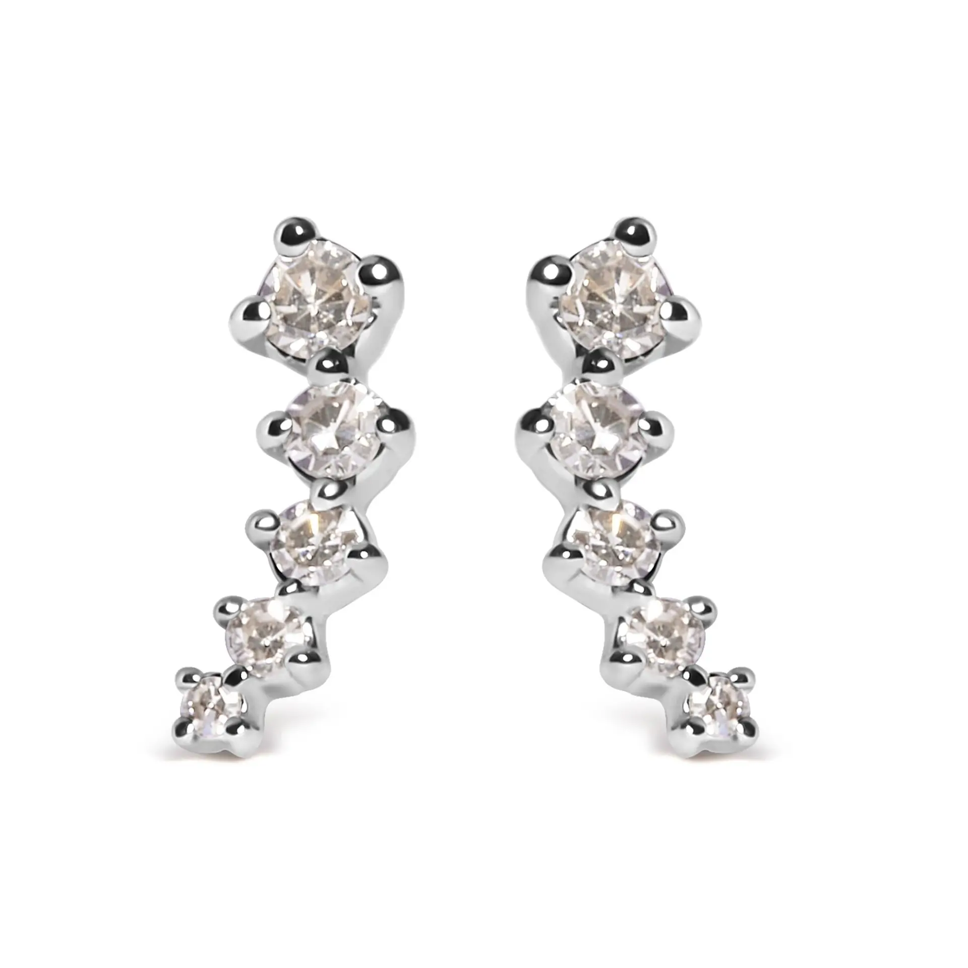 Introducing our exquisite 10K White Gold Climber Stud Earrings, a dazzling journey of elegance and style. Crafted with precision in mind, these earrings feature a total of 10 natural round diamonds, totaling 1/10 cttw. The diamonds, boasting a stunning H-I color, are expertly set in a prong setting, ensuring maximum brilliance and sparkle. With a captivating climber earring design, these earrings gracefully ascend your earlobe, creating a mesmerizing and unique look. The push back earring findings provide a secure and comfortable fit, making them perfect for everyday wear or special occasions. Indulge in the beauty of these earrings and let their radiant diamonds illuminate your style. Perfect for women who appreciate sophistication and desire to make a lasting impression.