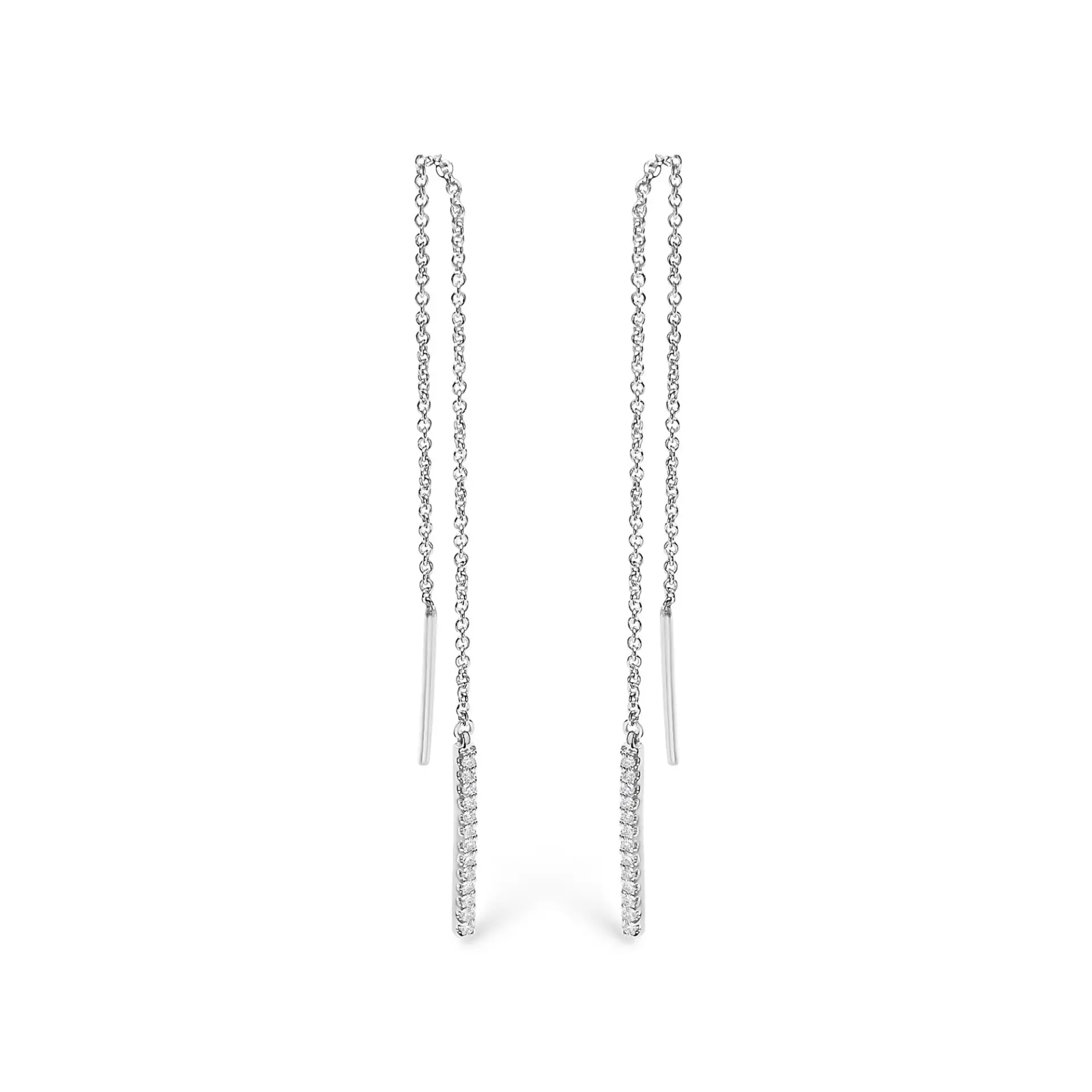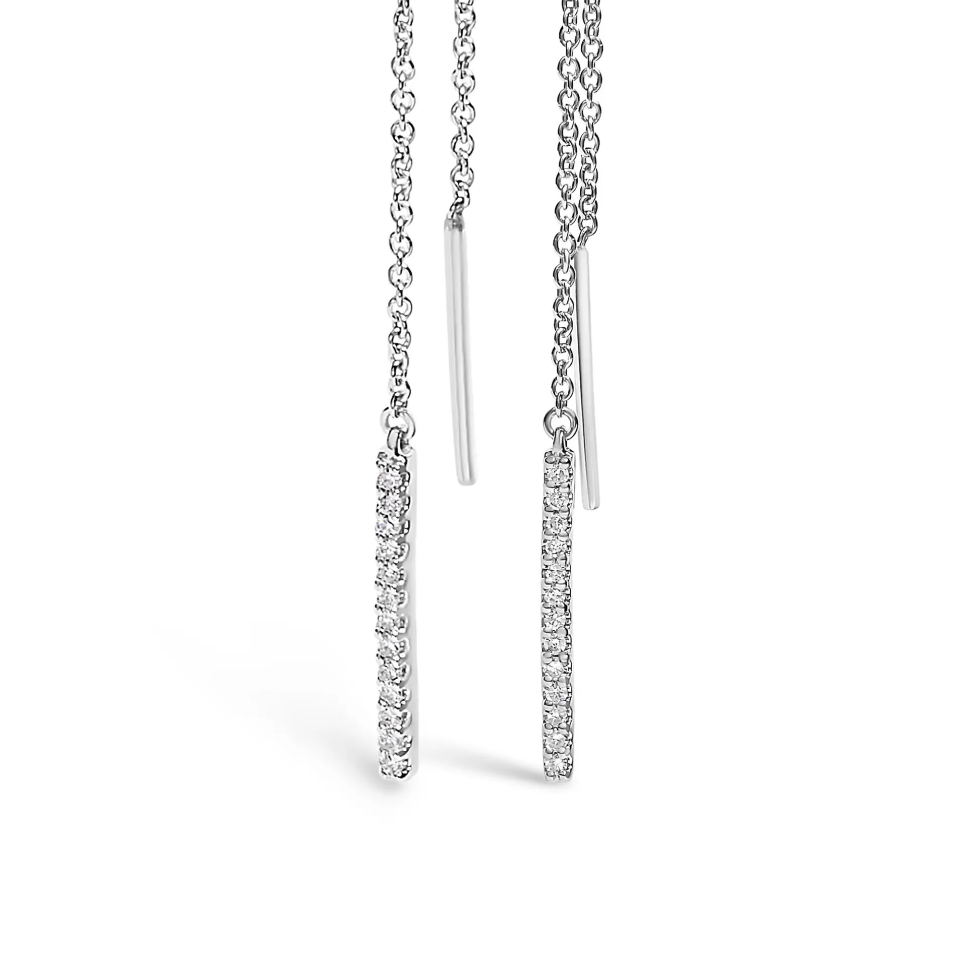 Discover the serene elegance of these 10K white gold threader earrings, where sophistication meets modern design. Each piece invites the light to dance along its rhodium-plated, exquisite elongated chain that smoothly threads through the ear, promising both comfort and a secure fit. Artfully placed along the lower bar, natural diamonds totaling 1/10 carat catch the eye with their gentle shimmer. Graded I-J for color and I1-I2 for clarity, these gems reflect not just light but the depth of your exquisite taste. Perfect for a delicate touch of luxury, these earrings offer a timeless sparkle meant to be cherished and admired in every fleeting moment.