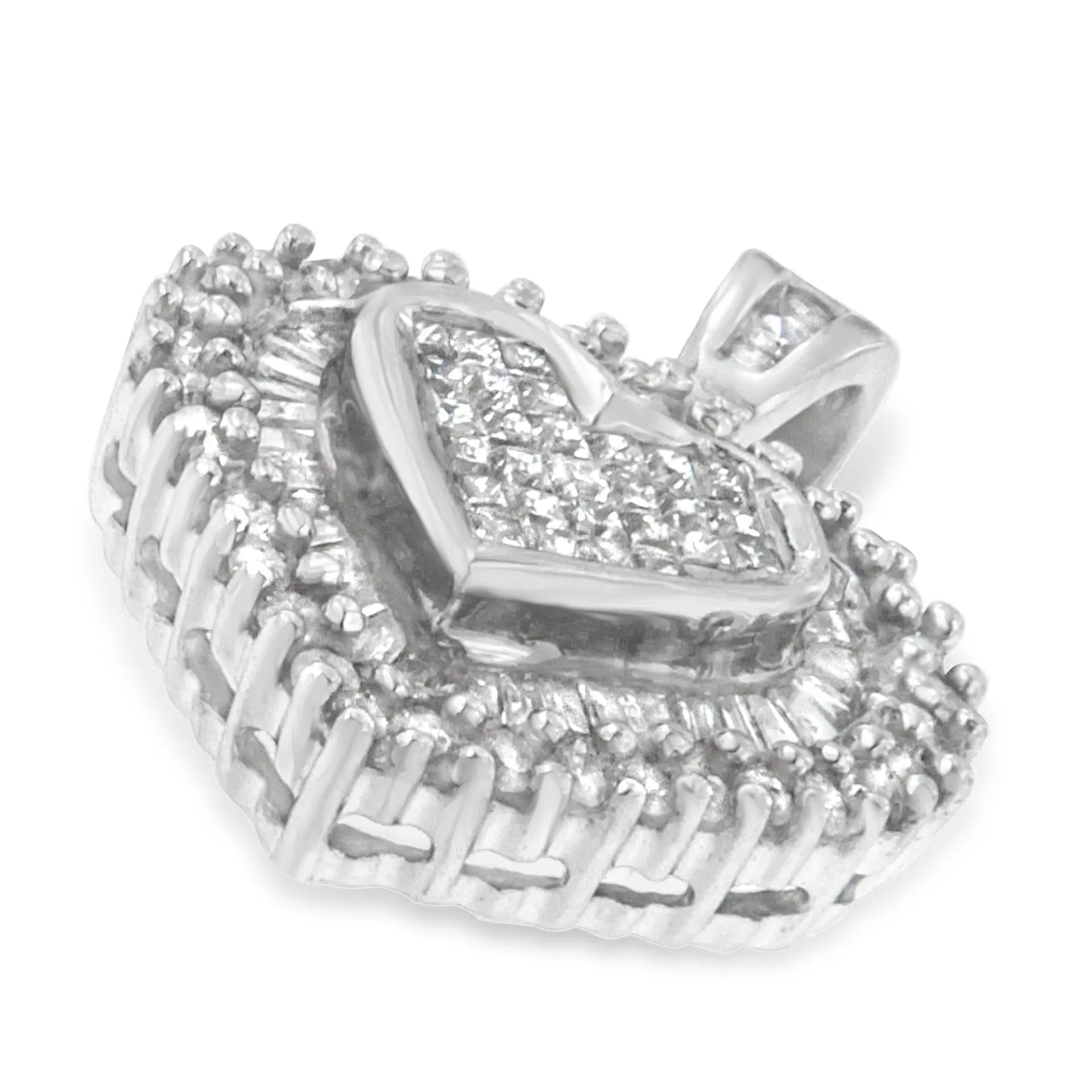 Let your love life touch the new heights of romance by giving her this beautiful diamond heart pendant. Encrusted with pave-set diamonds in multi-cuts the polished pendant is covered with white diamonds, which are princess, baguette, and round. Further, the ten karats white gold is graceful and glossy that will lend a versatile look over this startling necklace.