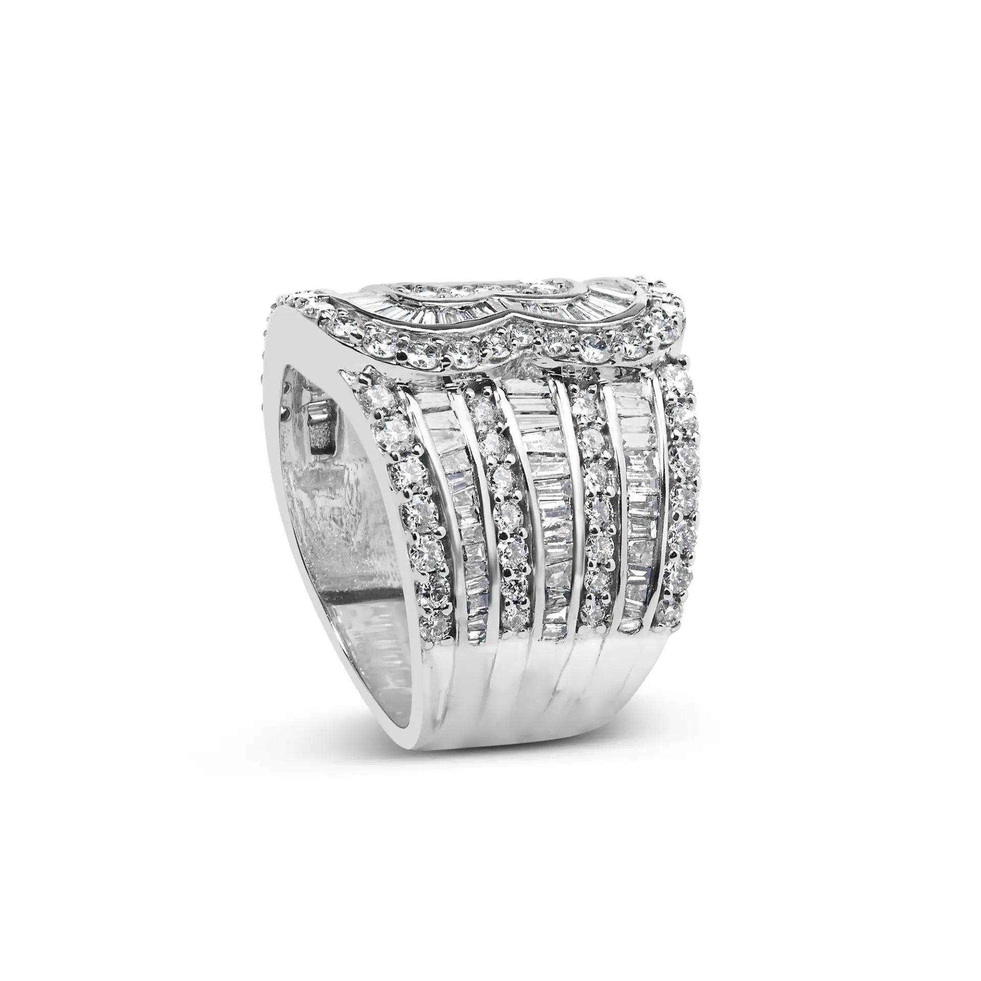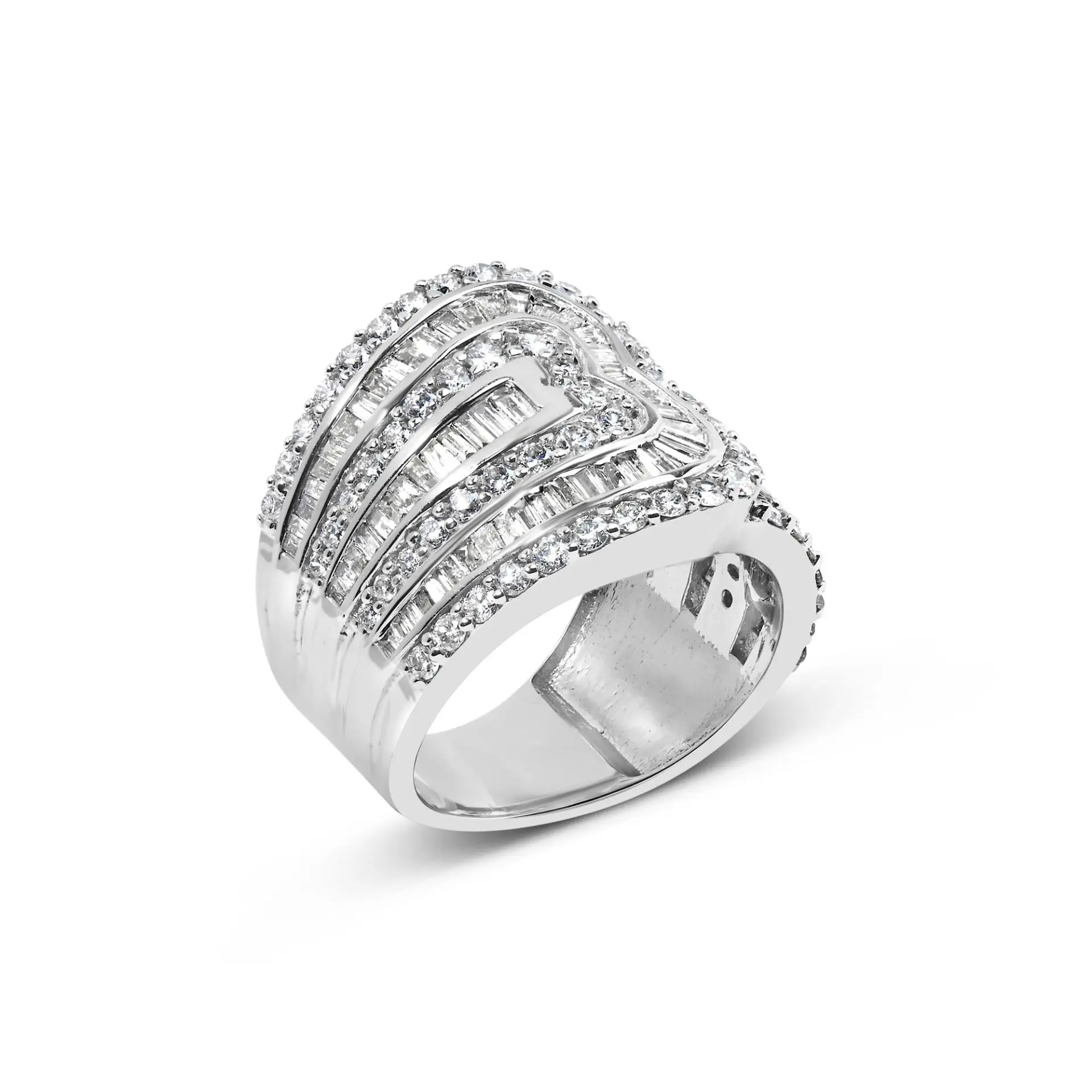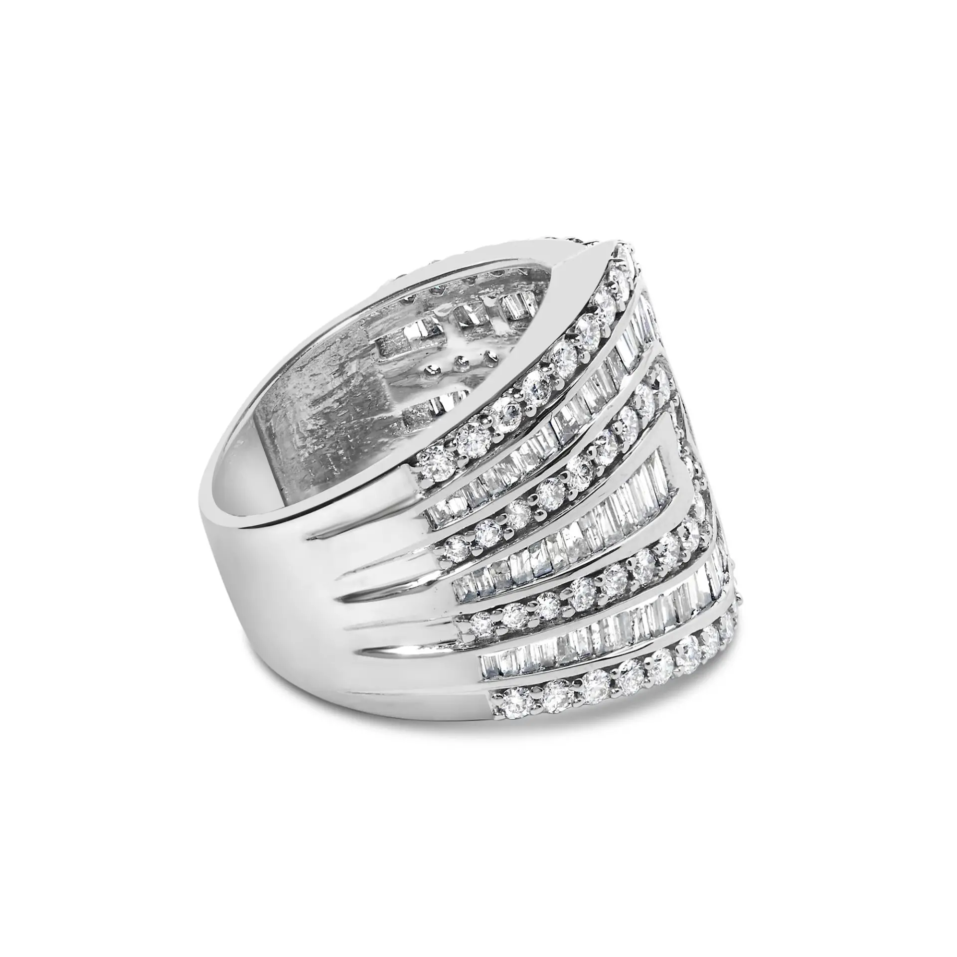 Bold and brilliant, this magnificent cluster diamond ring has an impressive total carat weight of 2 1/2 c.t. This piece is crafted in genuine 10k White Gold, a metal that will stay tarnish free for years to come. The ring shines with alternating rows of natural round and baguette-cut diamonds, in an overlapping bypass design. You will love how this piece shines on your finger and catches the eye of every onlooker!