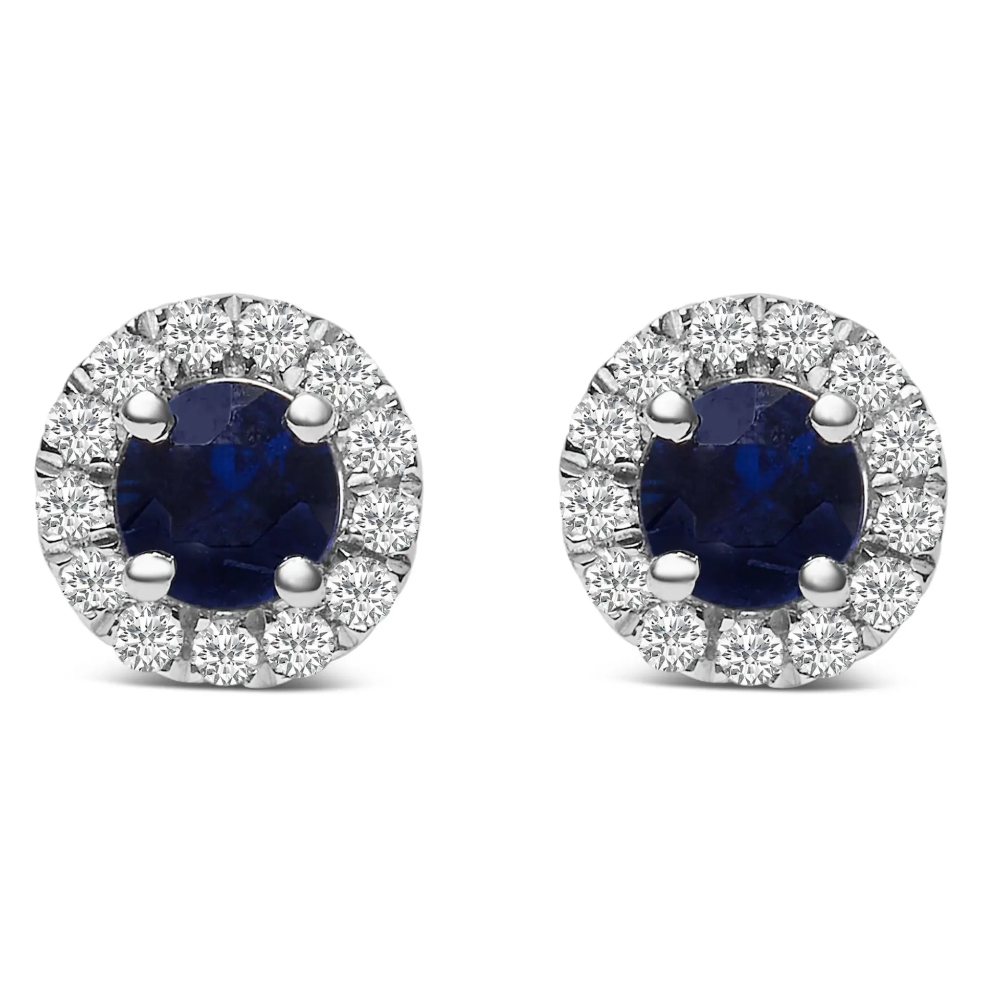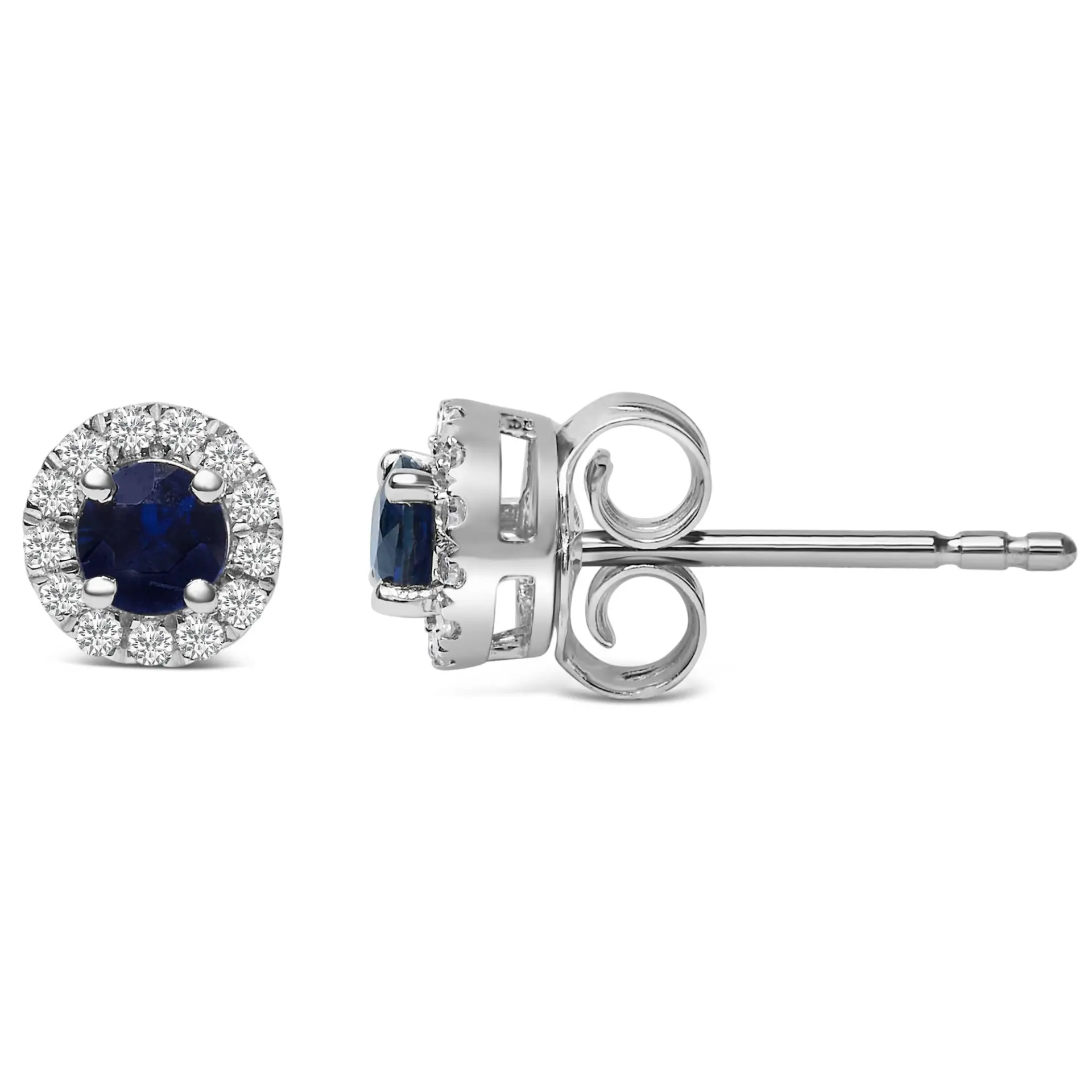 Indulge in the symphony of light and color with these exquisite 10K white gold earrings, beautifully highlighted by the natural allure of deep blue sapphires, naturally sourced, and meticulously crafted without any treatment, ensuring their pristine and authentic beauty shines through. Each earring centers a luscious 3.25mm blue sapphire, encircled by a radiant halo of natural diamonds, collectively weighing 1/10 carat, boasting an I-J color and I1-I2 clarity. This enchanting constellation is designed to mimic a grander solitaire, casting a spherical illusion that magnifies its mesmerizing impact. The durable rhodium plating enhances the white goldas brilliance, ensuring lasting gleam and sophistication. Secure pushbacks provide peace of mind for these treasures of refined elegance, destined to elevate any ensemble, captivate onlookers, and resonate with the wearer’s refined taste.