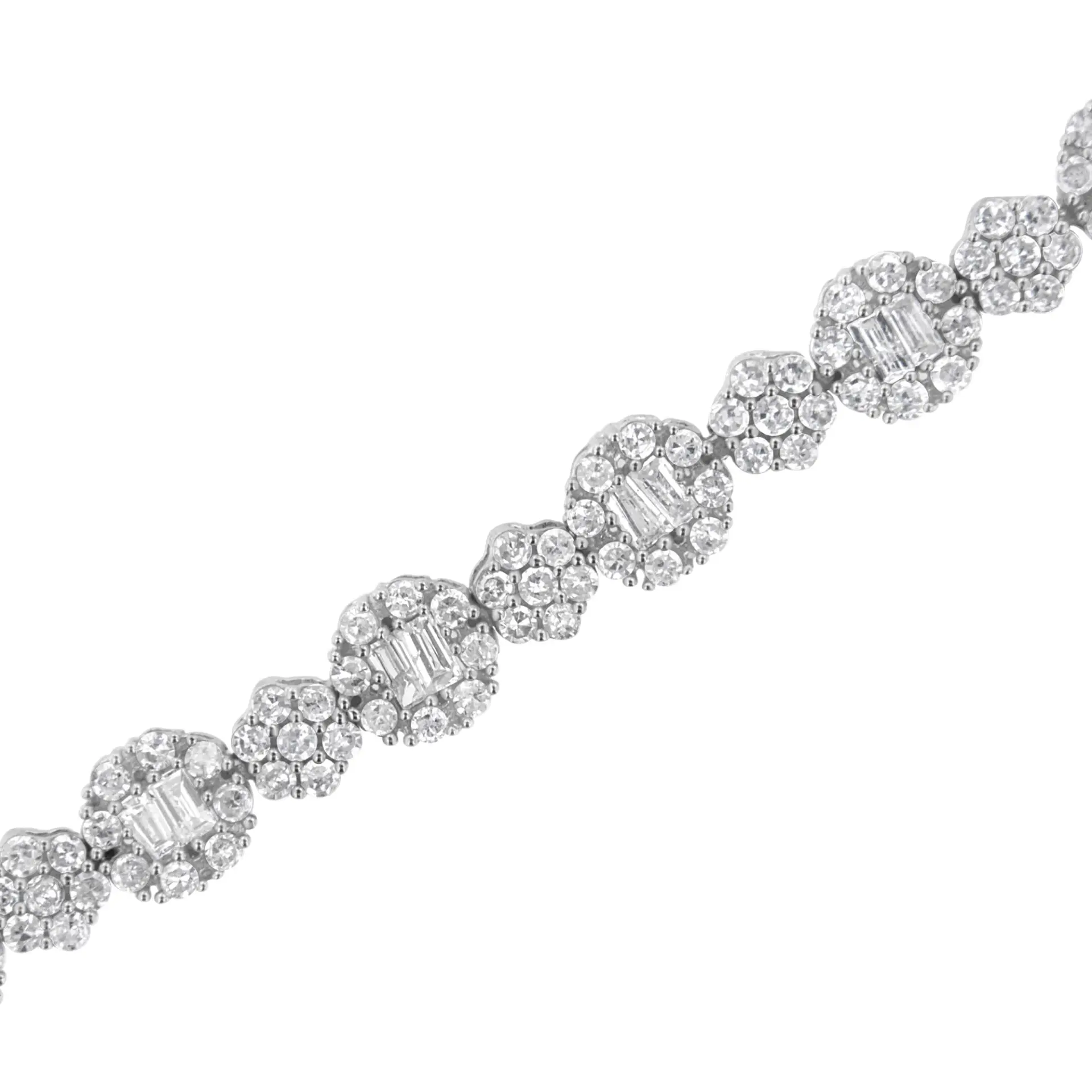 Add a little sparkle to your outfit with this 10k white gold bracelet that features 4ct TDW of diamonds. 306 color treated diamonds dazzle in this link bracelet design. Baguette cut diamonds sit at the heart of a round cut diamond halo and alternate with round cut diamond circular clusters. A box clasp mechanism secures the bracelet.