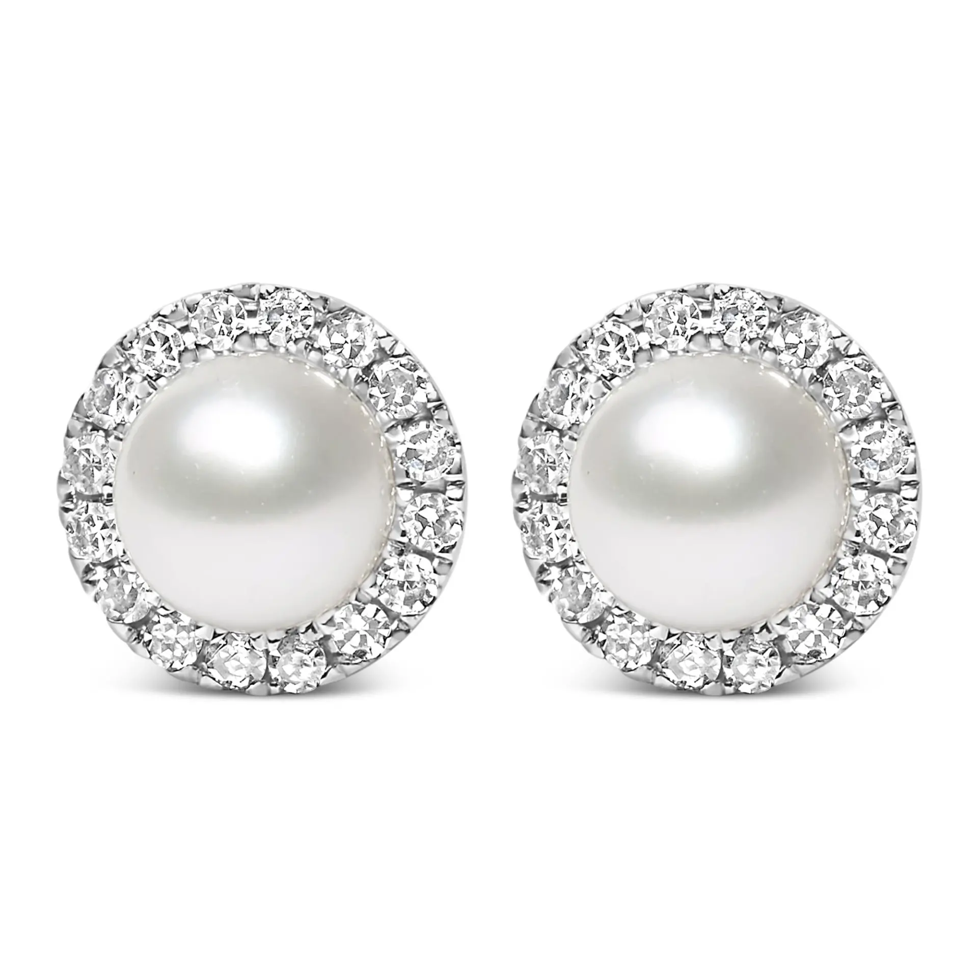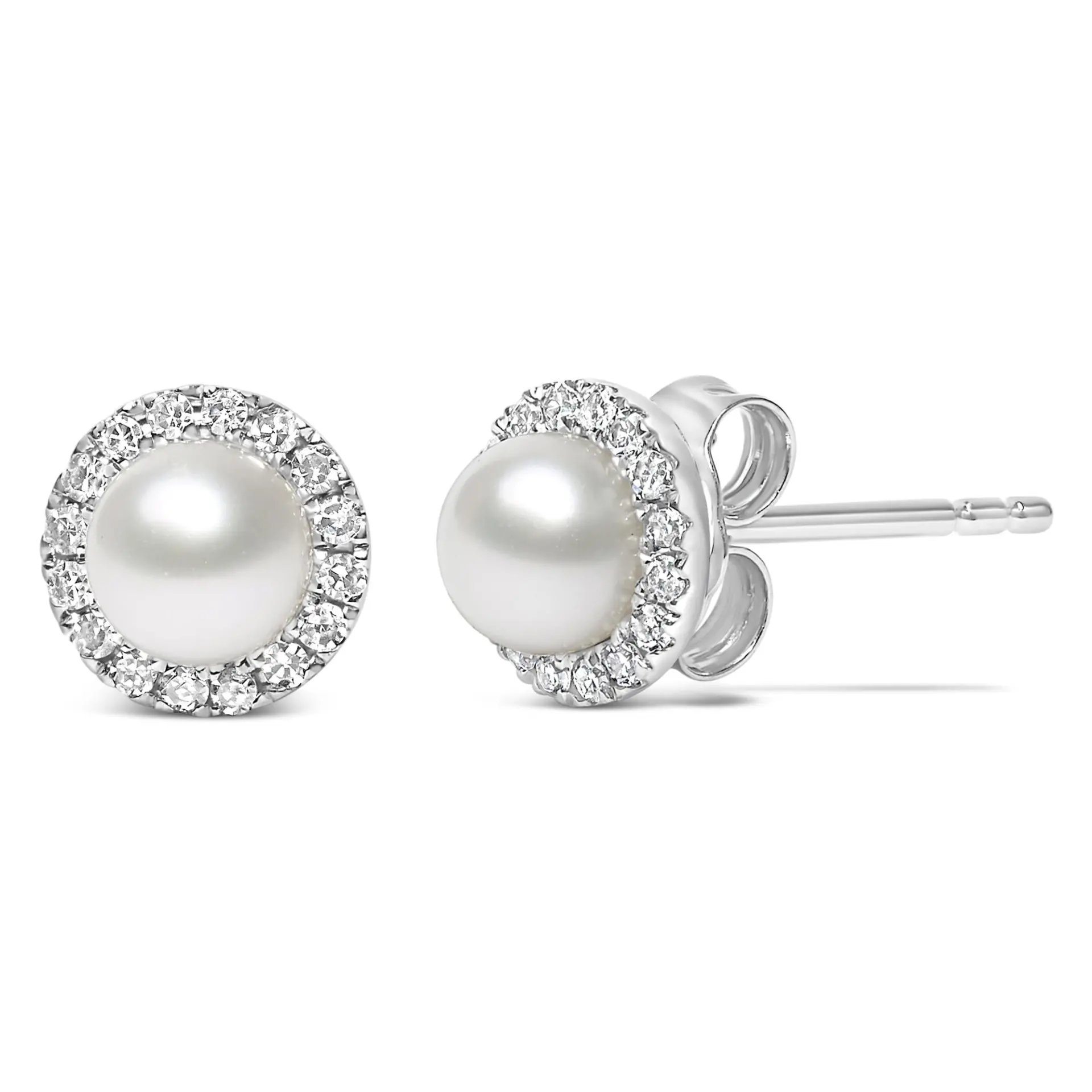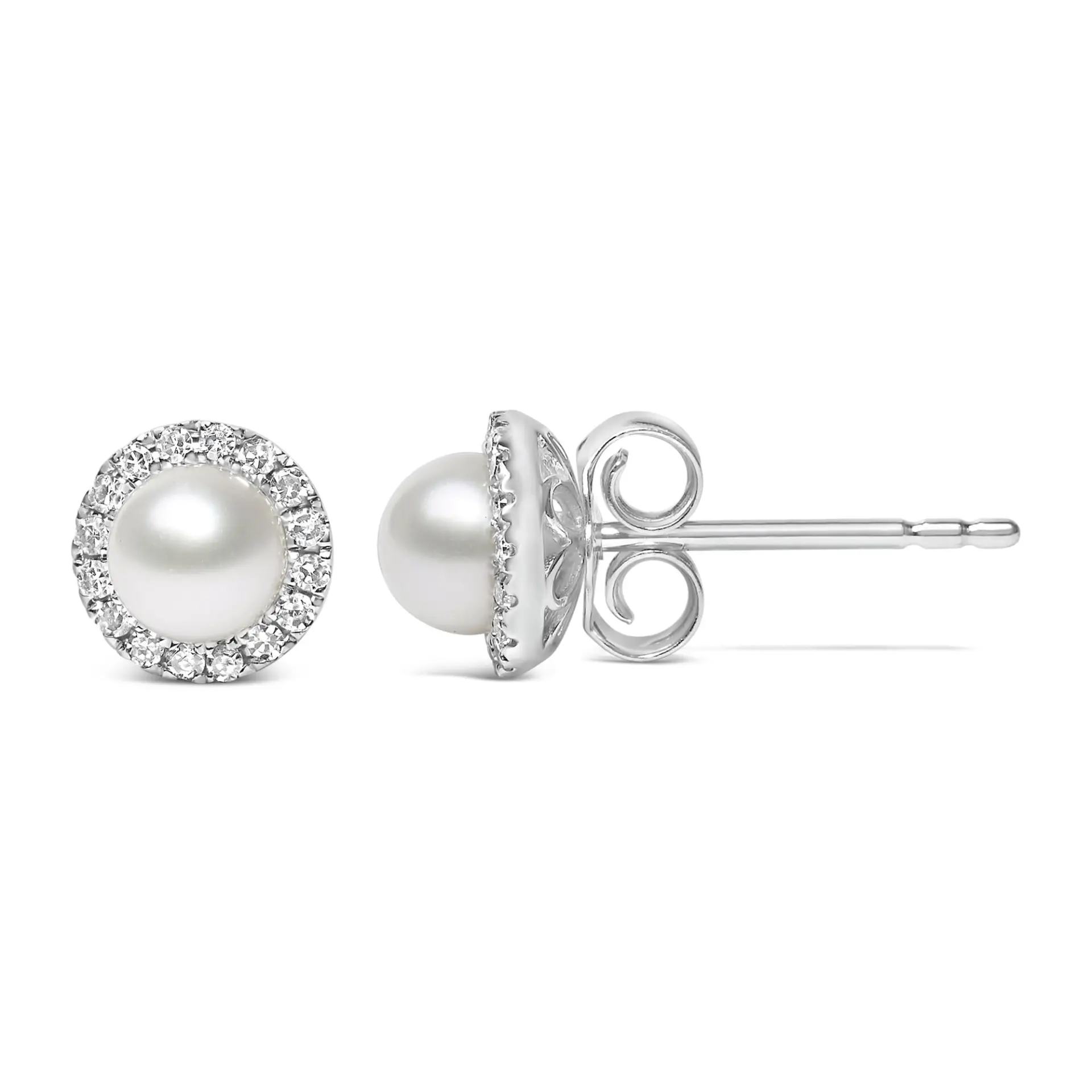 Discover the refined elegance encapsulated in these delicately crafted earrings, featuring 4.5mm cultured Chinese freshwater pearls nestled in a shimmering halo of natural white diamonds. Each lustrous pearl, a whisper of timeless sophistication, is cradled in a cup setting of rhodium-plated 10K white gold, ensuring a radiant sheen that endures. Encircling these gems, the diamonds, weighing a total of 1/7 carat with an I-J color and I1-I2 clarity, dazzle with an enigmatic sparkle, capturing both light and imagination. Engineered for comfort with secure pushbacks, these earrings promise not only a snug embrace on your ears but a touch of opulence that resonates with every glance.