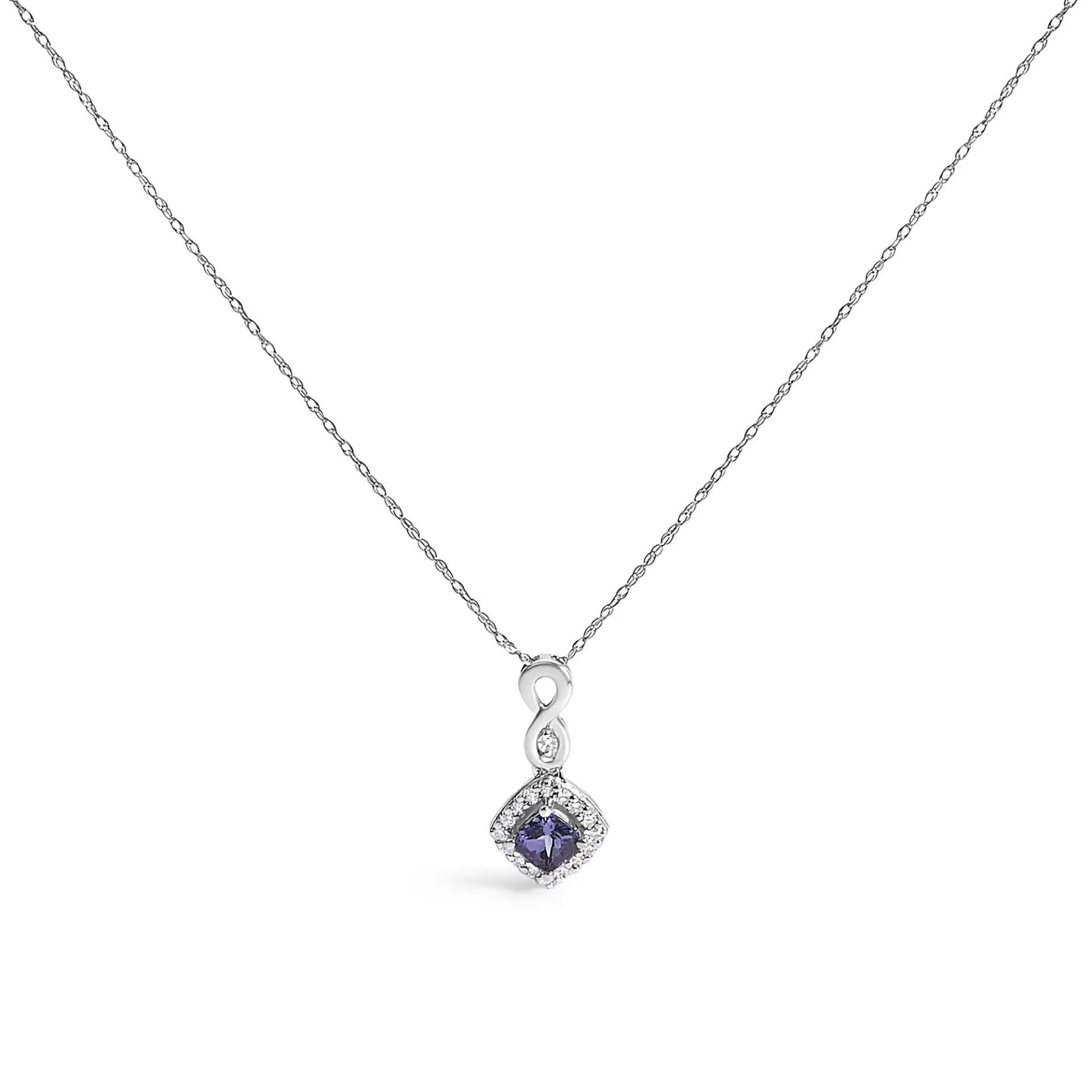 Crafted from rhodium-plated 10K white gold, this pendant necklace is a paragon of elegance. At its heart lies a cushion-cut, heat-treated 4×4 mm tanzanite, its captivating blue-purple hue reminiscent of twilight skies, naturally sourced but enhanced to bewitching effect. Encircling this central gem are scintillating natural diamonds, each ethereal sparkle graded I-J in color and I1-I2 in clarity, lending a refined glimmer. Suspended on an 18-inch rope chain secured with a spring ring clasp, this piece boasts a sophisticated allure, making it the quintessential accessory for lifeas significant celebrations.