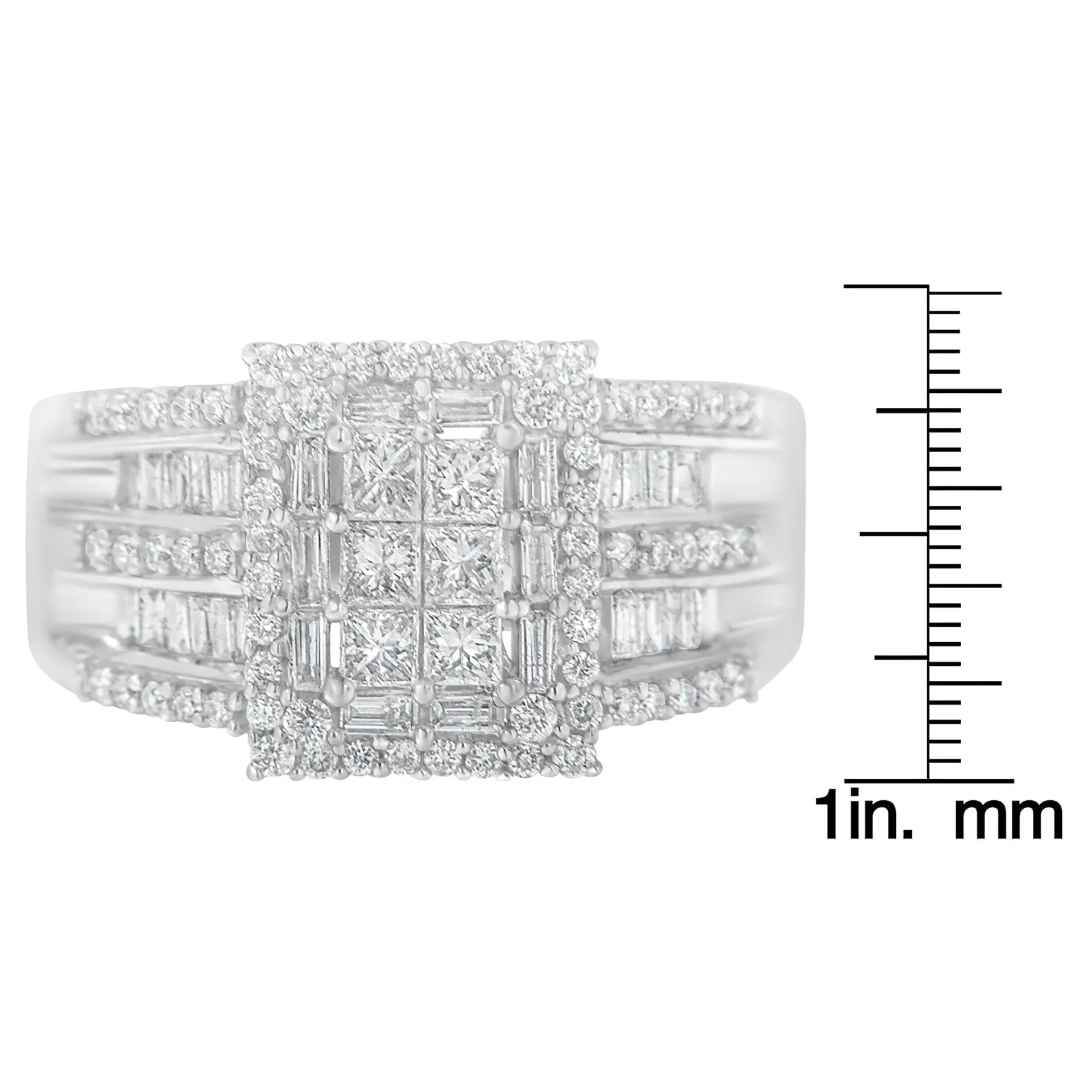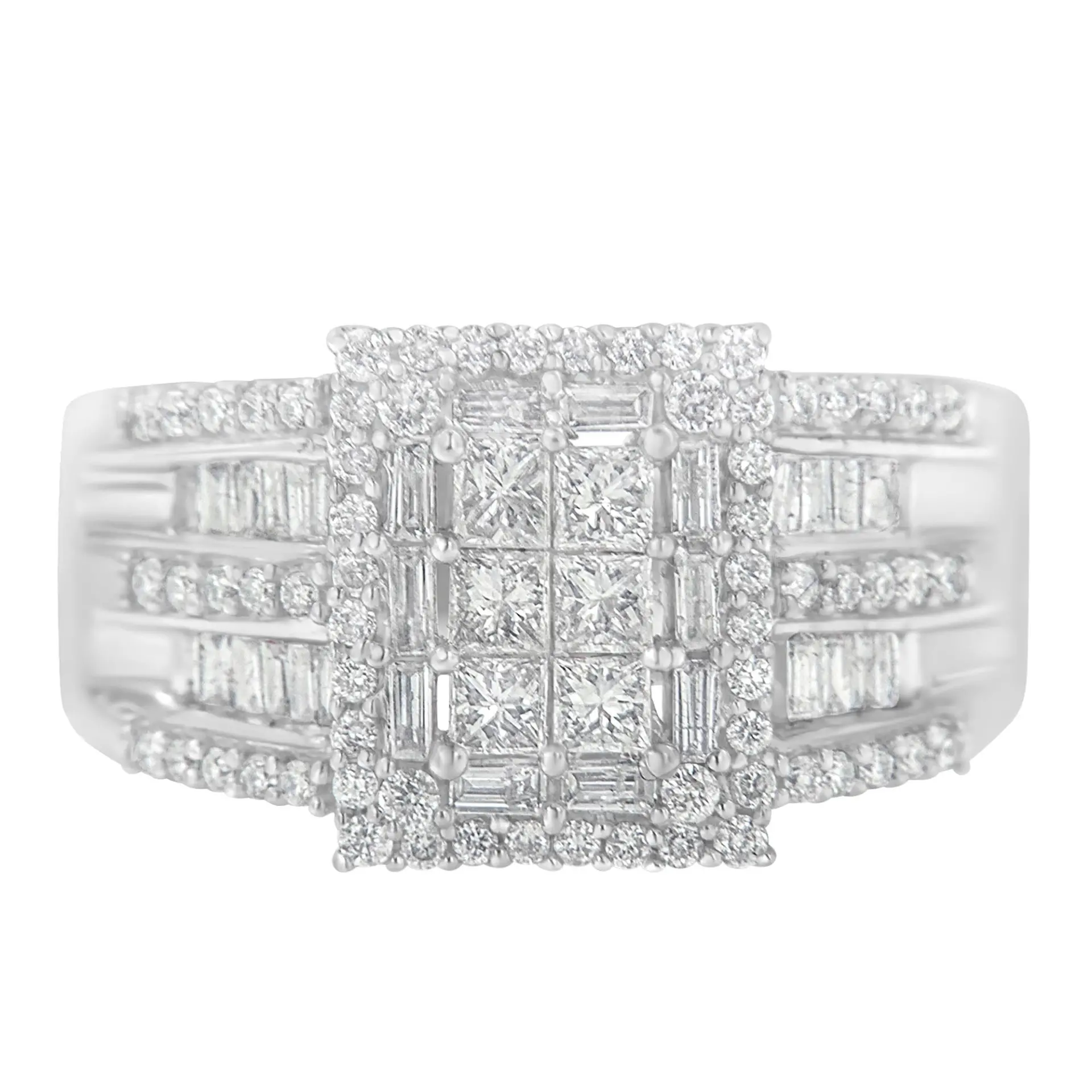 A diamond and gold cluster ring. The ring features 6 princess, 32 baguette, and 66 round diamonds together weighing 1 carat. They are set in a 10k white gold band.