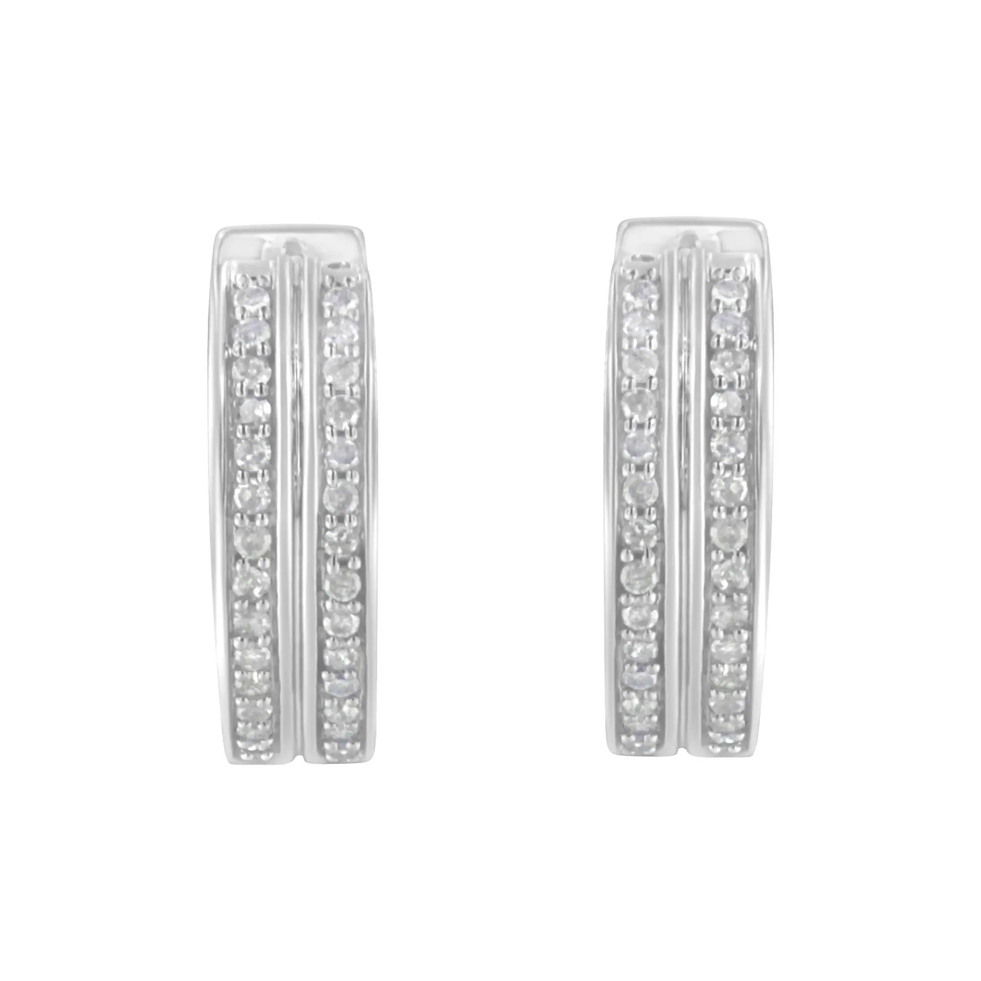 Exuberant hoop earrings made with 10k white gold and genuine diamonds. The round format of the earring contains 56 diamonds with a cut-shape and a pave setting. This silver-plated colored jewelry piece comes with lever-backs and presents a 1/2ct total diamond weight. With an incredible shimmering effect, these earrings are a fantastic choice for special occasions and formal events.
