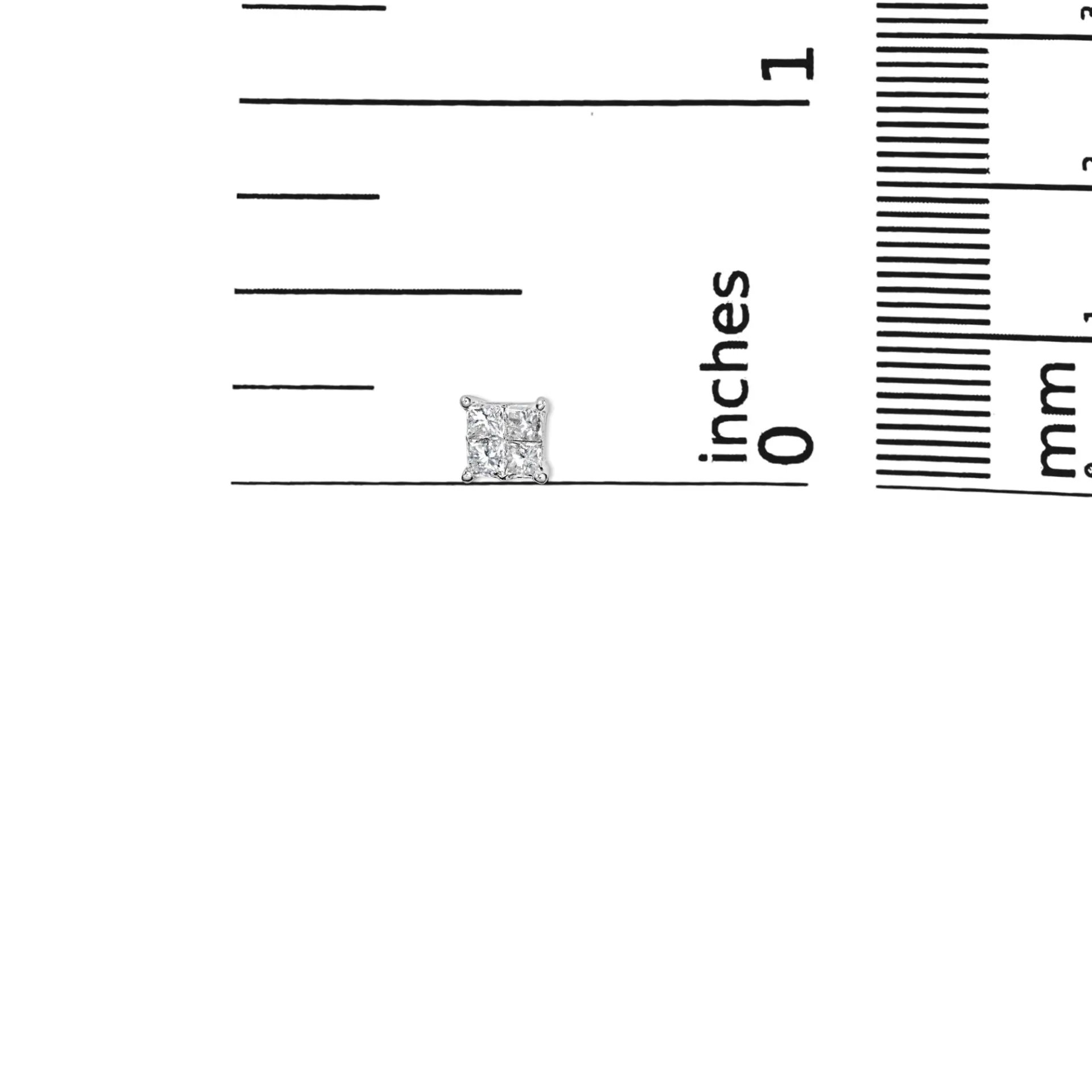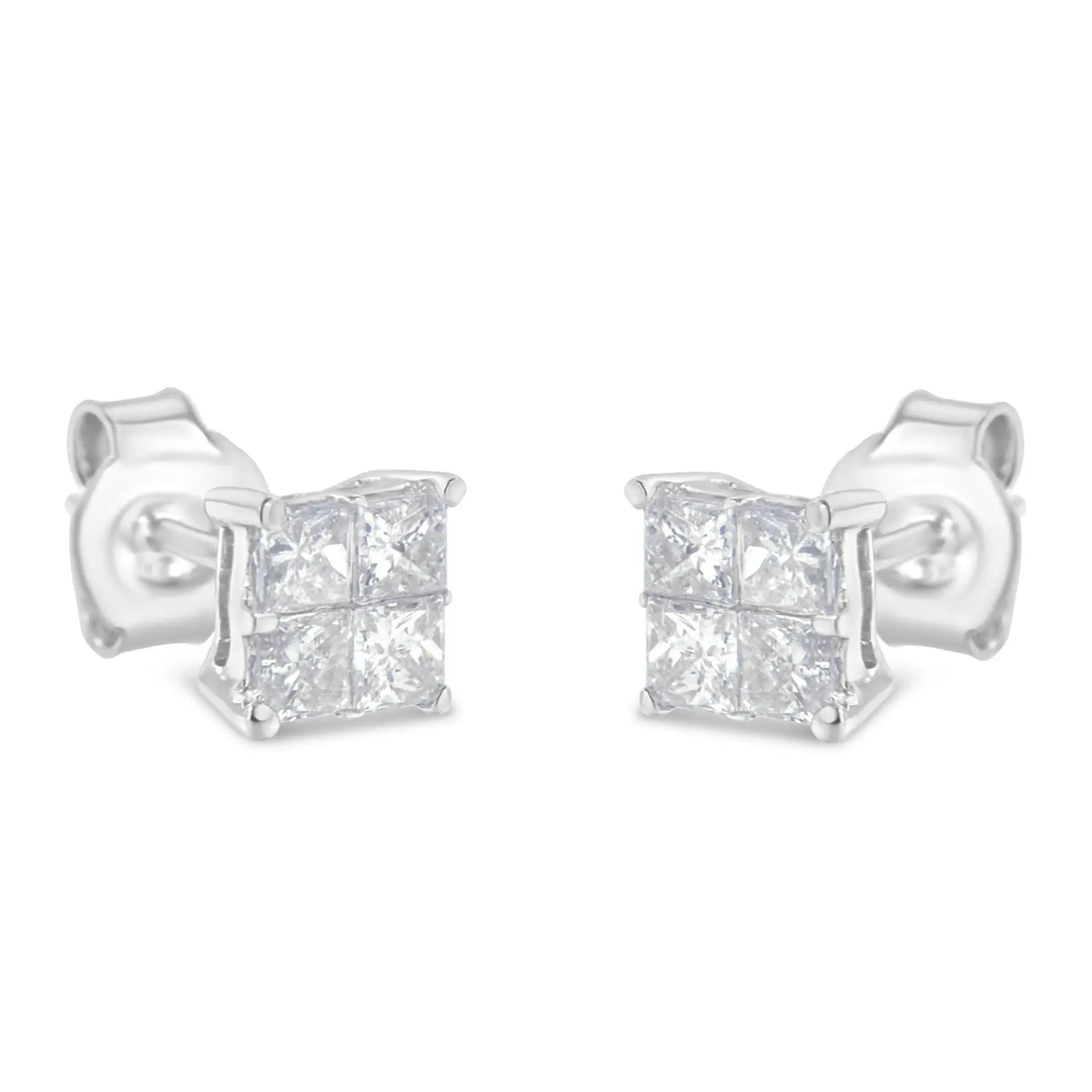 Elegant stud earrings made with the purest 10k white gold and genuine diamonds. This marvelous piece includes 8 princess shaped diamonds with an invisible setting. They fill out most of the white gold classic squared design formed by 4 diamonds in each earring. It comes with a push back. Marvelous pick for any sort of formal or special occasion. These earrings display a 3/4 total diamond weight.