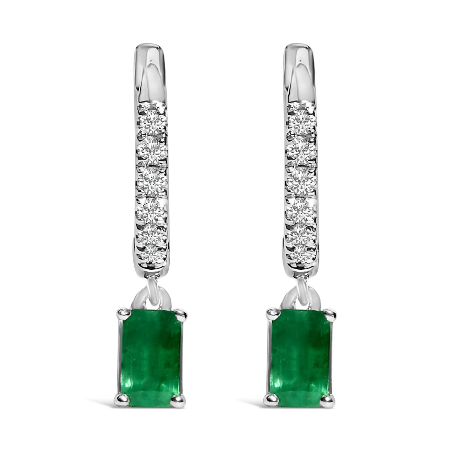 These exquisite earrings crafted from rhodium-plated 10K white gold embody classic elegance with a modern twist. Each piece starts with a shimmering trail of natural diamonds, totaling 1/8 carats, meticulously set in a unique fish tail pave that captures and reflects light with every movement. Dangling gracefully at 3/4 inches, the real spectacle is the vivid oval green emerald, naturally sourced and enhanced only by traditional oiling to elucidate its deep, enchanting hues. The rich green of the emerald provides a striking juxtaposition against the icy sparkle of the diamonds, creating a breathtaking contrast that’s sure to draw admiration. Secured with hinge backs, these earrings promise not only comfort but also a steadfast shimmer by your side.