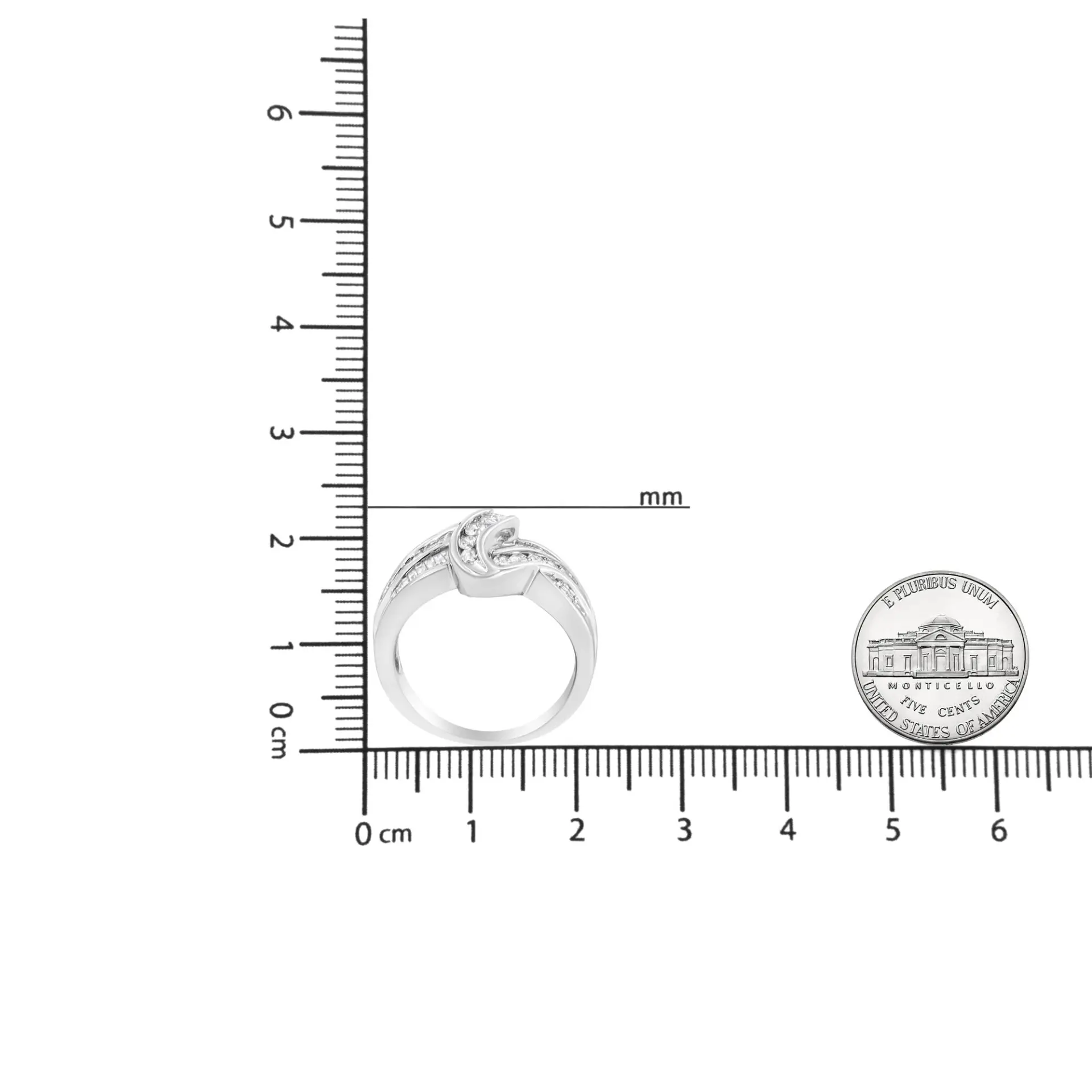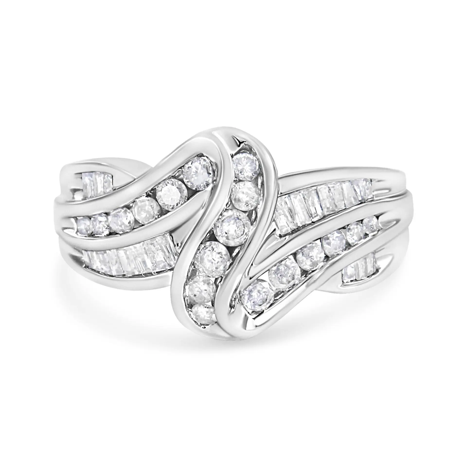 Natural diamonds and gleaming gold interlock each other to create this eye-catching bypass ring design. Created in shining 10k white gold, this ring will sit so elegantly on your finger and sparkle with 3/4 carats of diamonds. An assortment of round and baguette-cut diamonds adorn this piece, and will give all your outfits a dazzling effect.