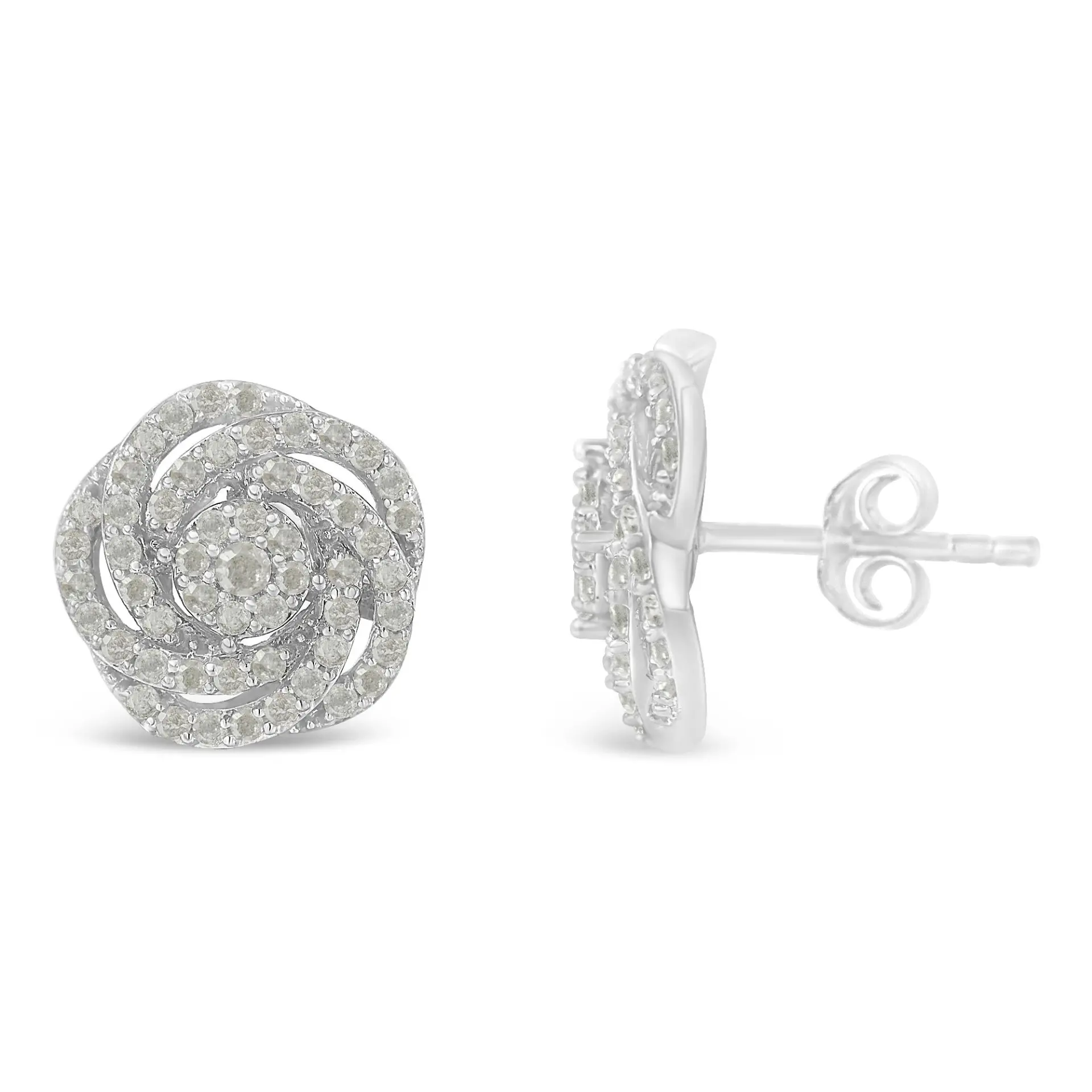 Dazzle all those around you with this white gold, rose shaped cluster stud earrings. Composed of 108 round cut diamonds that make up a total of 1 ct., this piece is meticulously designed to add a bit of shimmer to her face. Give a touch of elegance to any outfit, casual or formal, with these fabulous studs. Set in a prong setting, these studs come with a push back mechanism for a secure fit.