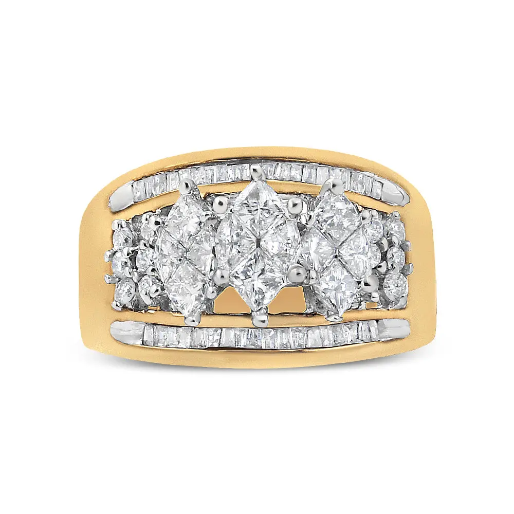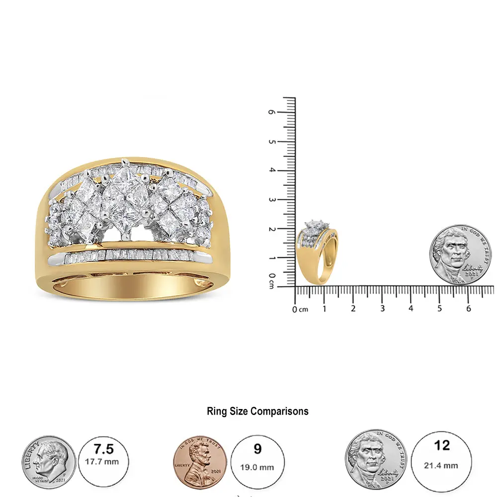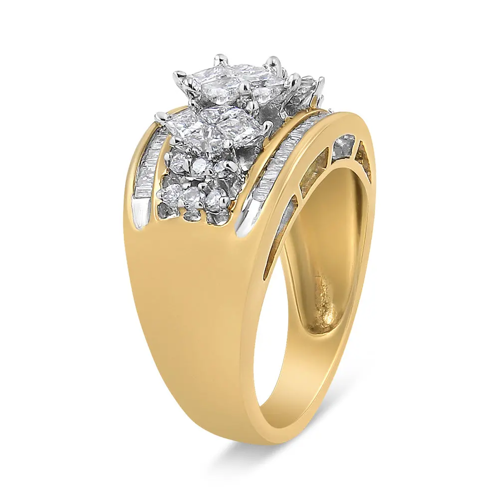 Glamorous and eye-catching, this stunning 1 1/2 c.t. cocktail ring has a gold band that splits at the center to showcase a cluster of natural pie and round-cut diamonds. Baguette-cut diamonds embellish the band in white gold. The piece is crafted in 10k gold, a metal that will stay tarnish-free for years to come. The band shines in yellow gold and will look spectacular on your finger! Add this everlasting ring to your growing jewelry collection.
