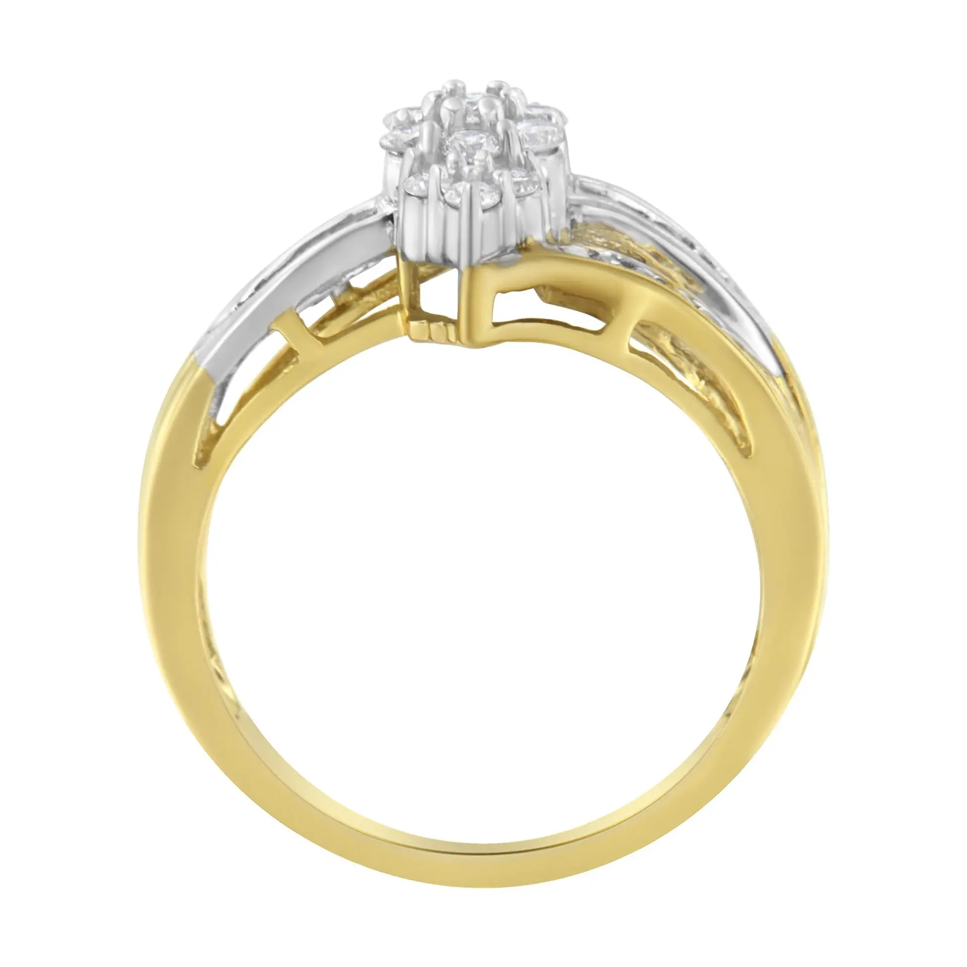 Crafted in lustrous 10k gold, this bypass ring showcases a dazzling round diamond cluster. Soft alternating yellow and white gold ribbons split from the ring band and surround the cluster. Round and baguette cut diamonds inlay the ribbons. A 1/2 Carat TDW of diamonds give this ring an unique and eye catching design.