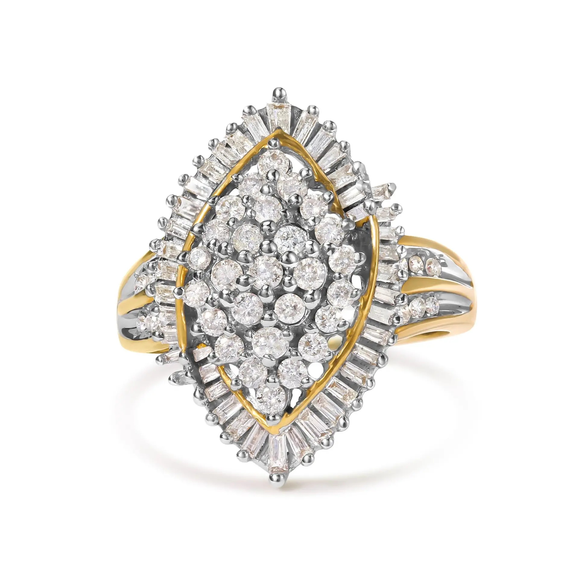 Indulge in the exquisite allure of our 10K Yellow Gold Diamond Cluster Ring. This captivating masterpiece is designed for the discerning woman who seeks elegance and brilliance. Crafted with meticulous artistry, it showcases a harmonious fusion of round and baguette-cut diamonds, boasting a total of 81 natural diamonds. The 39 round diamonds shimmer with enchanting grace, while the 42 baguette-cut diamonds add a touch of sophistication. With a generous 1.0 Cttw diamond weight, this ring exudes opulence. The I-J color emits a soft, warm glow, complemented by the SI2-I1 clarity that ensures stunning clarity and sparkle. Set in a prong setting, the diamonds are securely held to create a breathtaking spectacle. Sized perfectly at 7, this cocktail ring embraces your finger with a gentle touch, enhancing your femininity. Elevate your style and embody timeless elegance with this mesmerizing diamond cluster ring.