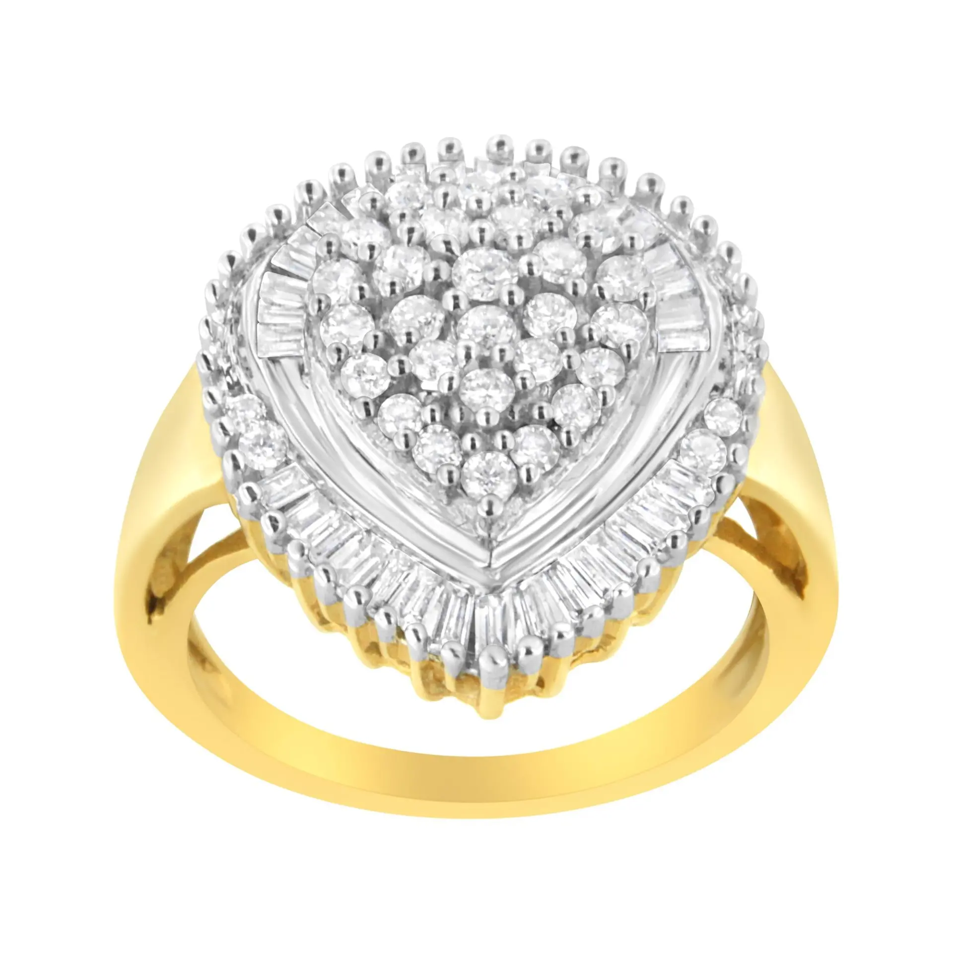 A bold gold and diamond cocktail ring. This pear-shaped ring is made with 31 round and 33 baguette-cut diamonds in a prong and channel setting, respectively. The diamonds, weighing a total of 1 ct., are set in lustrous 10k yellow gold. This ring is the perfect accessory for any night out.