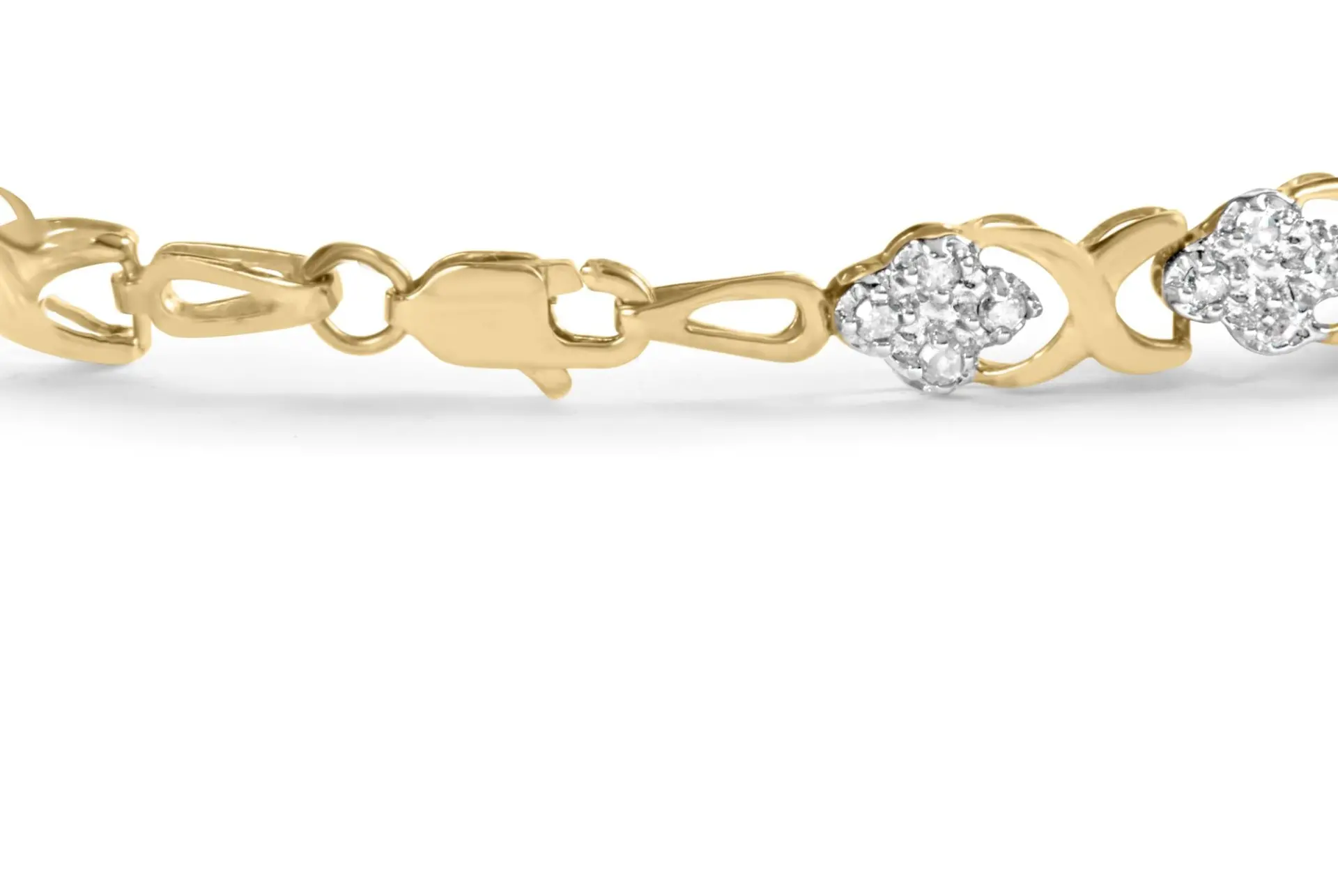 Indulge in the ultimate luxury with this stunning 10K yellow gold diamond bracelet. The 5 stone floral cluster and “X” link design creates a sophisticated and timeless look that is perfect for any occasion. With a total diamond weight of 1.00 cttw and embellished wiht 60 sparkling round diamonds in a prong setting, this bracelet is a true statement piece. The I-J color and I3 clarity diamonds add a touch of elegance and sophistication to the piece. The lobster claw clasp ensures a secure and comfortable fit for all-day wear. This bracelet is the perfect gift for any woman who loves to add a touch of sparkle to her wardrobe. With its natural diamond origin and exquisite design, this bracelet is sure to become a cherished addition to any jewelry collection.
