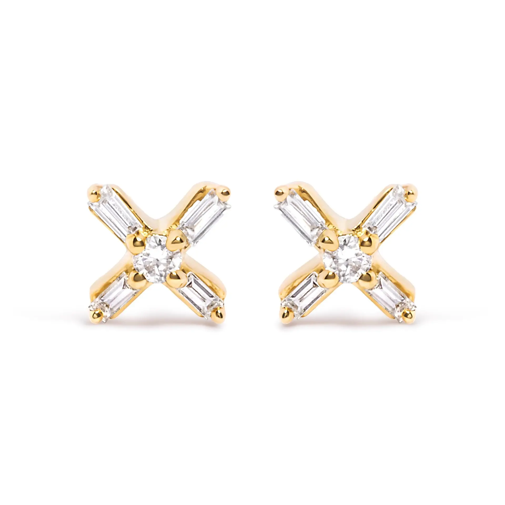 Introducing a captivating masterpiece that effortlessly combines elegance and style. Crafted in 10K yellow gold, these exquisite stud earrings are adorned with a mesmerizing criss-cross design, showcasing the brilliance of 10 natural diamonds. With a total weight of 1/10 cttw, these diamonds are carefully set in a prong setting, allowing them to shimmer and dance with every movement. The round and baguette diamond arrangement creates a harmonious balance, exuding sophistication and grace. The H-I color of these diamonds adds a touch of warmth, while the I1-I2 clarity ensures a radiant sparkle. These earrings are designed with women in mind, providing a timeless accessory that effortlessly elevates any ensemble. Completed with push back findings, these earrings offer both comfort and security. Indulge in the luxurious allure of these diamond criss-cross stud earrings and let your inner radiance shine through.