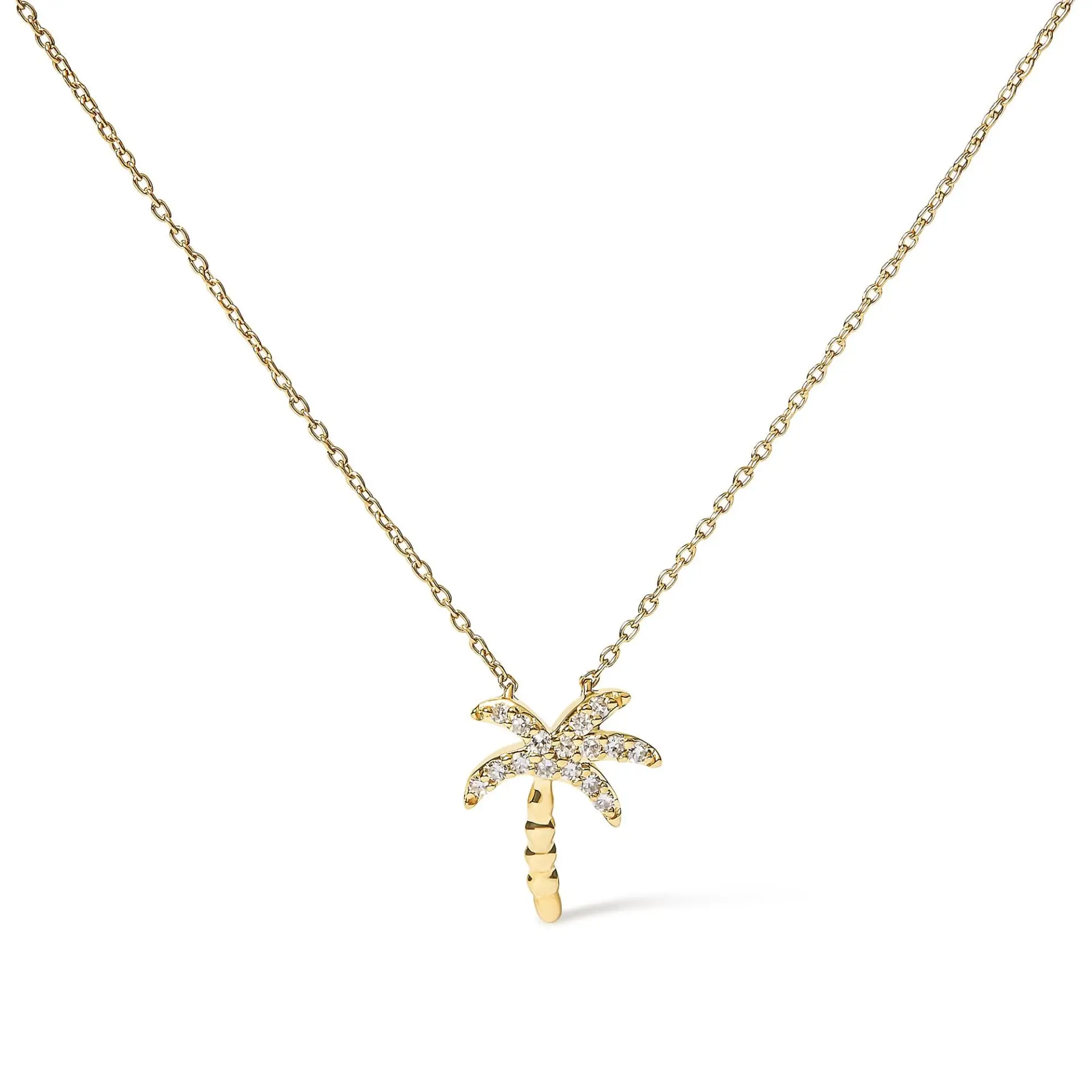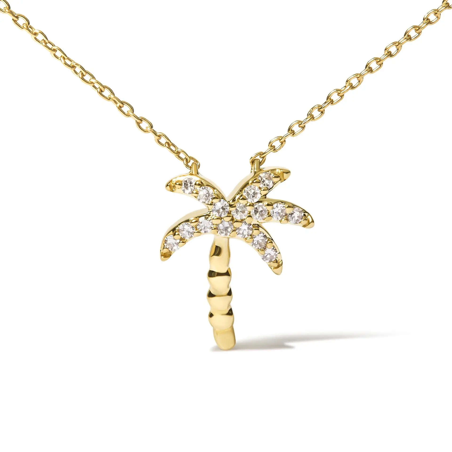 Introducing a dazzling piece that encapsulates the essence of nature’s beauty – an 18″ Inch Palm Tree Pendant Necklace. Crafted with utmost precision in 10K Yellow Gold, this stunning necklace is adorned with 16 exquisite round diamonds, totaling 1/10 cttw. The diamonds, delicately set in a pave style, radiate a mesmerizing brilliance that effortlessly captures attention. The H-I color of these diamonds adds a touch of warmth, while the I1-I2 clarity ensures a captivating sparkle. Designed to celebrate femininity, this necklace is an ideal accessory for women who appreciate both elegance and nature-inspired charm. Fastened with a secure spring ring clasp, it promises to gracefully adorn your neckline. This Palm Tree Pendant Necklace is not just a piece of jewelry, but a symbol of serenity and grace, making it a perfect addition to your collection or a thoughtful gift for someone special.