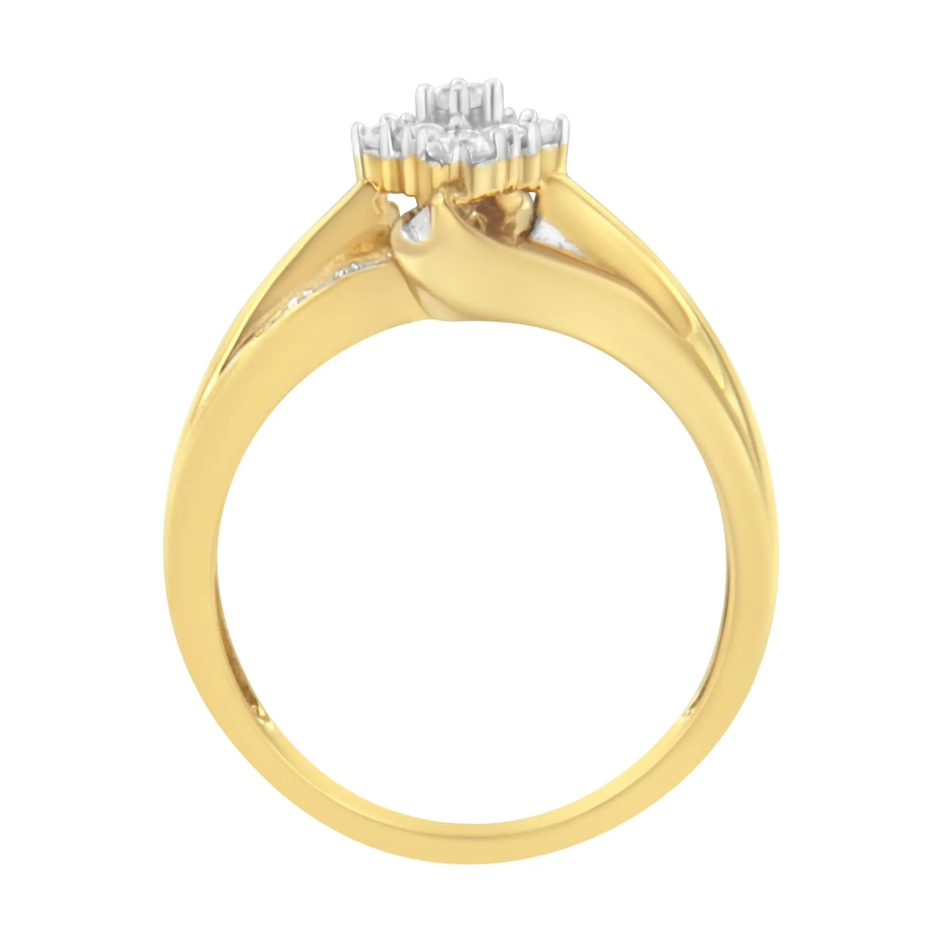 Bold and unique, this 10k yellow gold cluster ring will be your go-to statement piece. The band creates a ribbon-like illusion in four directions that come together at the center to showcase 9 round-cut diamonds prong-set in a rhombus-like design. The band also boasts round-cut and baguette-cut diamonds that sparkle.