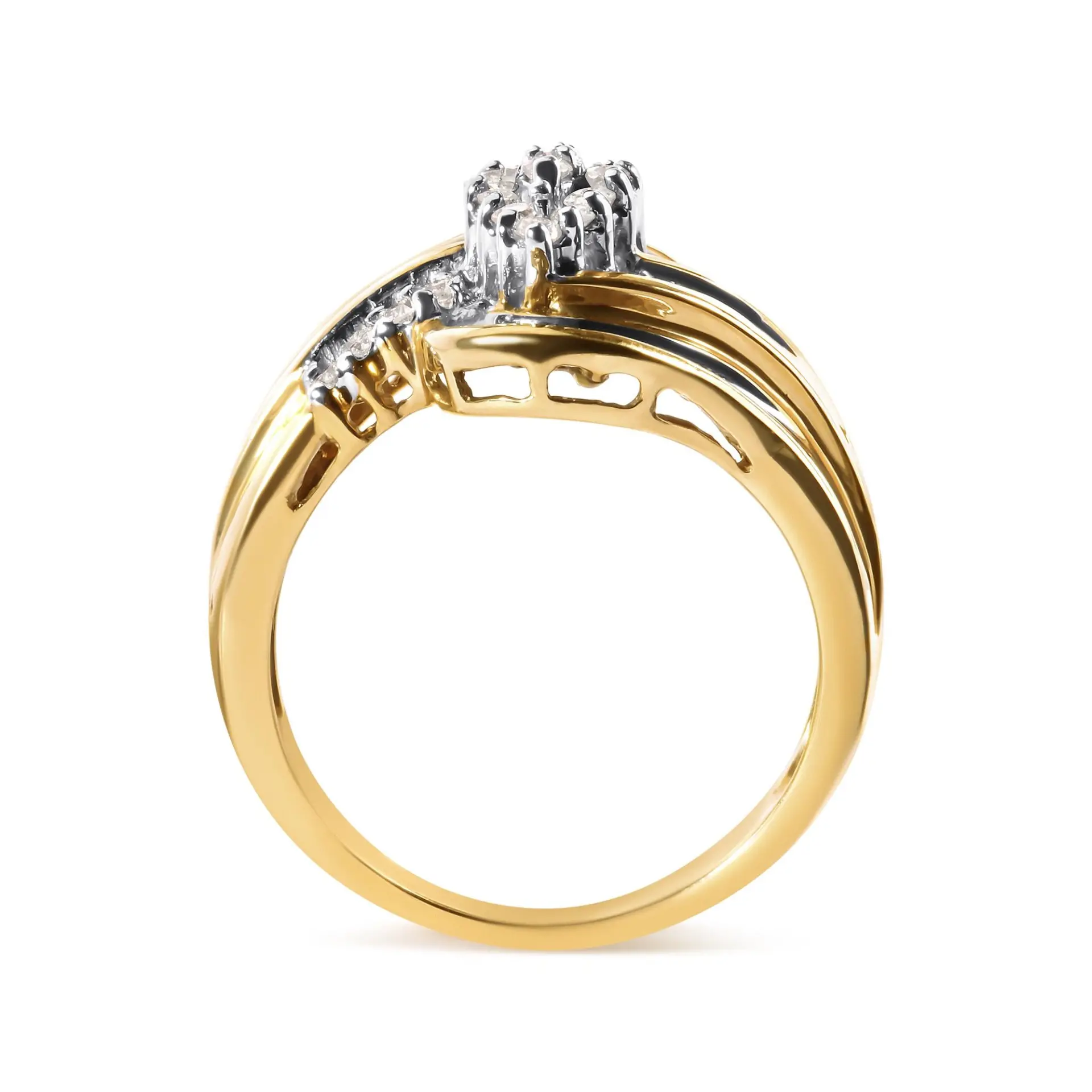 Experience the epitome of elegance with our fashion ring. This enchanting piece is a true reflection of the captivating beauty of natural diamonds and the craftsmanship that brings them to life. Crafted in lustrous 10K yellow gold, the ring showcases a stunning cluster of 50 diamonds, including 22 brilliant round diamonds and 28 dazzling baguette-cut diamonds. With a total weight of 1/2 carat, these diamonds exude a radiant brilliance that catches the light from every angle. The H-I color grade ensures a captivating sparkle, while the I1-I2 clarity grade adds a touch of natural allure. The diamonds are meticulously set in a combination of prong and channel settings, allowing them to shine with utmost radiance. The pear cluster and swirl design adds a touch of glamour and sophistication, making this fashion ring a perfect choice for the modern woman who seeks a distinctive and timeless accessory. Wear it as a symbol of your unique style and refined taste, whether for a special occasion or to elevate your everyday look.