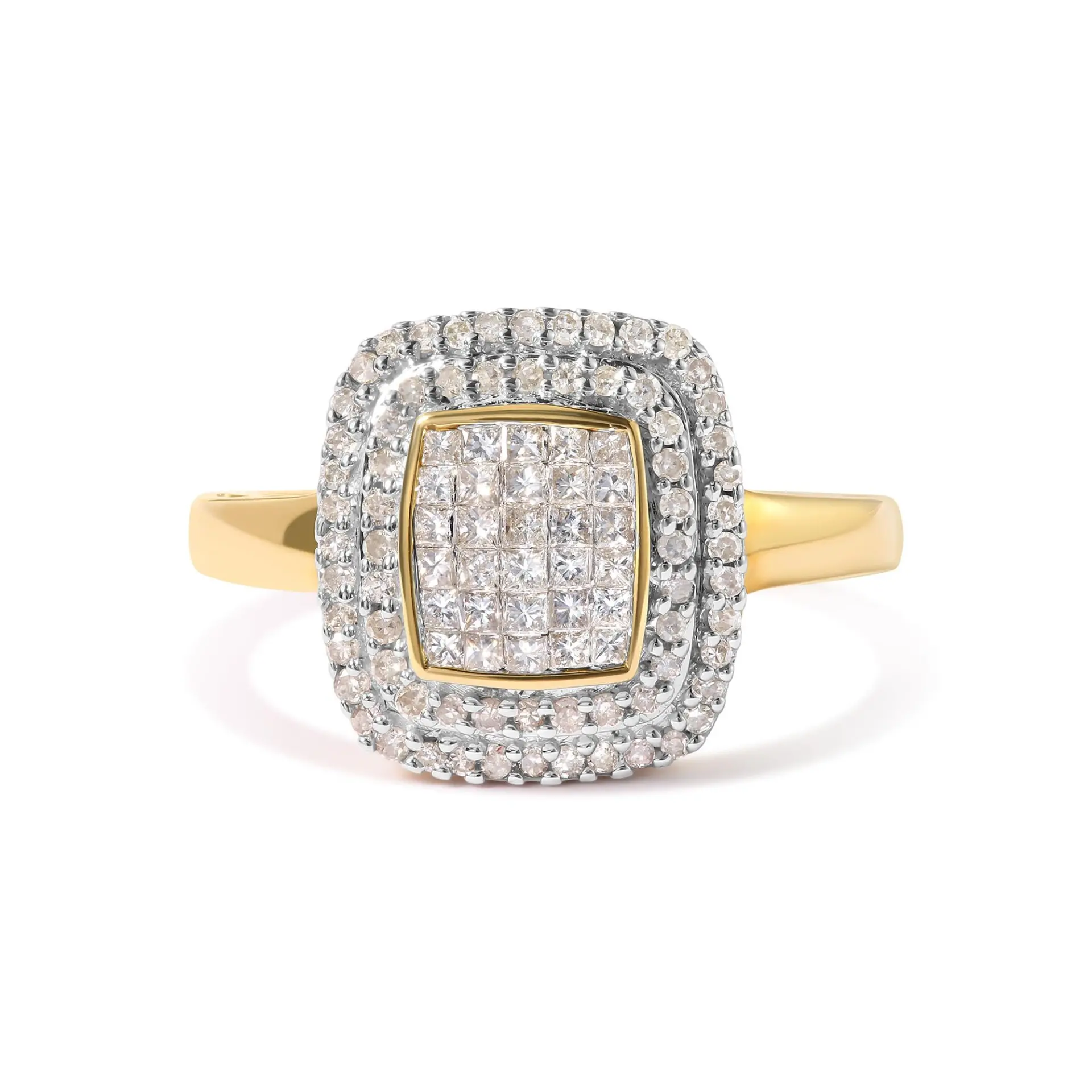 Crafted with meticulous attention to detail, this exquisite piece is a testament to the allure of natural diamonds. Within the lustrous embrace of 10K yellow gold, 98 diamonds gracefully come together to create a mesmerizing composite head and halo design. Adorned with 68 round diamonds and 30 princess-cut diamonds, this ring boasts a total weight of half a carat. The H-I color grade ensures a scintillating radiance, while the SI1-SI2 clarity grade guarantees a captivating display of natural beauty. Every diamond is delicately set in a combination of pave and invisible settings, allowing them to shimmer and sparkle with every movement. This fashion ring is more than just an accessory; it is a reflection of your impeccable taste and individual style. Whether worn for a special occasion or as an everyday indulgence, this ring is destined to become a cherished treasure.