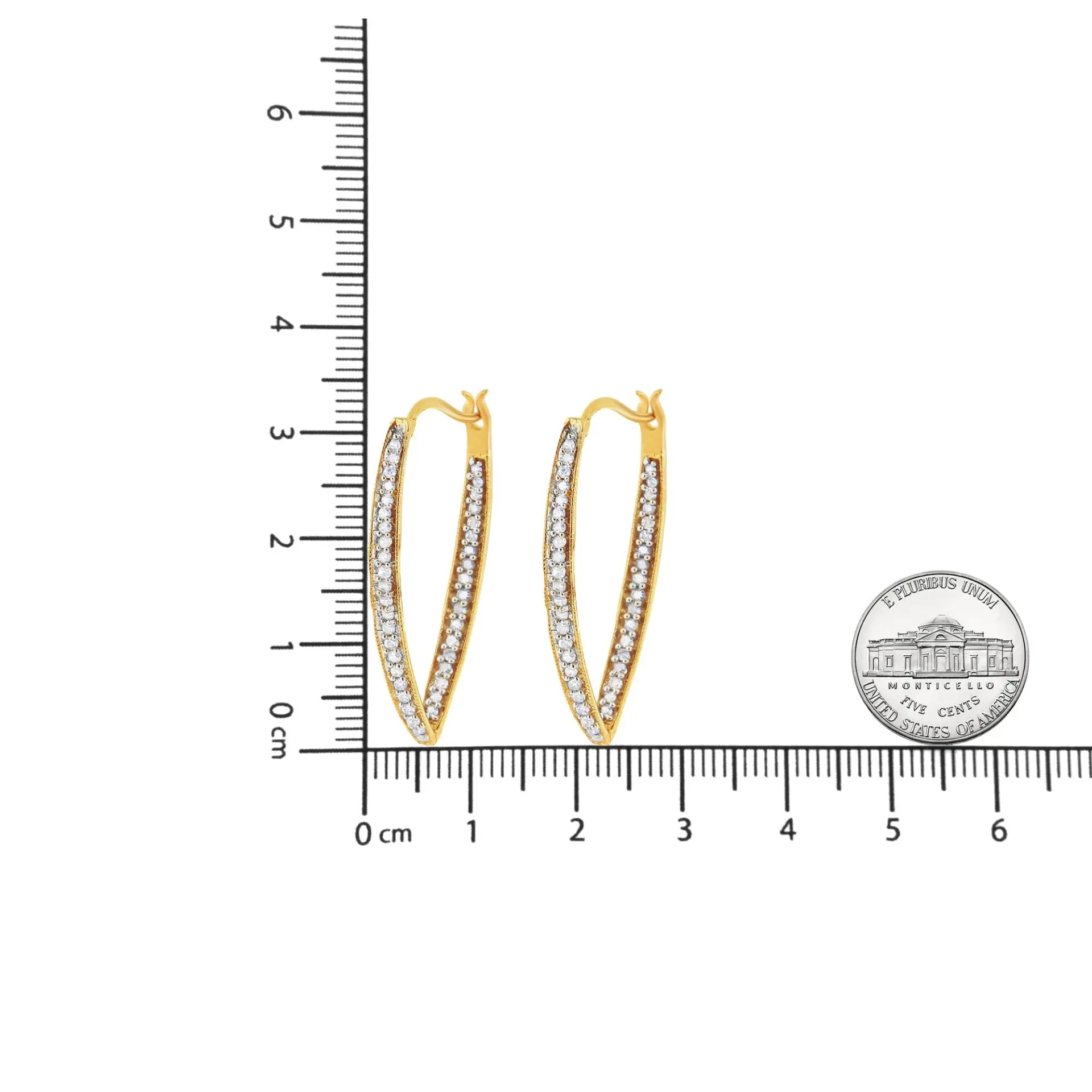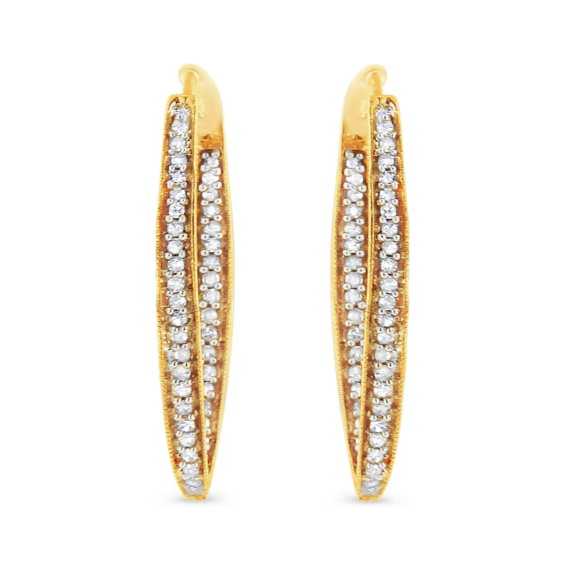 Dress up any outfit with this trendy yet timeless modern hoops. These earrings are crafted in gleaming 10k yellow gold and have an outside-inside design embellished with beautiful, natural diamonds. The diamonds are round-cut and sparkle in an elegant prong setting. The total carat weight of these earrings are 1/2 c.t. They come with a clip-on mechanism for a safe and secure fit on your ears. You can’t go wrong investing in these stunning hoops.