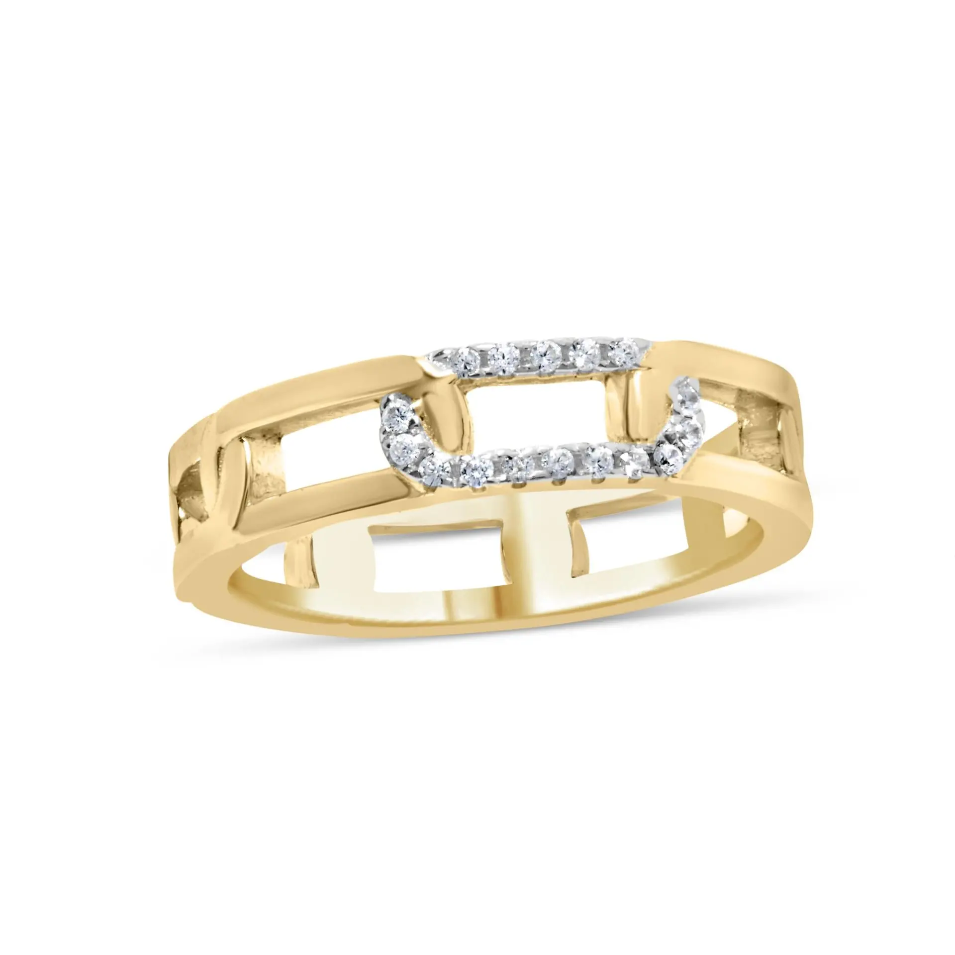 Embrace modern elegance with this exquisite 10K yellow gold ring, designed in the fashion-forward paperclip style. This piece beautifully marries contemporary chic with timeless luxury, featuring natural diamonds that twinkle with an enchanting I-J color and I2-I3 clarity, summing up to a delicate 1/10 carat total weight. Each gem is meticulously prong-set, with rhodium-plated highlights in a striking white that underlines the brilliance and purity of the diamonds, making them appear even more luminous. The unique open-link design not only sets this ring apart in visual appeal but also symbolizes connectedness and strength, making it an ideal gift or a meaningful addition to your own jewelry collection. Adorn your hand with this band and carry a spark of sophistication and innovation wherever you go.