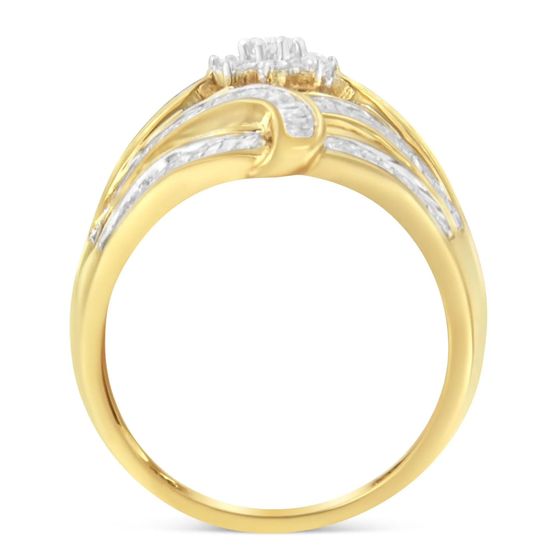 This beautiful diamond ring is the perfect anniversary gift for her. Made in the finest 10k yellow gold, this unique piece is embellished with 9 round cut and 132 baguette cut diamonds in a prong and channel setting respectively. Weighing a total diamond weight of 1 carat, this is the perfect accessory for any occasion, casual or formal. Watch as her eyes light up when she’s gifted this fabulous ring with a one-of-a-kind design. Comes in size 8.