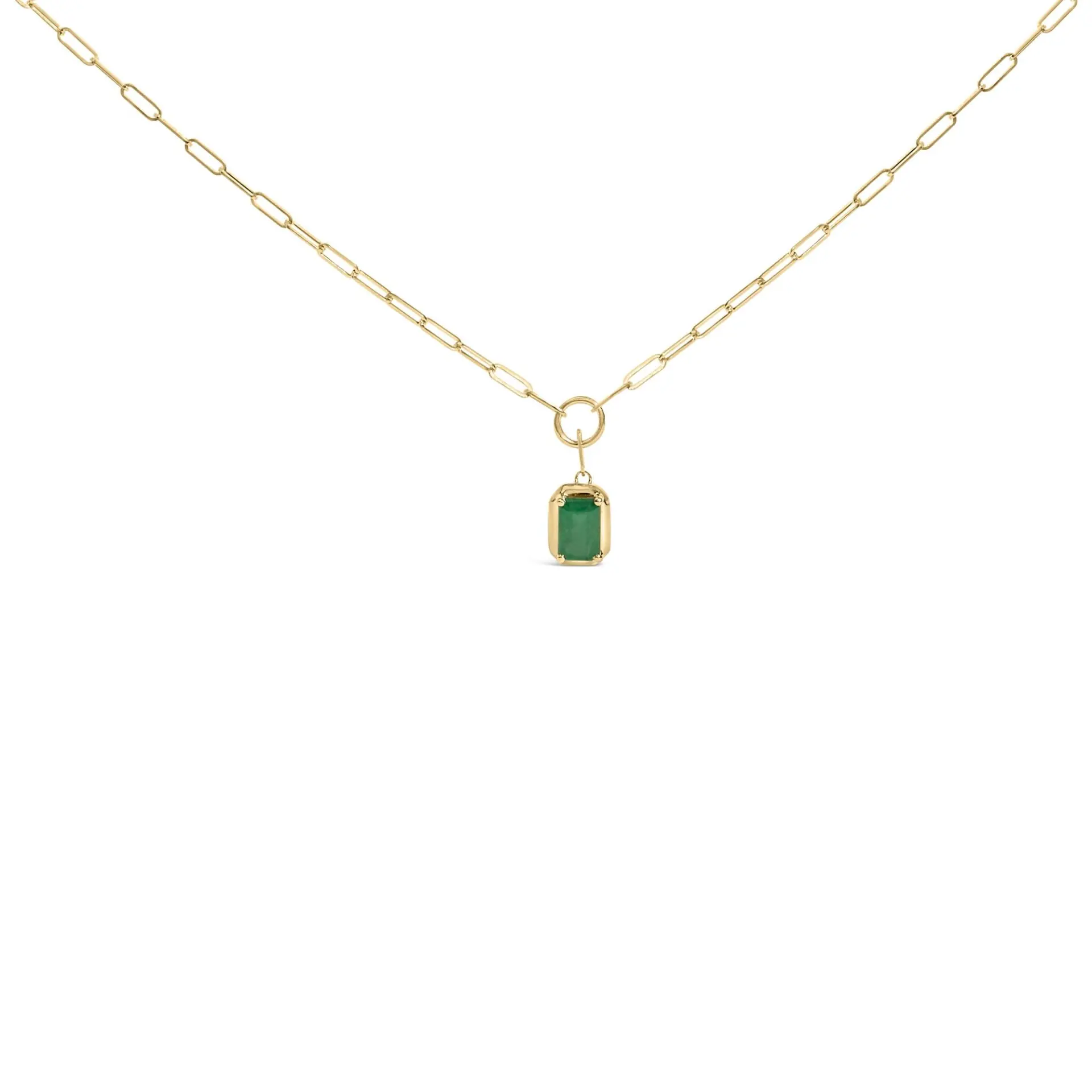 Envelop your neckline in the timeless elegance of our solitaire pendant necklace, an exquisite synthesis of classic sophistication and modern grace. Crafted with meticulous care from radiant 10K yellow gold, it features a natural, oiled green emerald, cherished for its vivid, deep greens and expertly cut into an alluring emerald shape. Measuring 6×4 mm, this gemstone is cradled securely by four delicate prongs that enhance its luminous allure. Suspended from a sleek 18-inch paperclip chain that catches the light with every movement, this pendant secures with a sturdy lobster claw clasp, promising both safety and comfort. This piece is not merely a testament to artistic craftsmanship but a portal to a lifestyle of understated luxury, inviting you to carry the spirit of refinement with you in every moment.
