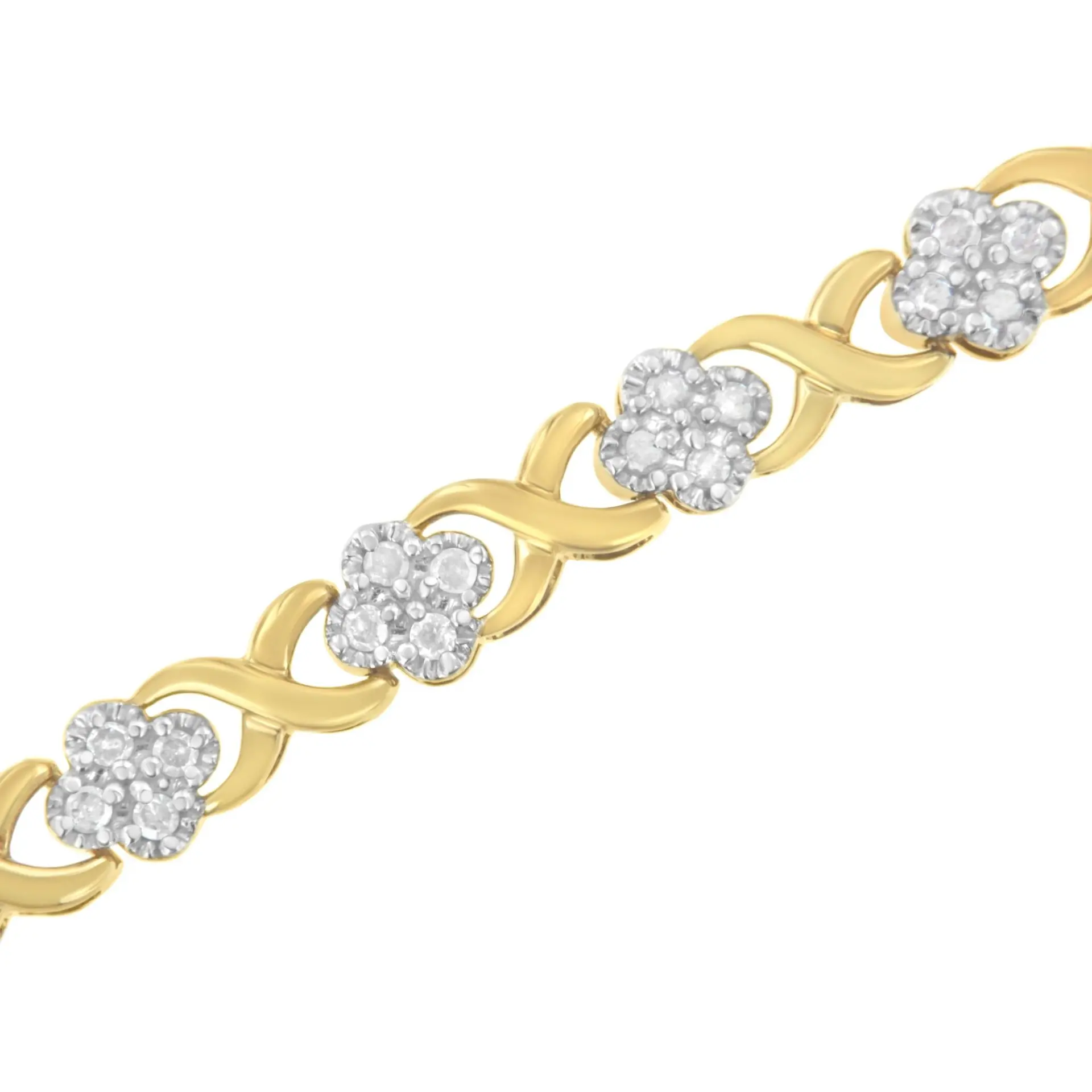 Elegant and timeless, this gorgeous 10K yellow gold coated .925 sterling silver tennis bracelet features 1 carat total weight of round, rose cut, promo quality diamonds with a whopping 64 stones in all. Rose-cut, promo quality diamonds are milky and cloudy in nature. The tennis bracelet features floral diamond clusters with shared prong settings. Each cluster is centered between cursive X shaped links for an xs and os appearance. The 7 bracelet fastens with a lobster claw clasp. This authentic design is crafted of real 92.5% sterling silver that has been electro-coated with genuine 10K gold, ensuring it will keep a tarnish-free shine for years to come. This classic tennis bracelet makes a great gift for any special occasion! Diamonds are thought to give the wearer clarity and illuminate solutions to lifes problems, as well as encouraging abundance, strength, courage, harmony, faithfulness, and commitment. Give her a gift that will perfectly complement her favorite ensemble.