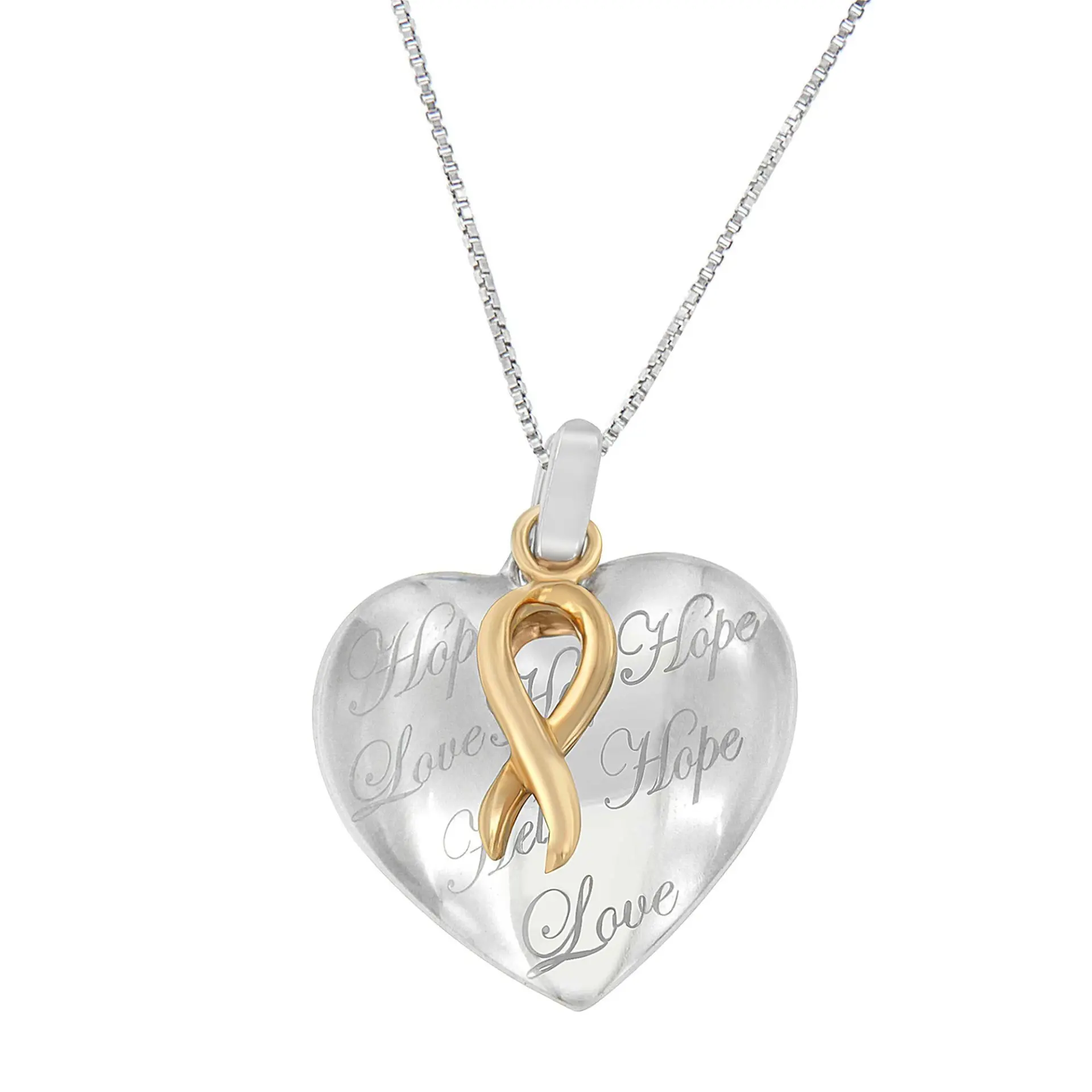 This gorgeous necklace makes a perfect present to show your love. Crafted from lustrous sterling silver, this heart-shaped pendant is engraved with Love and Hope gracefully. Further, it is layered with a rich ten karat yellow gold bow, which makes it a stunning locket. The stylish yet adorable pendant dangles from the 18-inch box chain and goes perfectly with any attire.