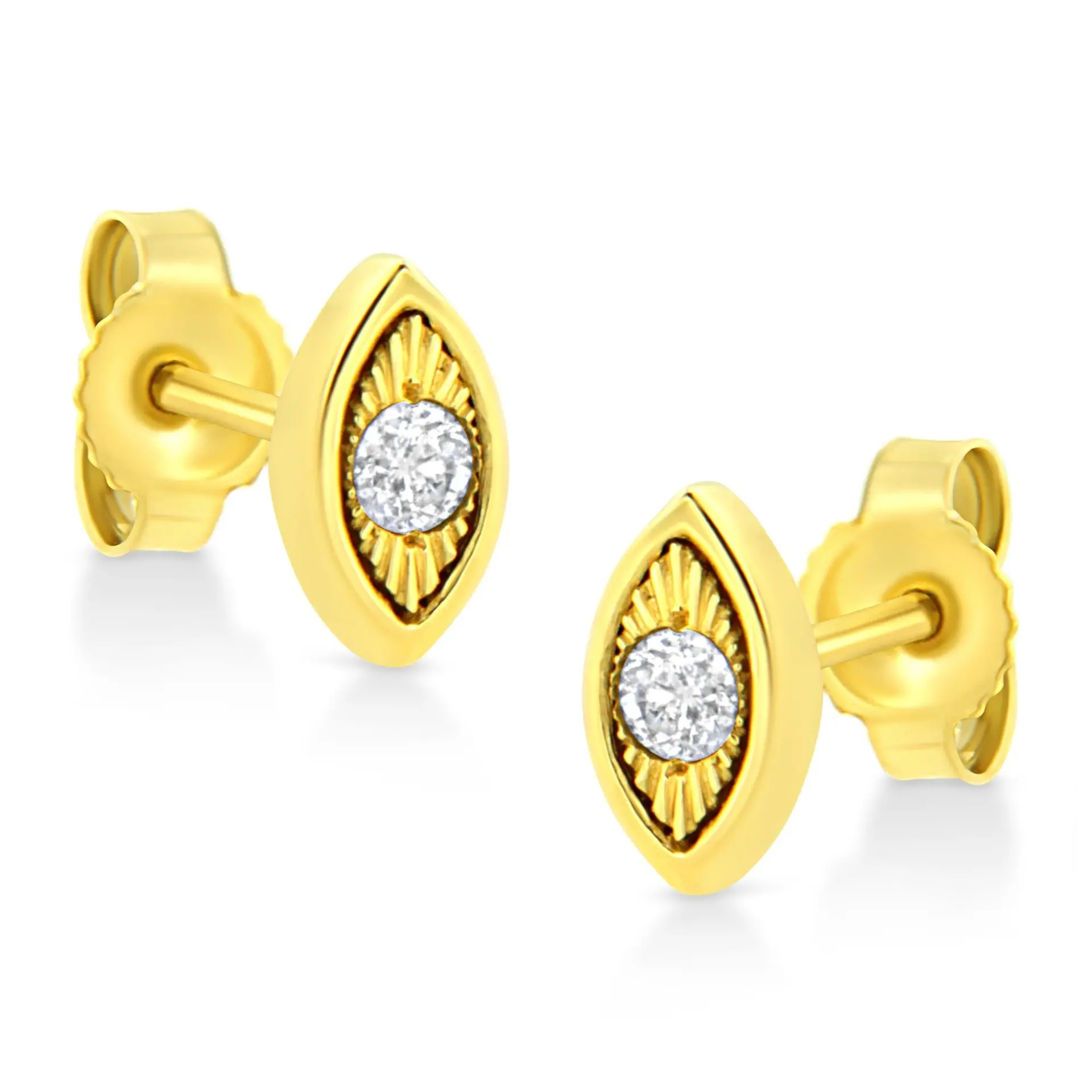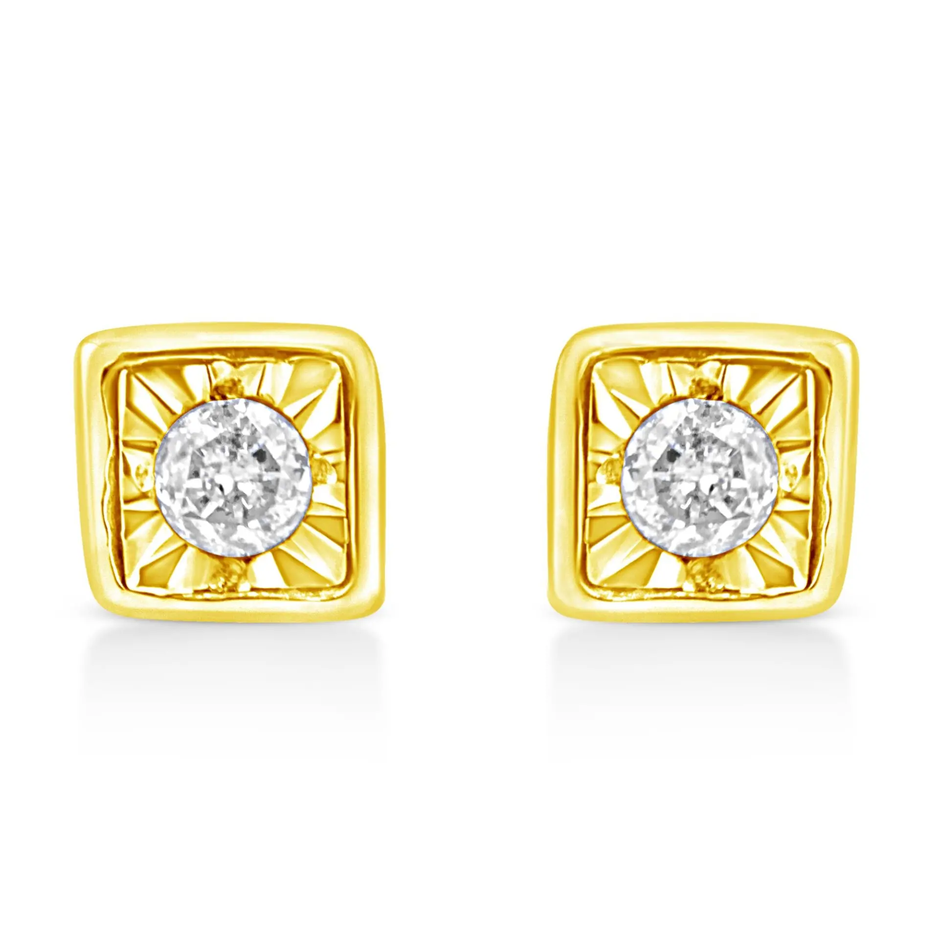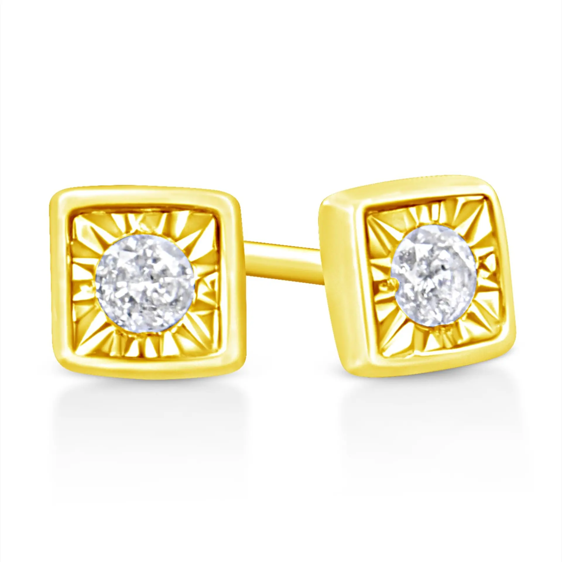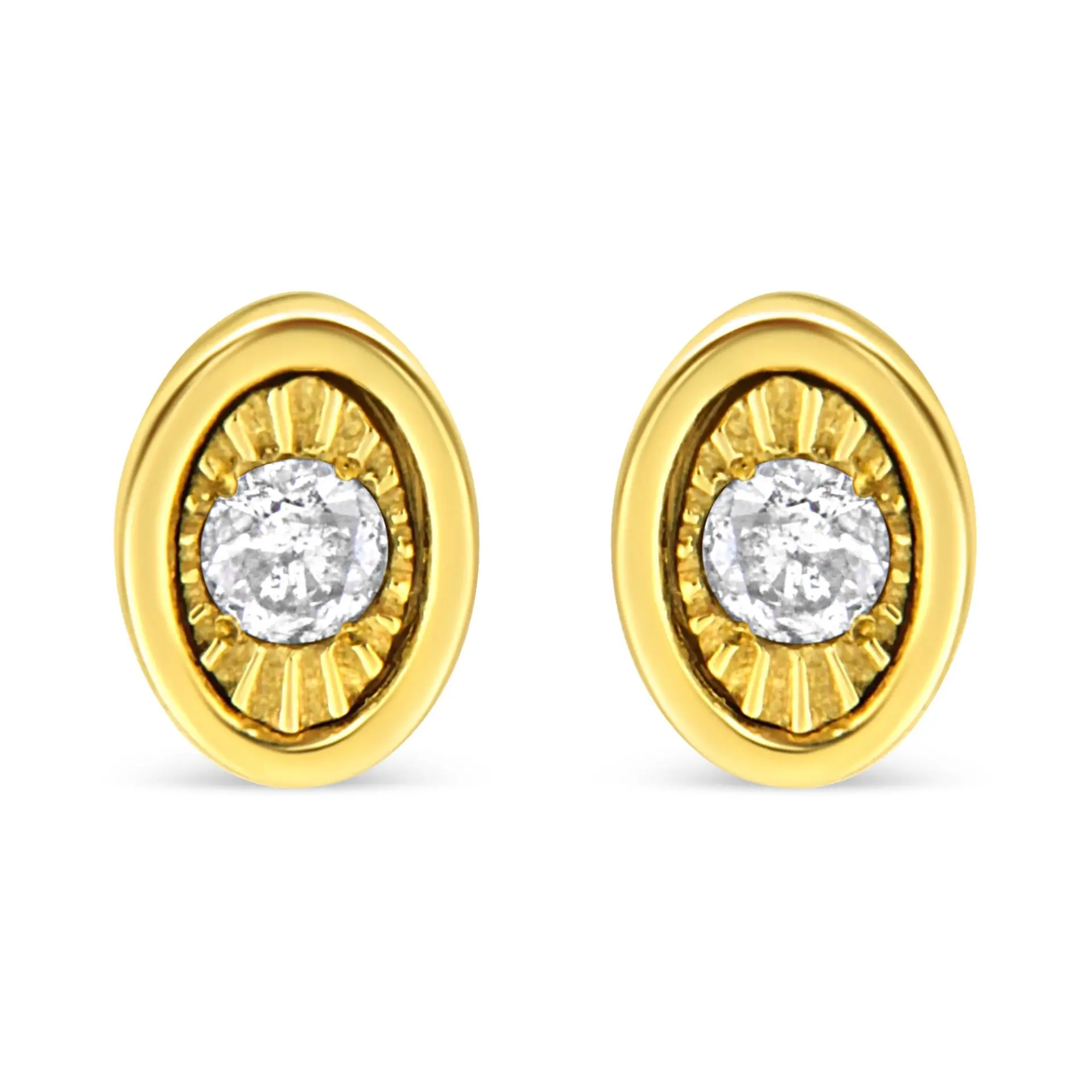 These circle shaped stud earrings are crafted in 10k yellow gold plated sterling silver and feature 1/10ct TDW of diamonds. Each earring features a single sparkling round cut diamond in a miracle setting that adds to the earrings sparkle. A polished warm yellow gold ribbon creates a frame around the earring. These studs secure with a push back mechanism.