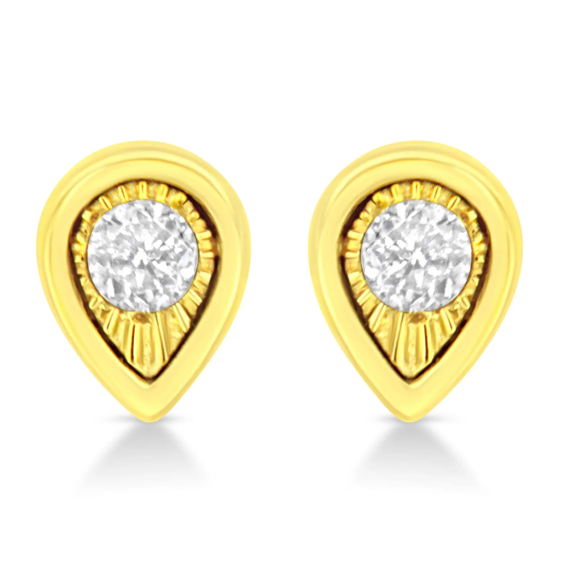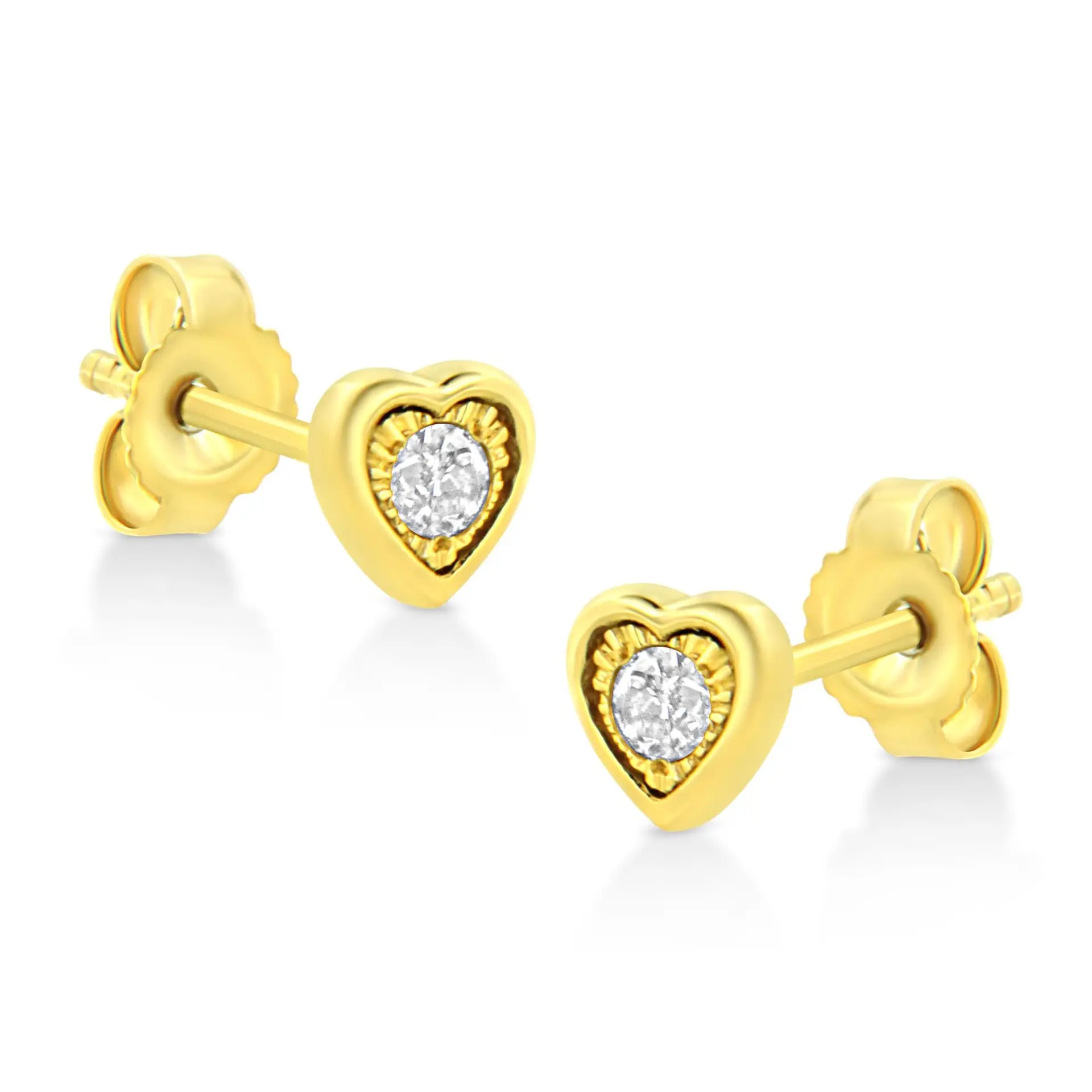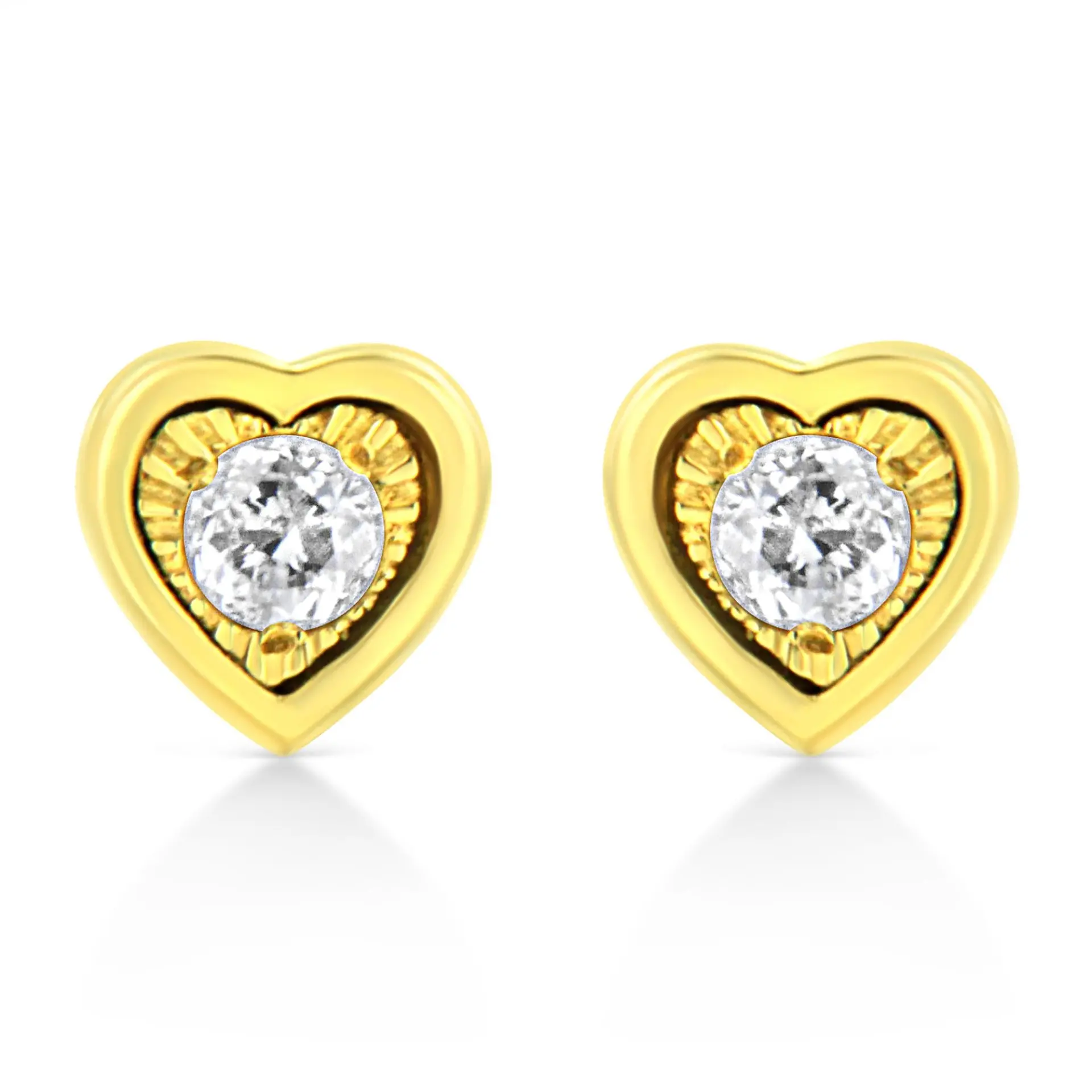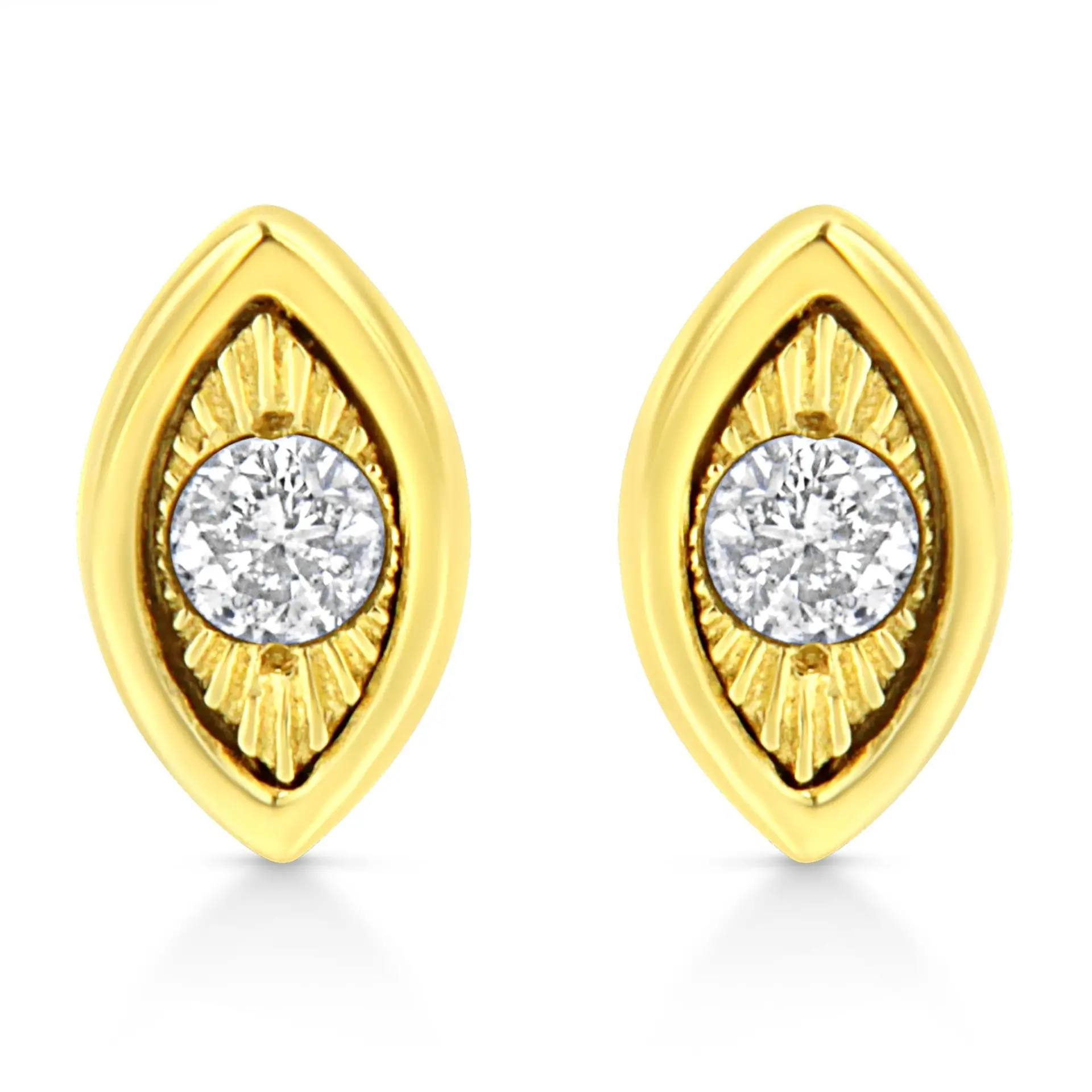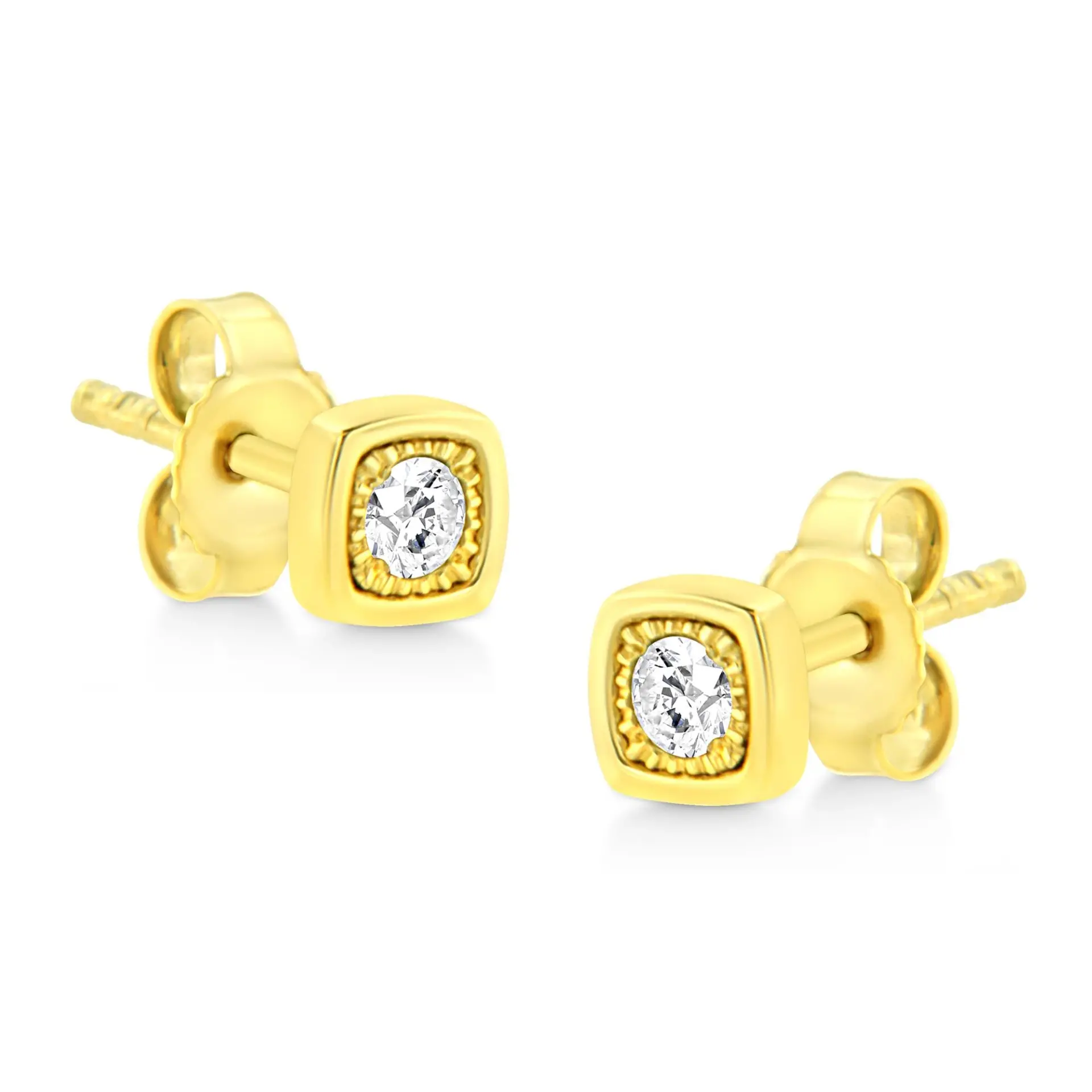 These circle shaped stud earrings are crafted in 10k yellow gold plated sterling silver and feature 1/10ct TDW of diamonds. Each earring features a single sparkling round cut diamond in a miracle setting that adds to the earrings sparkle. A polished warm yellow gold ribbon creates a frame around the earring. These studs secure with a push back mechanism.