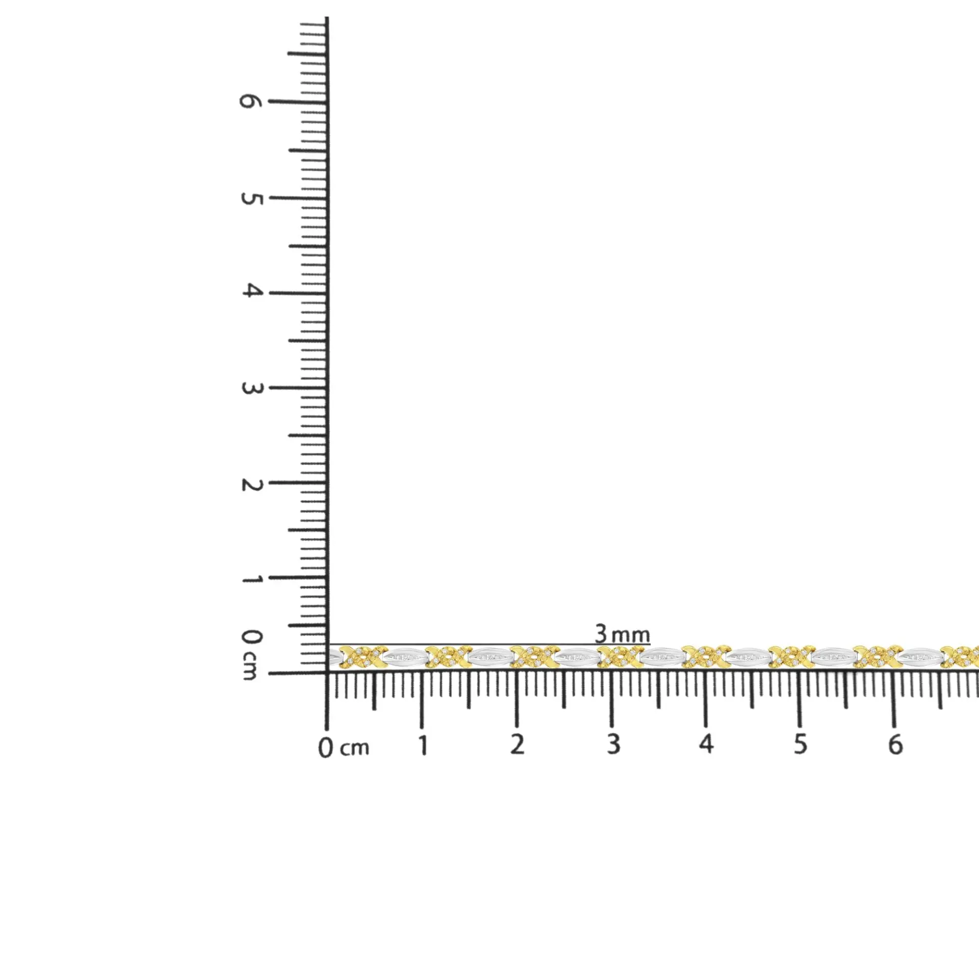 Two round cut diamond studded yellow gold ribbons make a braided shaped link that interlocks with a white gold almond shape that holds at the center a single diamond flanked by a beaded design. This stunning 10k yellow and white gold plated sterling silver link bracelet holds 1/2ct TDW of sparkling diamonds. The design secures with a box with clasp mechanism.