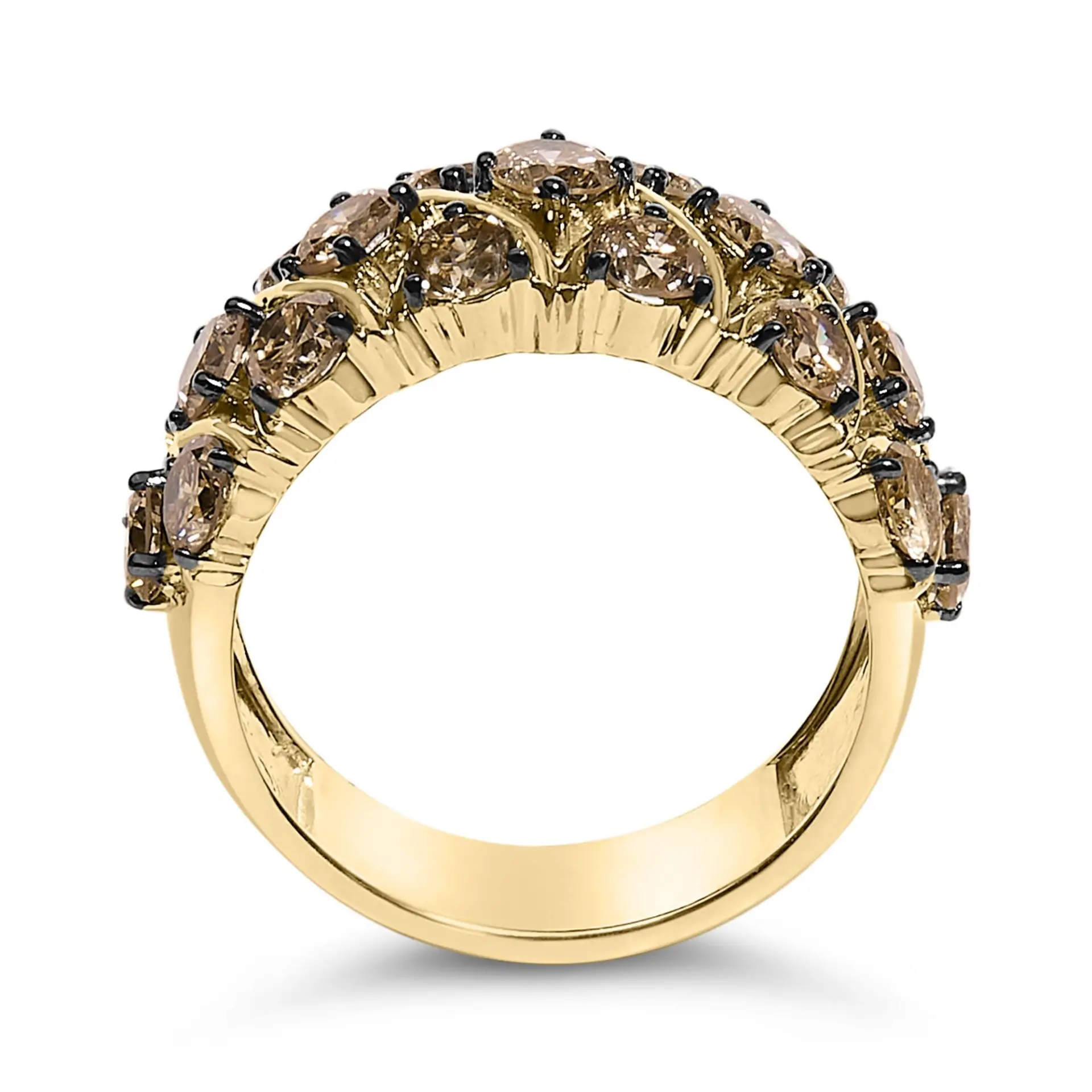Crafted from the finest .925 sterling silver and bathed in a lush 10K yellow gold plating, this exquisite ring promises to captivate with its rich, radiant warmth. Nestled within the intricate multi-row lattice design, natural champagne diamonds, totaling 3.0 carats, sparkle with unmatched brilliance. Each round-cut gem is meticulously secured by black rhodium-plated prongs, emphasizing their deep, intoxicating hues and creating a striking contrast against the golden glow. The sweeping arcs of the trellis-like structure encapsulate an elegance that’s both timeless and modern, making this piece an ideal symbol of love or a fine addition to any sophisticated jewelry collection. The natural origins of these diamonds add an authentic charm to this exceptional ring, destined to enchant and inspire.