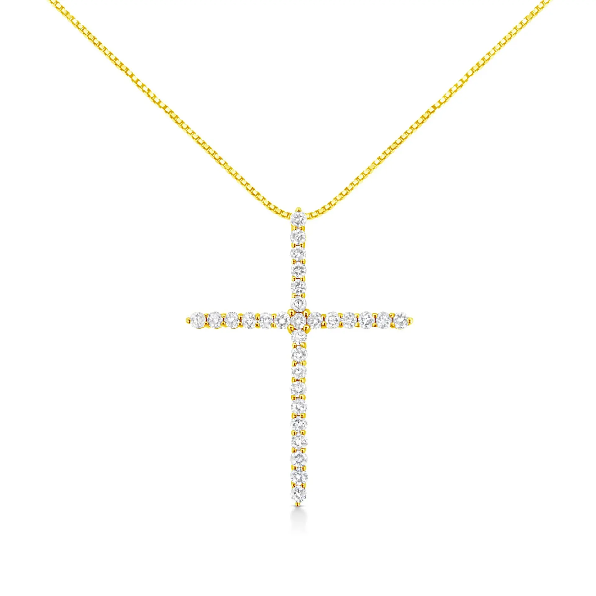 Share your faith with this stunning diamond cross pendant necklace. This cherished cross necklace for her, features 29 natural, round-cut diamonds set in 10k Yellow Gold Plated Sterling Silver. The pendant is suspended from an 18-inch box chain with spring ring. This fine jewelry cross necklace has a total diamond weight of 3.00 carats and is a contemporary classic. Color grade range is J-K and the clarity grade ranges from I2-I3.