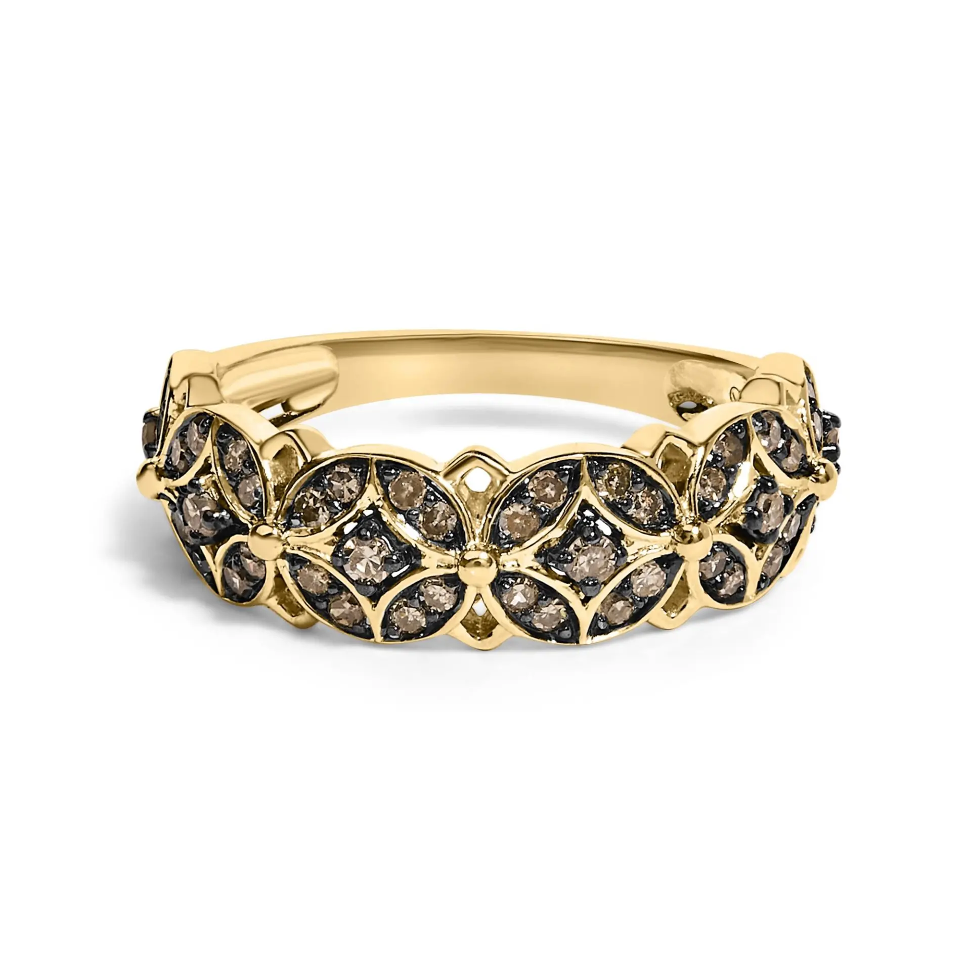 Discover the subtle elegance embodied in this exquisite band that melds the rich allure of 10K yellow gold-plated .925 sterling silver with the enchanting luminescence of natural champagne diamonds. Expertly crafted, this piece features a sophisticated lattice design of marquise-like shapes, each delicately outlined in warm gold and meticulously filled with brilliant round-cut champagne diamonds. A touch of black rhodium detailing magnificently enhances the diamonds’ radiant hue and sparkle, creating a contrast that captures the eye and captivates the heart. Whether as a symbol of love or a treat to oneself, this ring promises to be a timeless addition to any jewelry collection, bringing with it a touch of class and a whisper of romantic decadence.