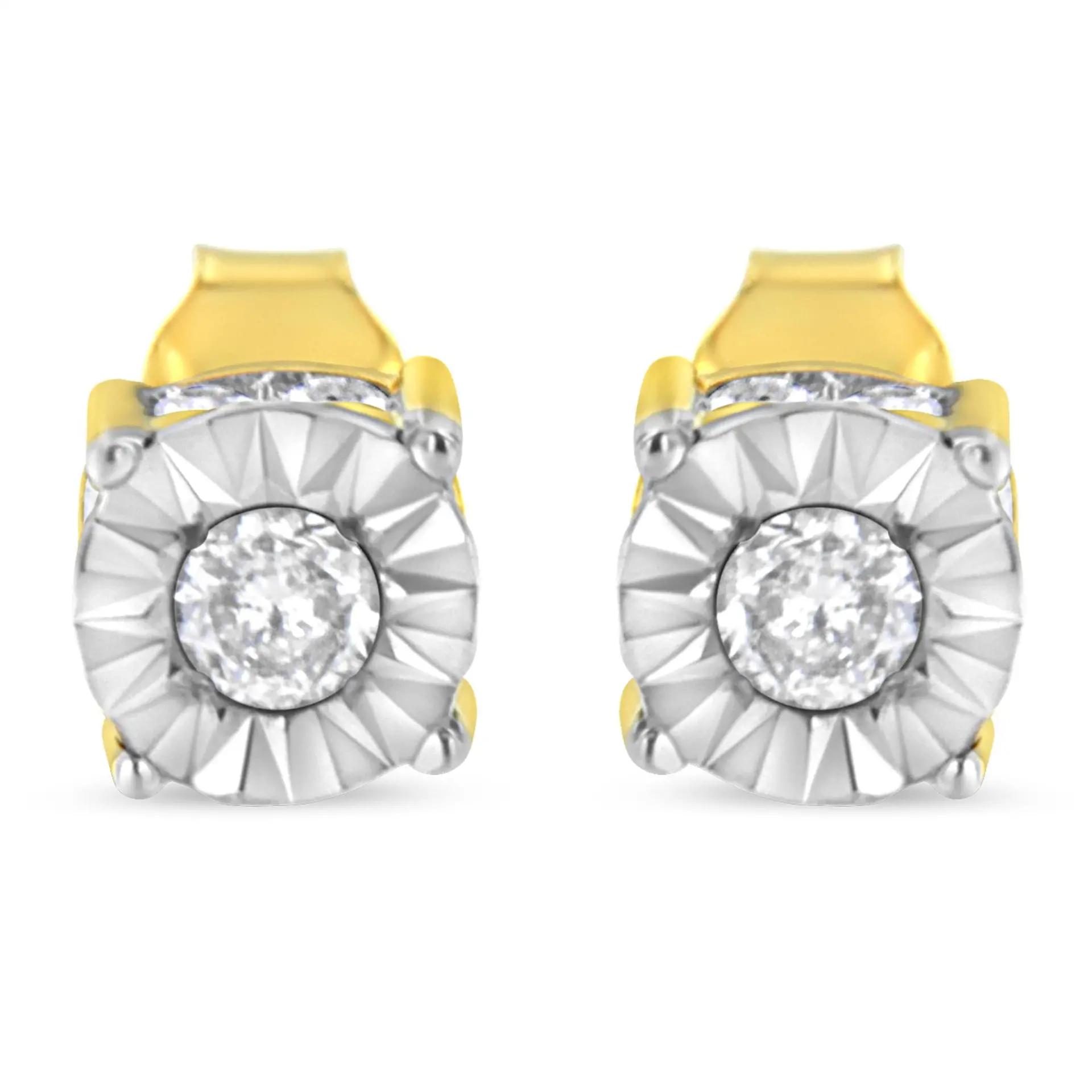 You’ve found your everyday wear accessory with these beautiful 10k yellow gold plated .925 sterling silver studs embellished with natural, sparkling diamonds. Each earring is set with a round-cut diamond in a miracle plate setting, while the inner component of the piece is studded with smaller round-cut diamonds for that extra sparkle. The push back mechanism keep these pierced earrings safe and secure on your ears for comfortable, worry-free wear all day long. You can’t go wrong with these timeless 1/2 cttw earrings.