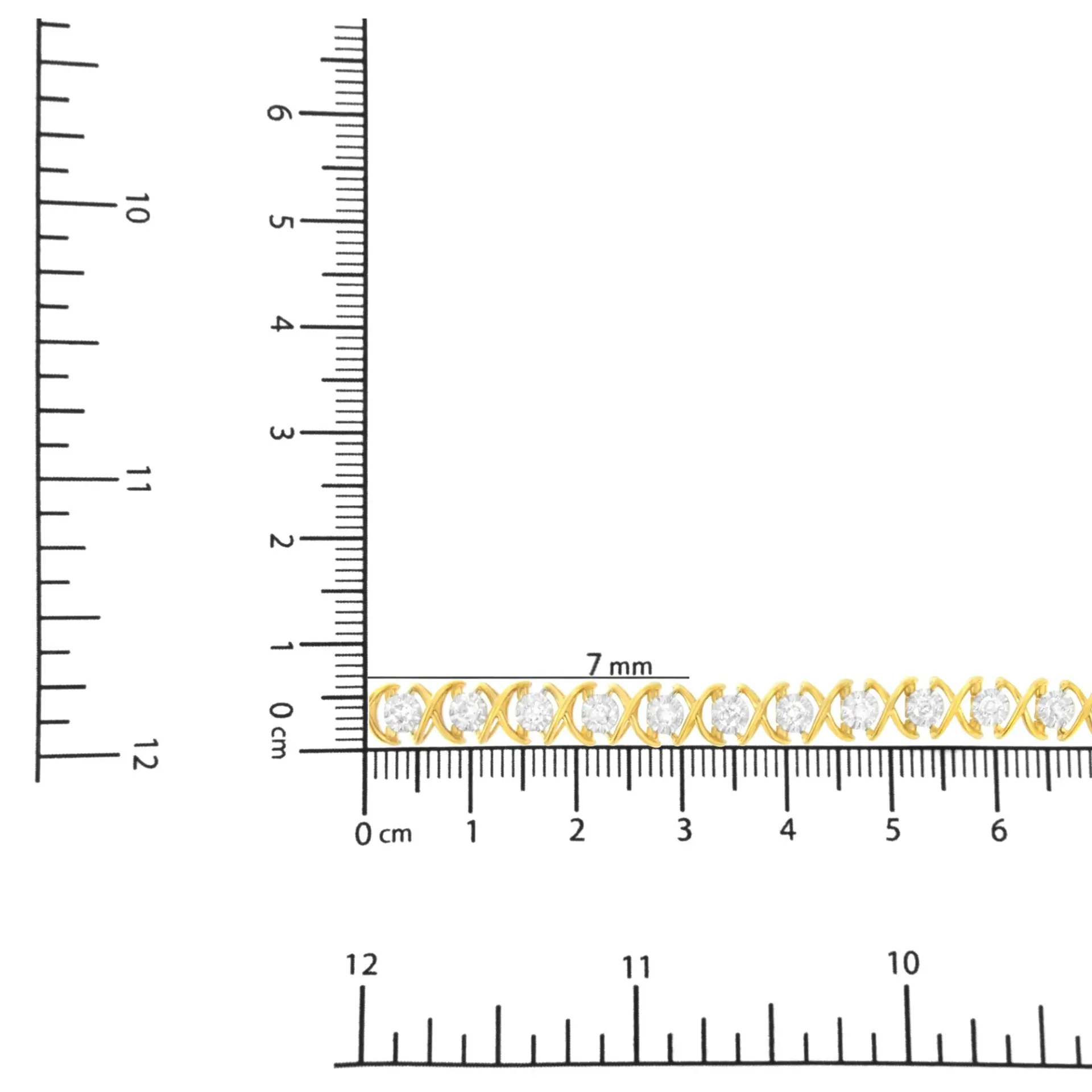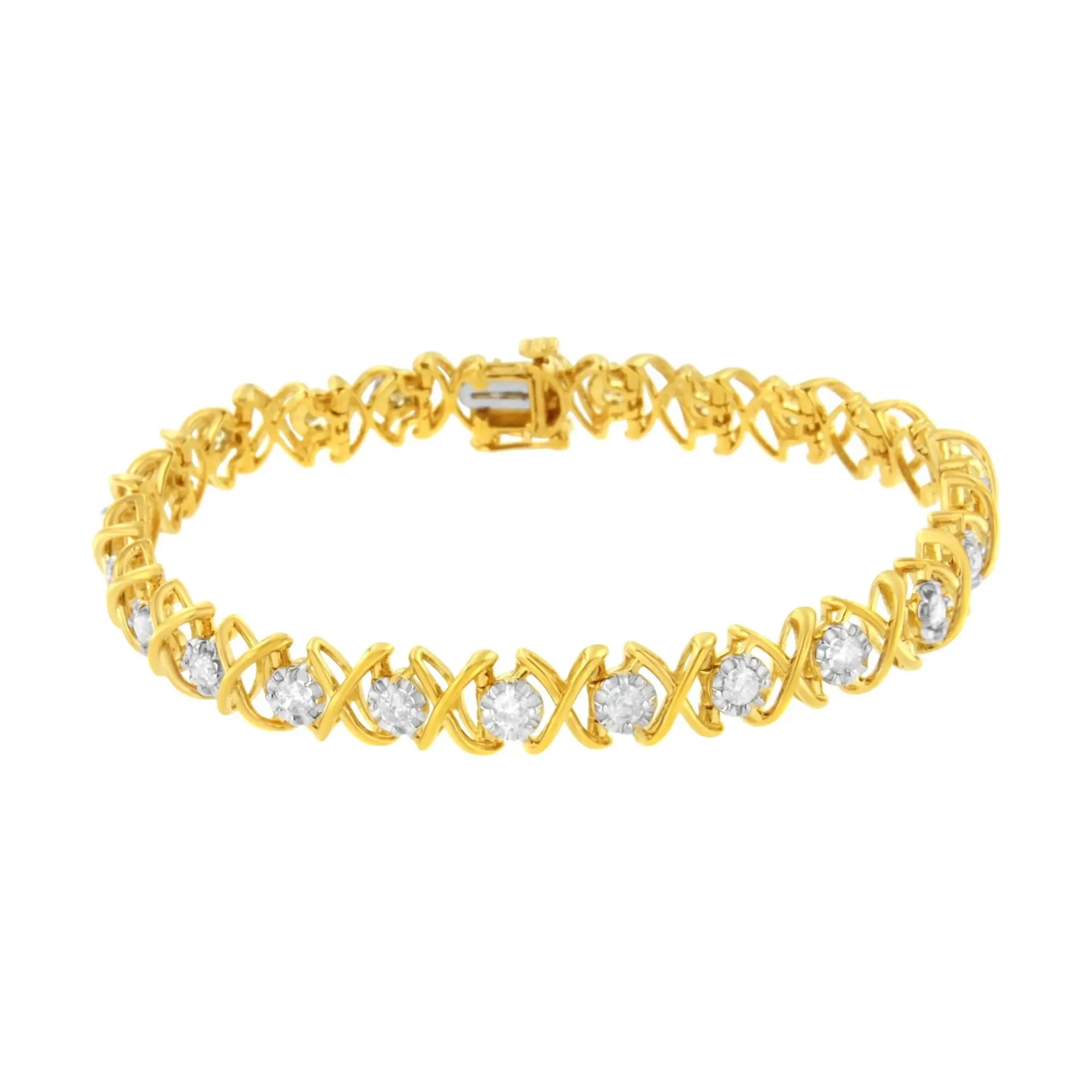 This stunning diamond bracelet has a unique “XOXO” design with an alternating pattern of 10k yellow plated sterling silver “x” links and round-cut diamonds. This dazzling piece is embellished with 2 carats of natural, prong-set diamonds. Whether for a fancy night out or a casual day in the sun, this diamond bracelet is perfect for any occasion.