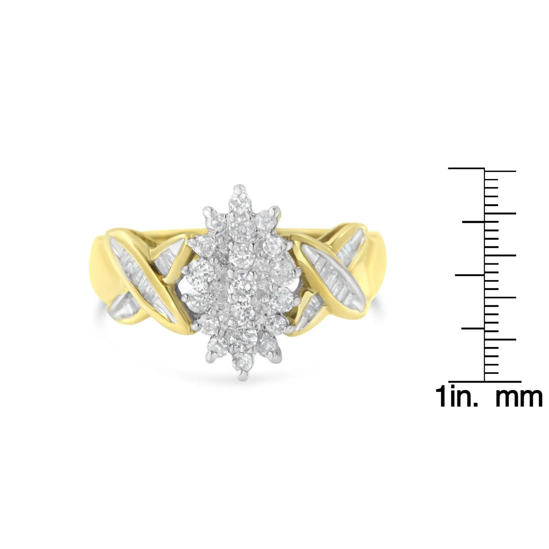 Let yourself be dazzled by this 1/2ct TDW diamond ring. Glittering round cut diamonds create a star like center cluster. Two X shapes inlaid with channel set, baguette cut diamonds hold the design in place. Crafted in 10k yellow gold this is a ring you will love to show off.
