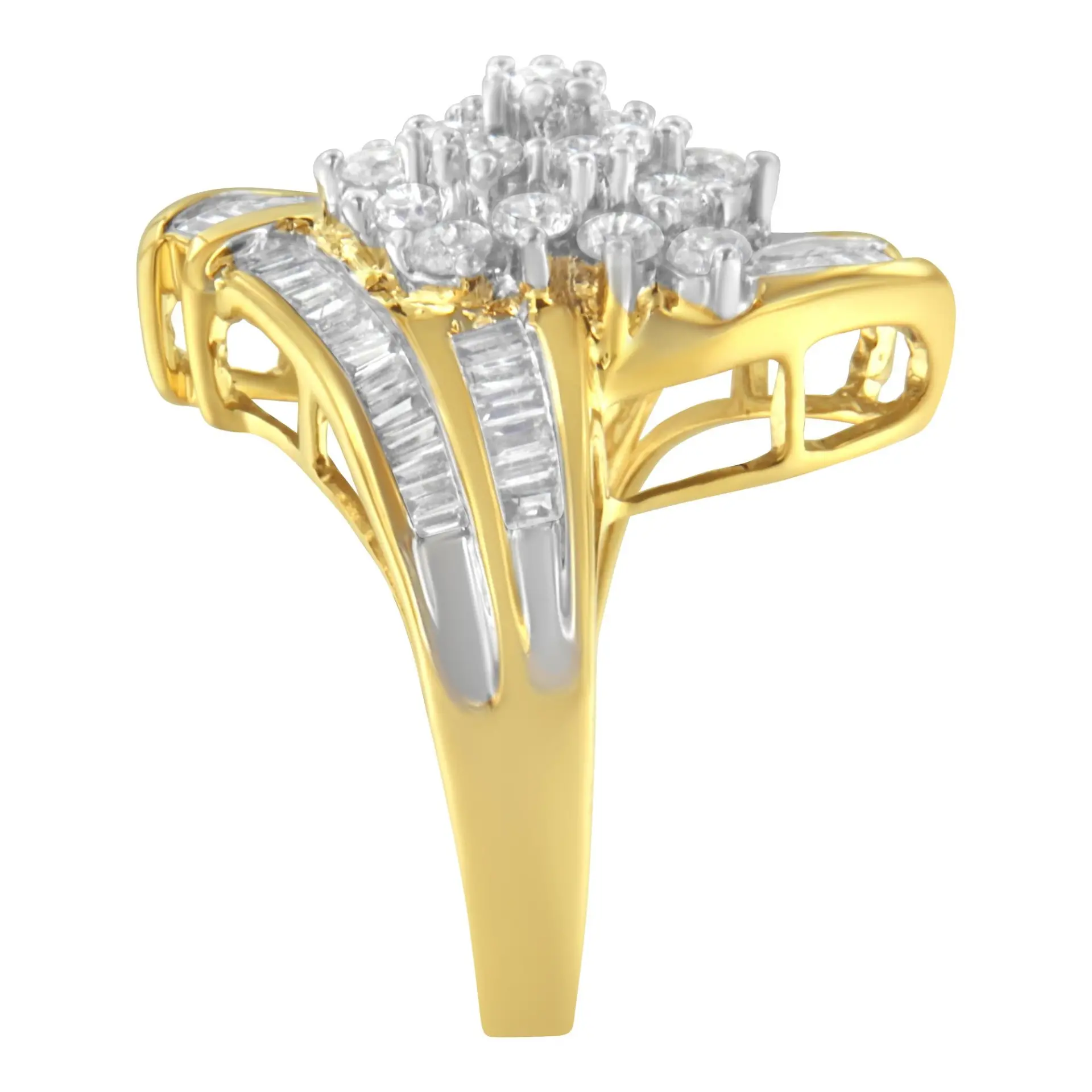 Elegant 10KT gold ring with gorgeous natural diamonds. The round- and baguette-cut stones sparkle beautifully in a prong setting. The chic design is sure to stand the test of time and works as a fashion piece, promise ring or anniversary gift.