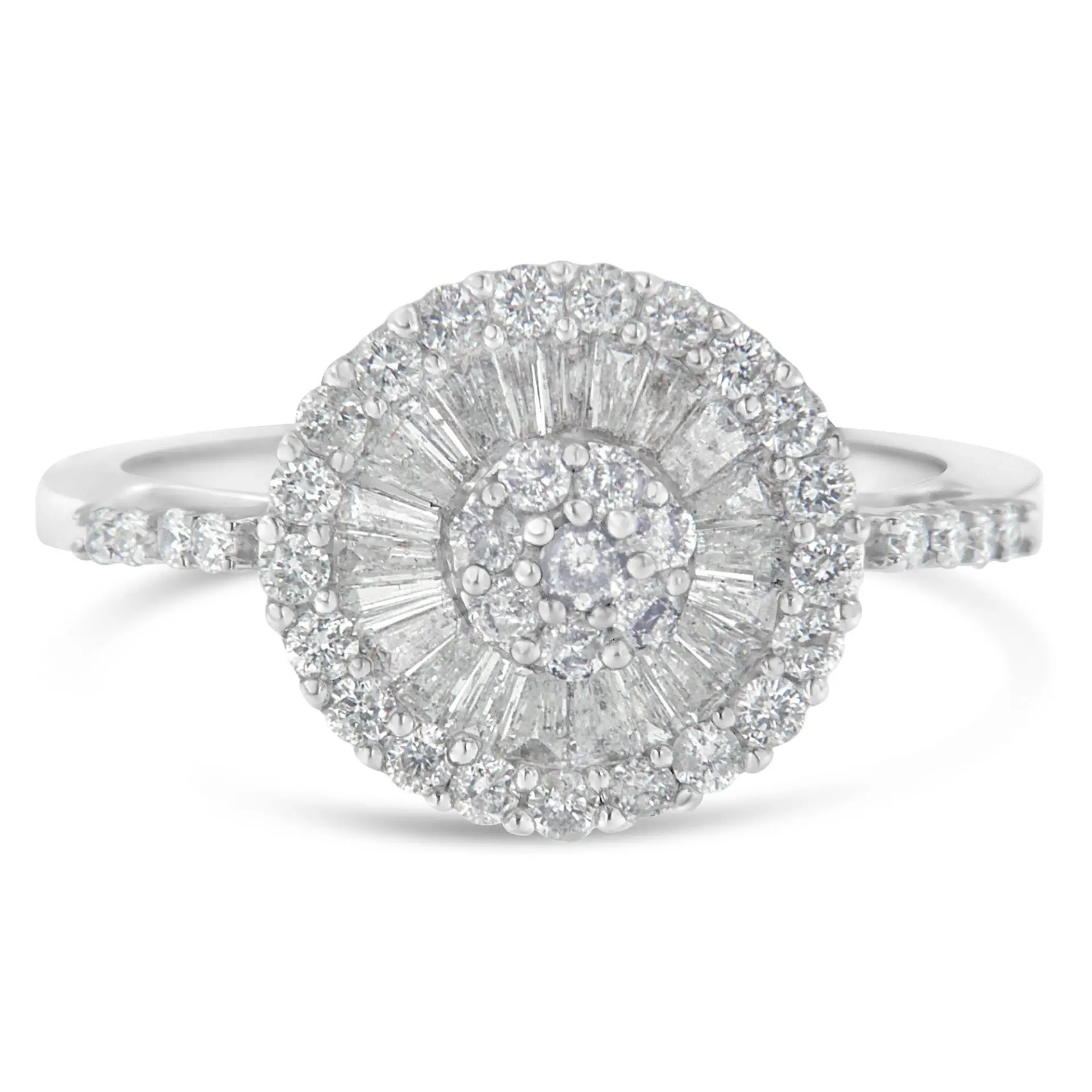 A diamond cocktail ring featuring a cluster of round diamonds surrounded by a baguette halo and a round diamond halo. The thin band set with round diamonds add extra glimmer to this delicate design. It has a total diamond weight of 1 carat.