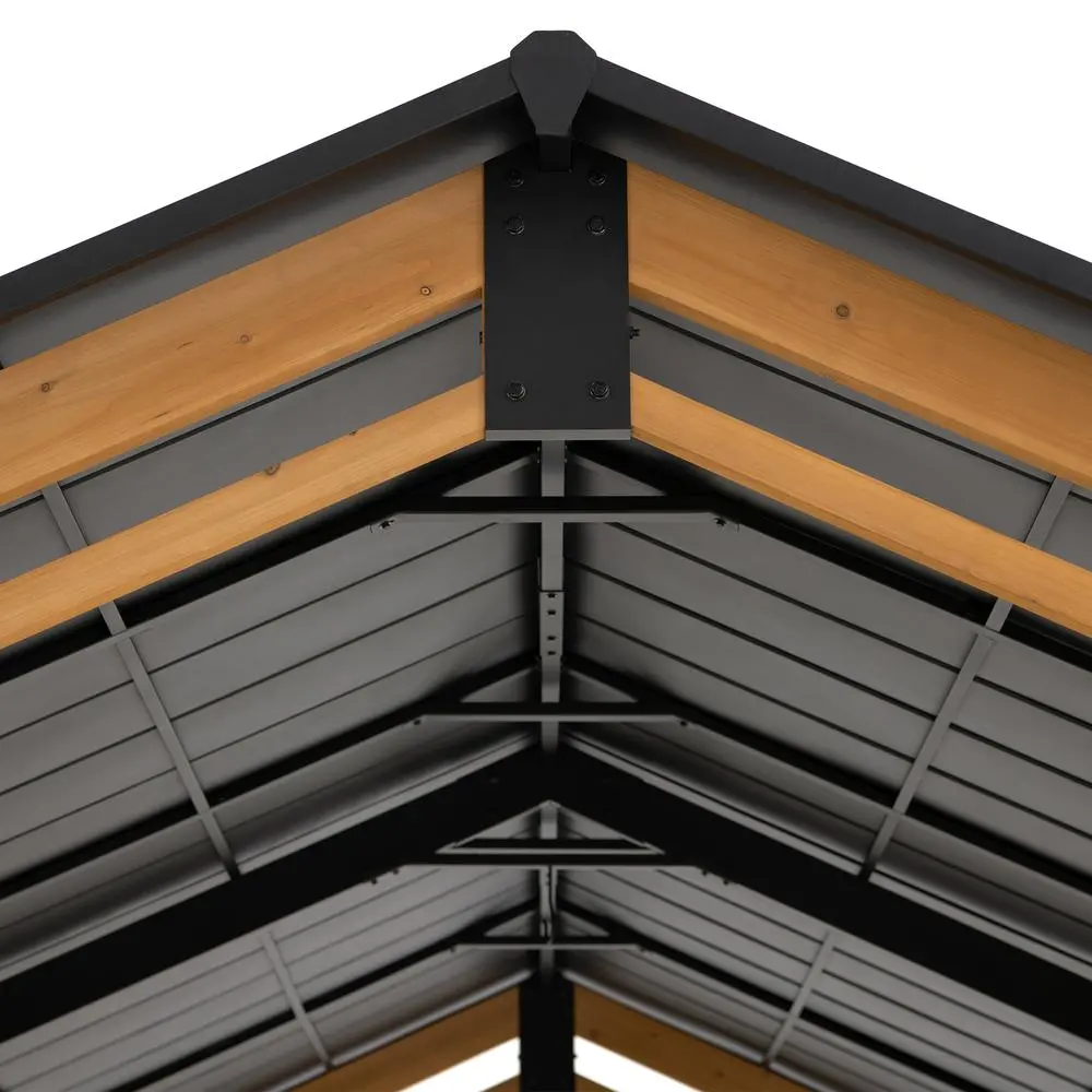 Protect your vehicles, boat, trailers, etc. from damaging sun rays, hail, rain, or snow with this 11×20 ft. wood carport. Made from a premium cedar wood frame with a powder-coated steel gable rooftop this structure will last the test of time and require very little maintenance. Enjoy a refuge from the elements and use it as a gazebo for entertaining as an alternative to a garage. The design is a great complement to almost any home architecture.