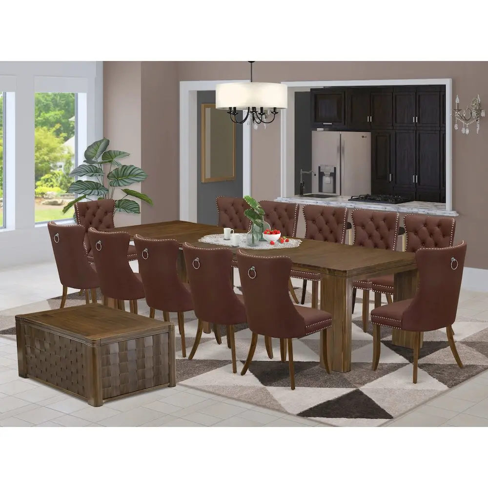 Explore Luxe by East West Furniture, our exclusive premium furniture brand, and experience its unmatched elegance. Luxe by East West Furniture Introducing this 14-piece dining set, which comprises 12 dining chairs, 1 coffee table, and an expandable dining table. This thoughtfully curated collection exemplifies exceptional versatility, making it suitable for various settings. Presenting an extendable table featuring an Antique Walnut tabletop and legs, it beautifully mirrors the refined Antique Walnut Finish of the coffee table. The dining chairs, upholstered in Light Gray Faux Leather, not only offer comfort but also seamlessly coordinate with the matching Antique Walnut legs, ensuring a consistently stylish appearance throughout the entire set. This meticulously crafted extendable dining set is skillfully constructed from durable Acacia hardwood, guaranteeing years of reliable service. The use of resilient Acacia hardwood not only ensures the set’s longevity but also preserves its unique and appealing aesthetics over time. The modern dining set includes sophisticated dining chairs with top-quality faux leather seats. These cushioned chairs feature a meticulously designed stylish backrest that offers exceptional support, ensuring comfortable and extended conversations.