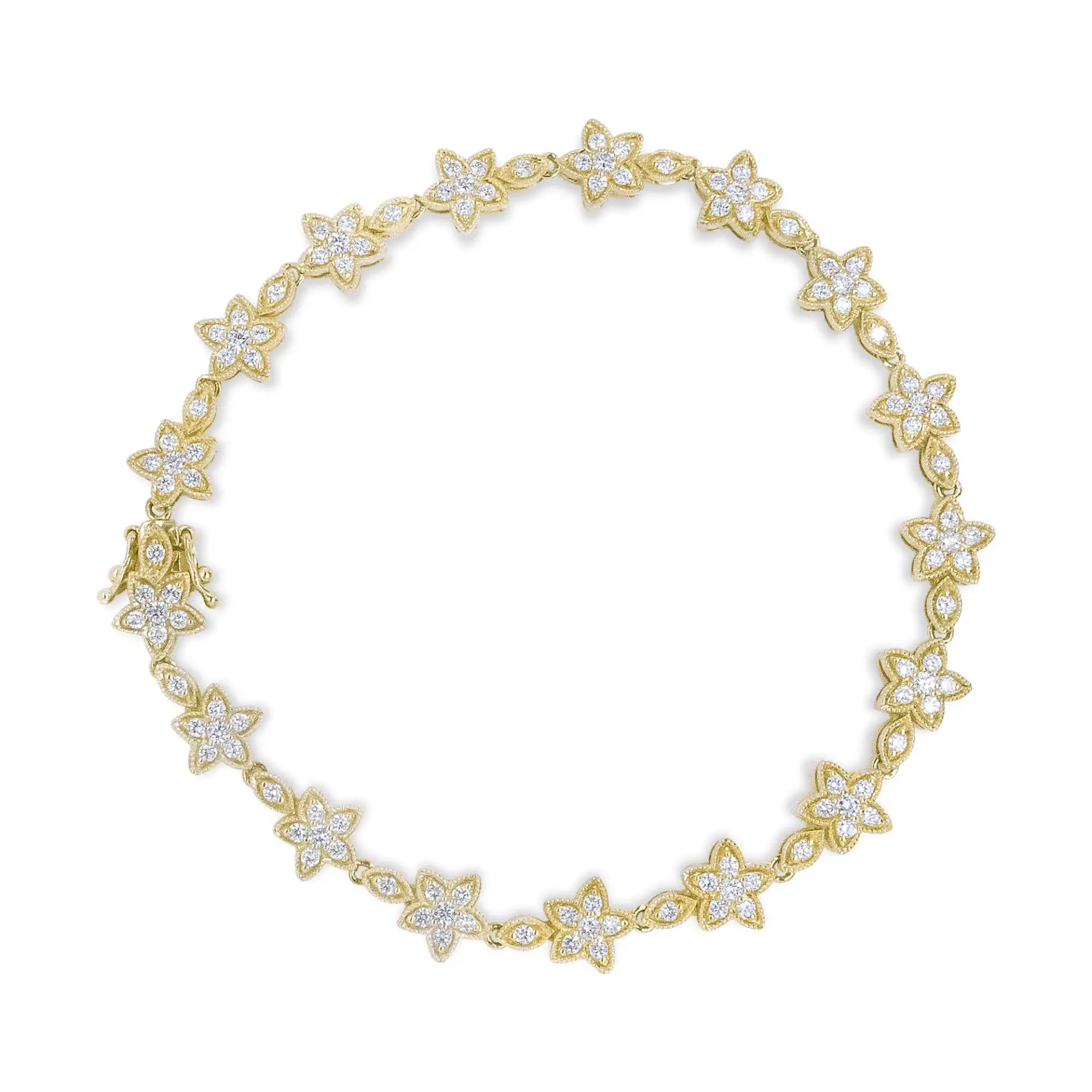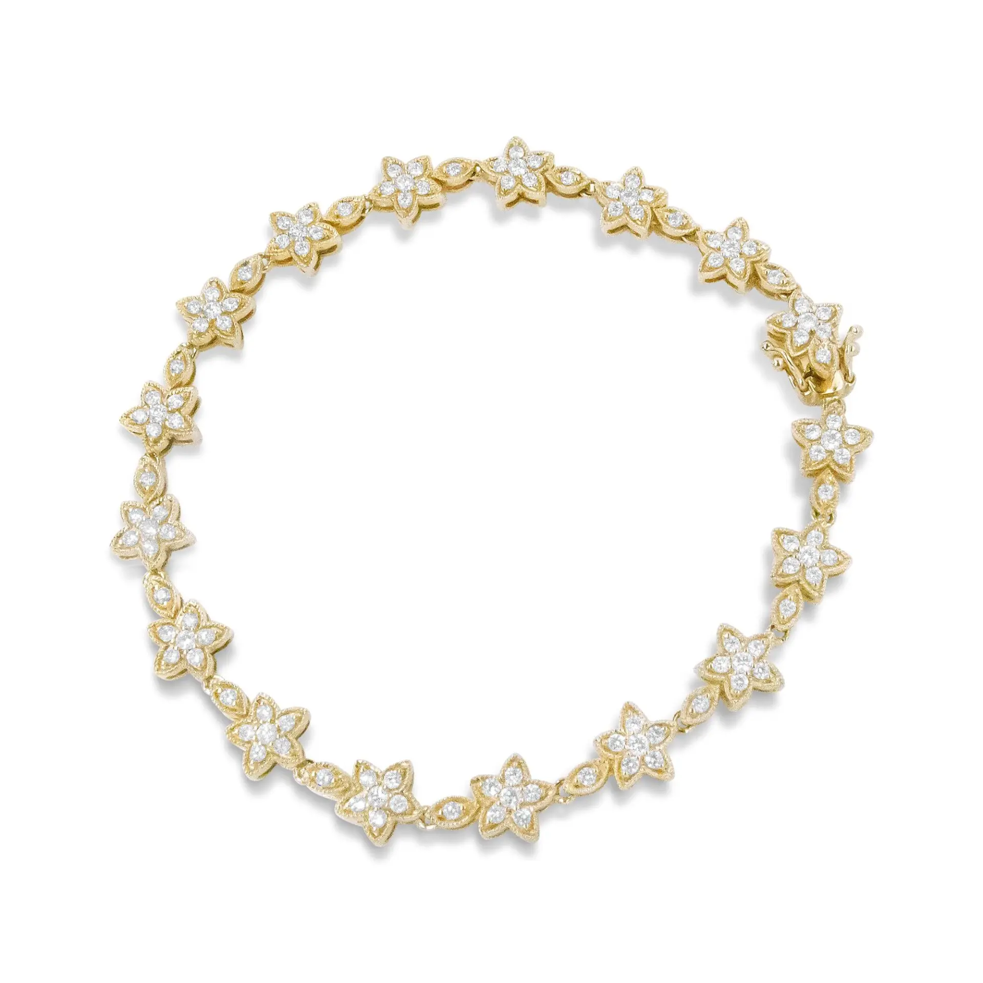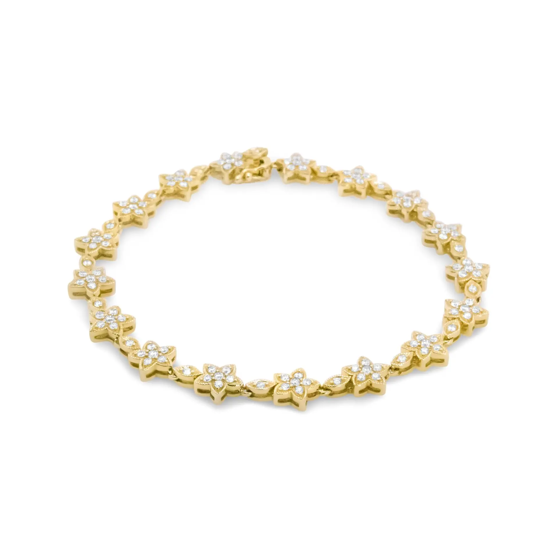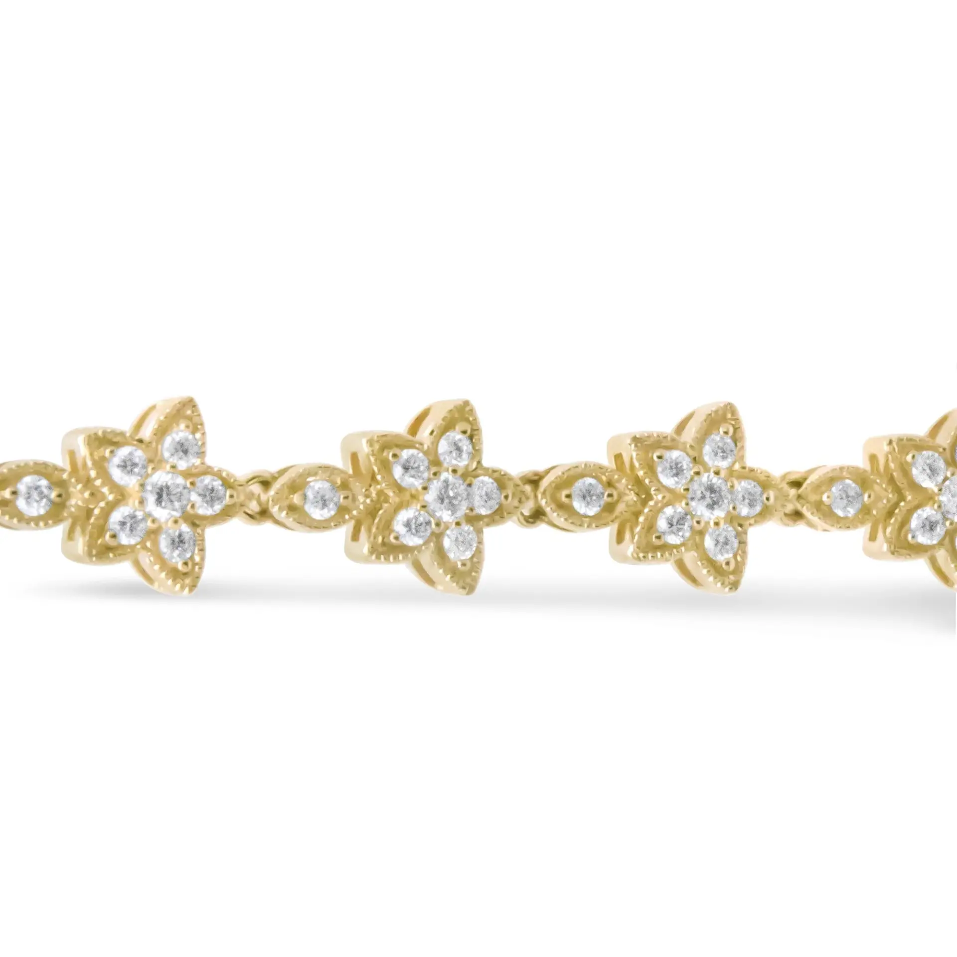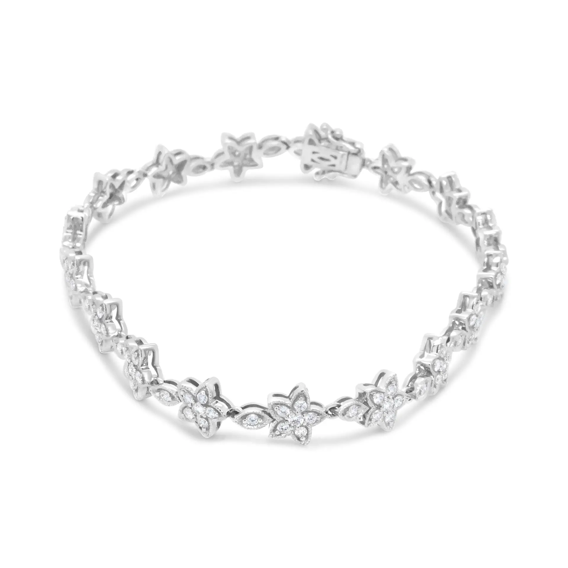 Wear the romance of a moonlit garden on your wrist with this gorgeous link bracelet featured 14k white gold with brilliant white diamonds arranged in prong settings. This fashion bracelet is arranged in a flower blossom silhouette, with diamonds that total 1 1/5 cttw that are of an approximate H-I Color and SI1-SI2 Clarity. Marquise-shaped links separate each floral link, creating a wondrous ornamentation for your wardrobe. This bracelet fastens securely with a box with clasp. It is 7 inches long, best for small and medium sized wrists.